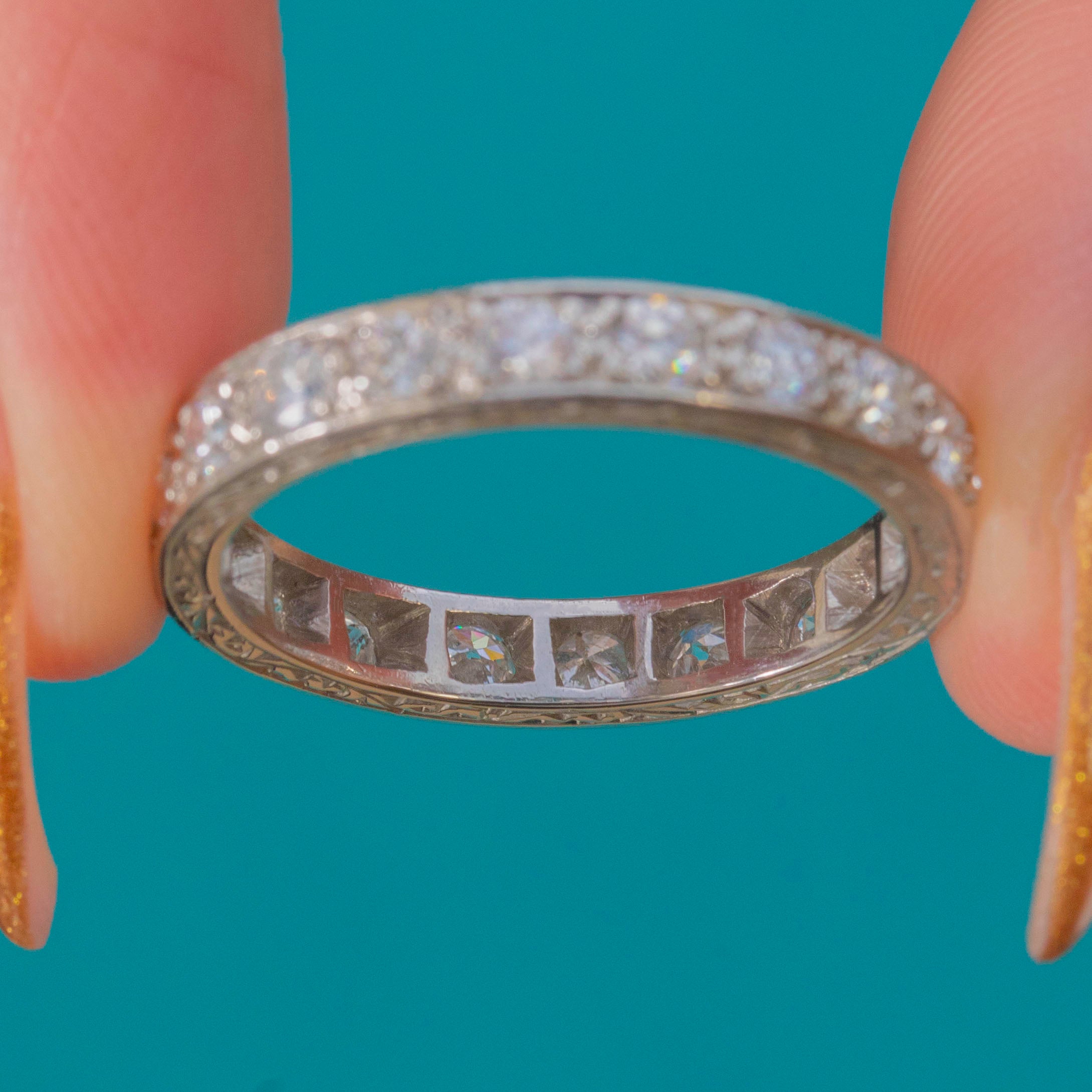 This spectacular Art Deco Platinum eternity ring shimmers with 1.60 carats of bright, white old European-cut Diamonds set all the way around. Each hand-cut stone radiates with vintage brilliance, creating a seamless band of light and luxury. The Diamonds are well-matched in colour and clarity, highlighting the exceptional craftsmanship of the 1930s.