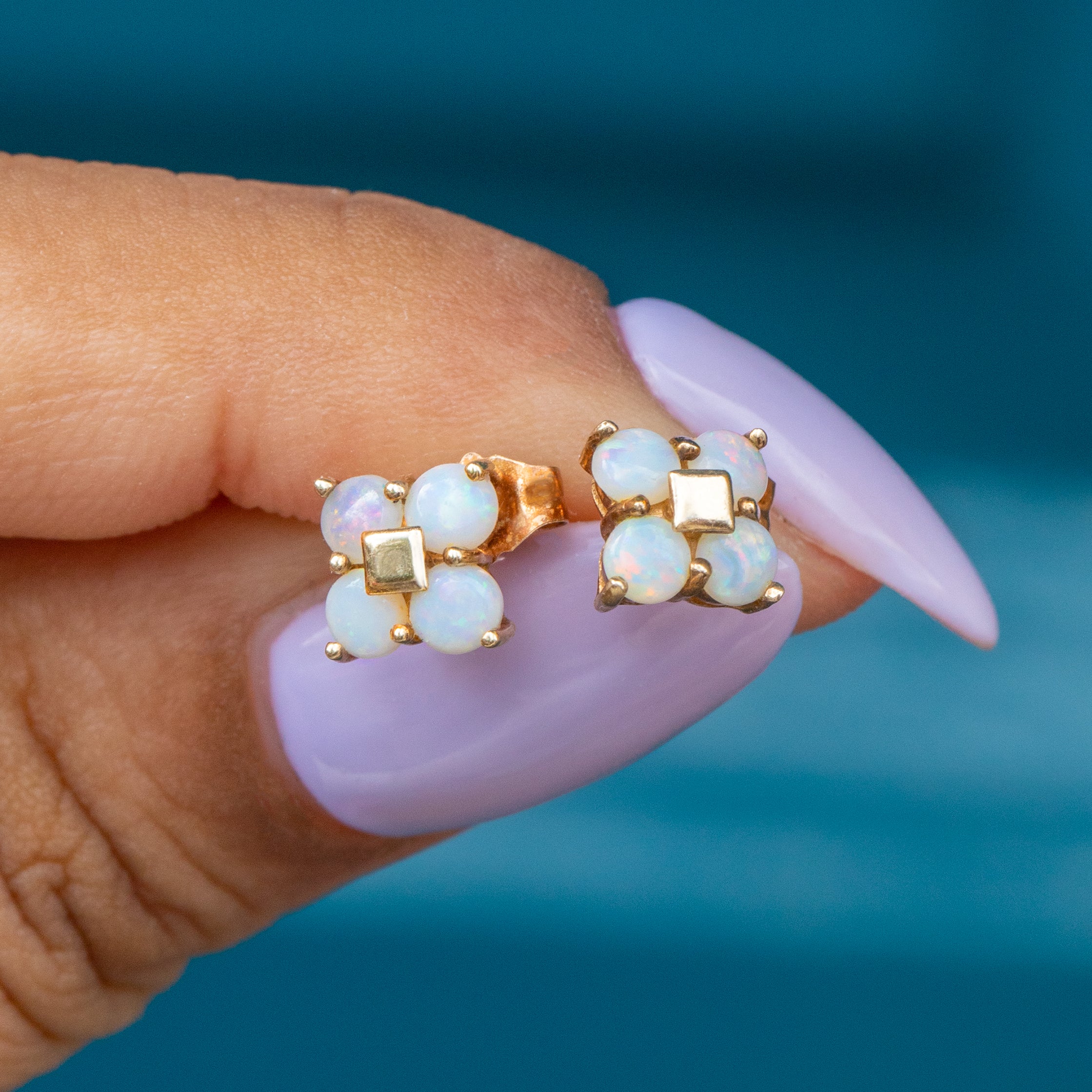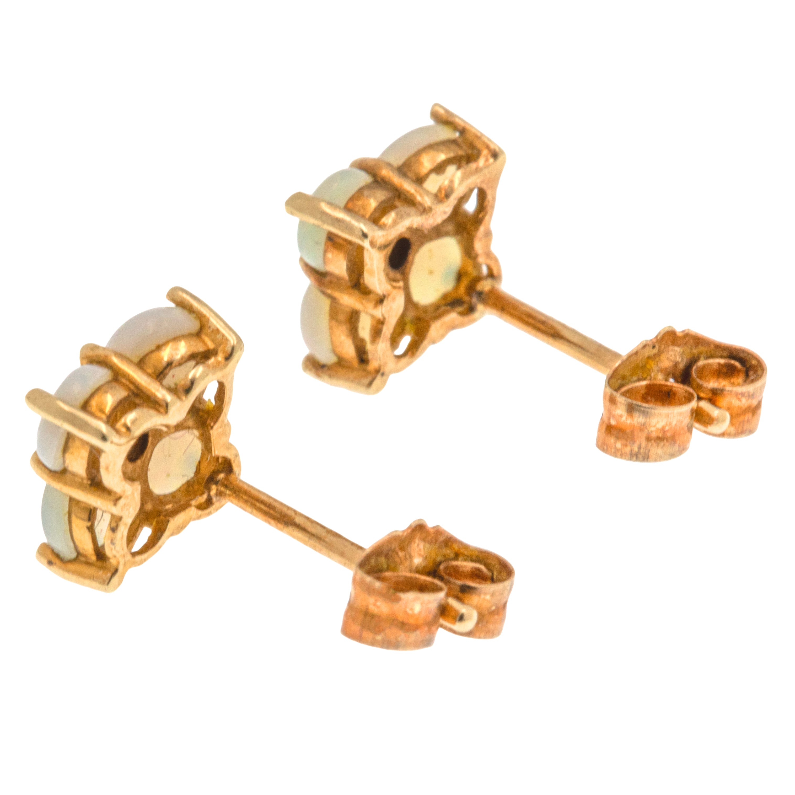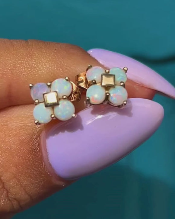 EXCELLENT. With securely set smooth Opals, perfectly formed yellow Gold, and tight-fitting butterfly backs, these 10ct Gold Opal flower cluster stud earrings are in excellent condition! The Opals are a dainty delight, and look gorgeous against the buttery 9ct Gold. With 9ct Gold butterfly backs you can wear these earrings with absolute confidence.