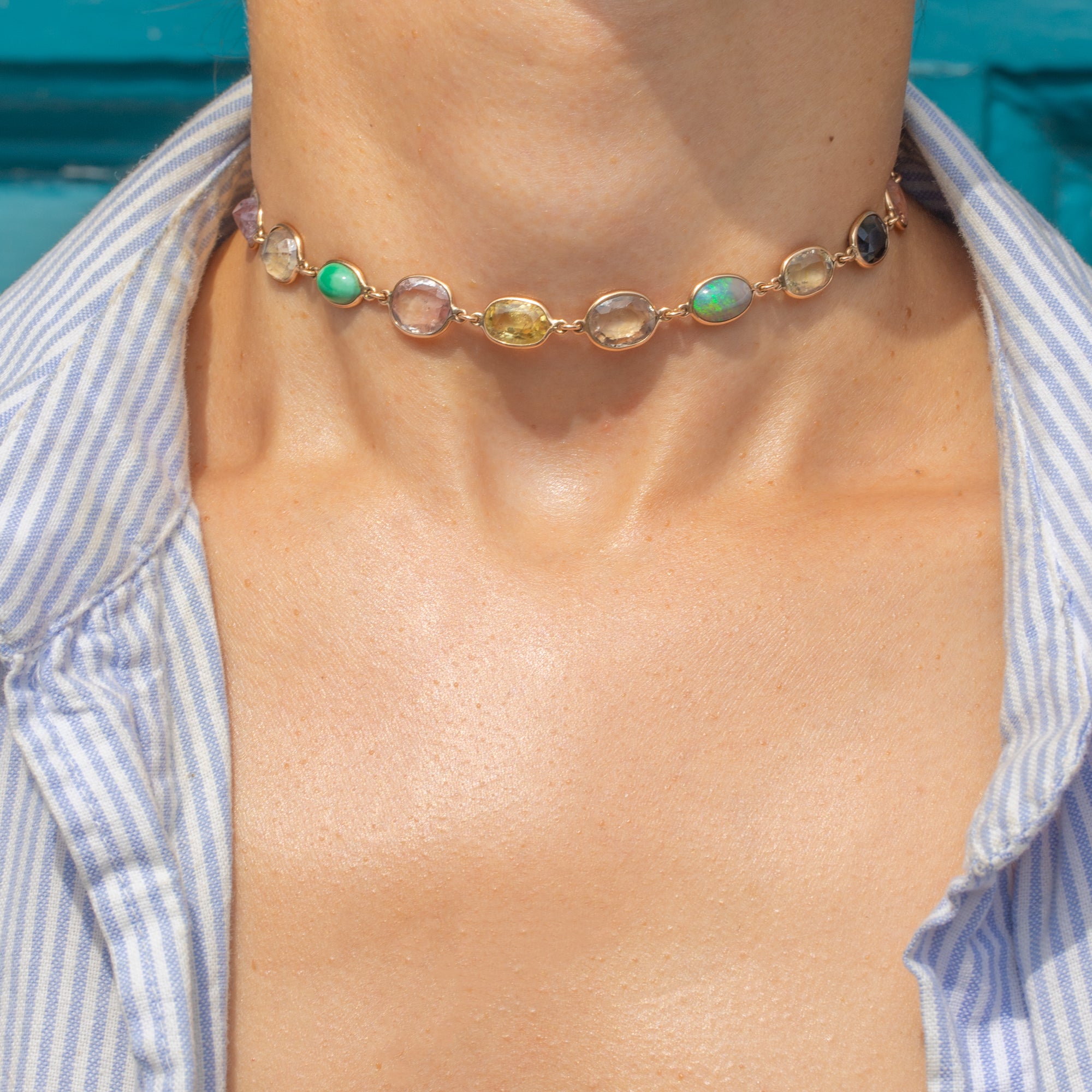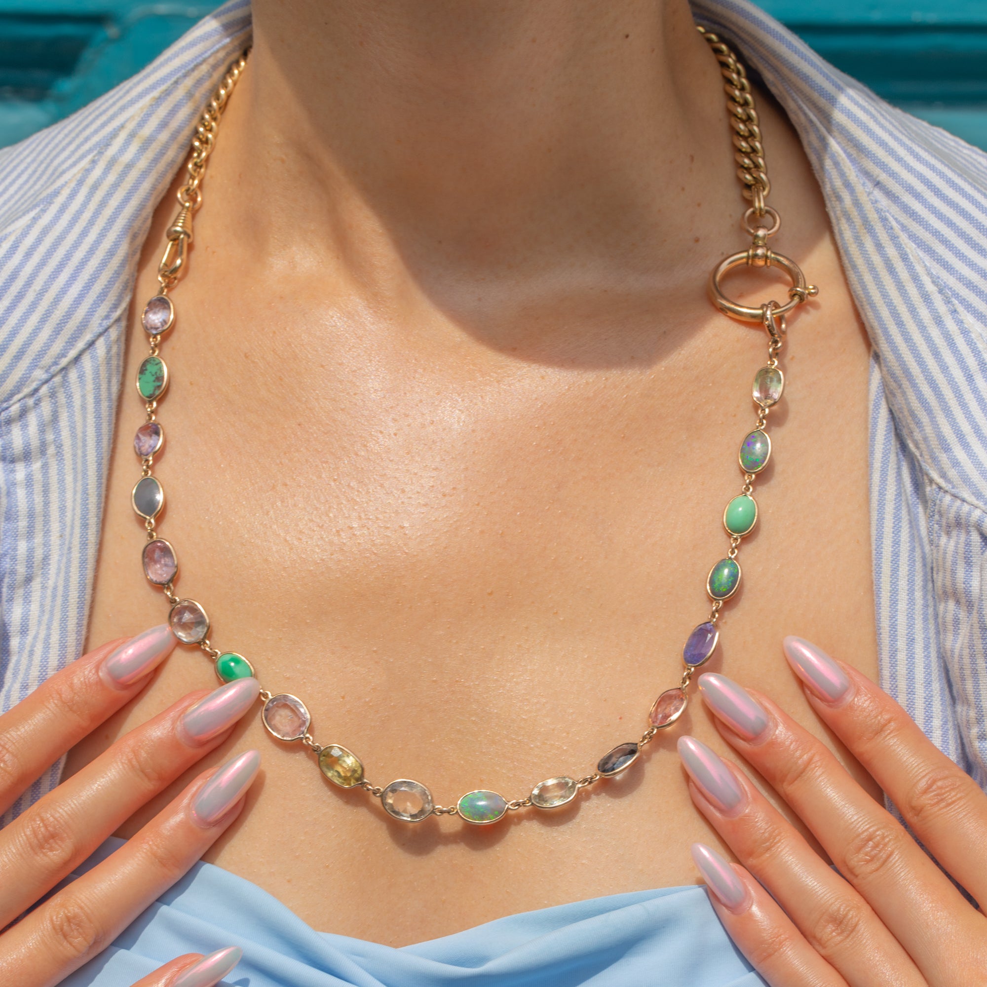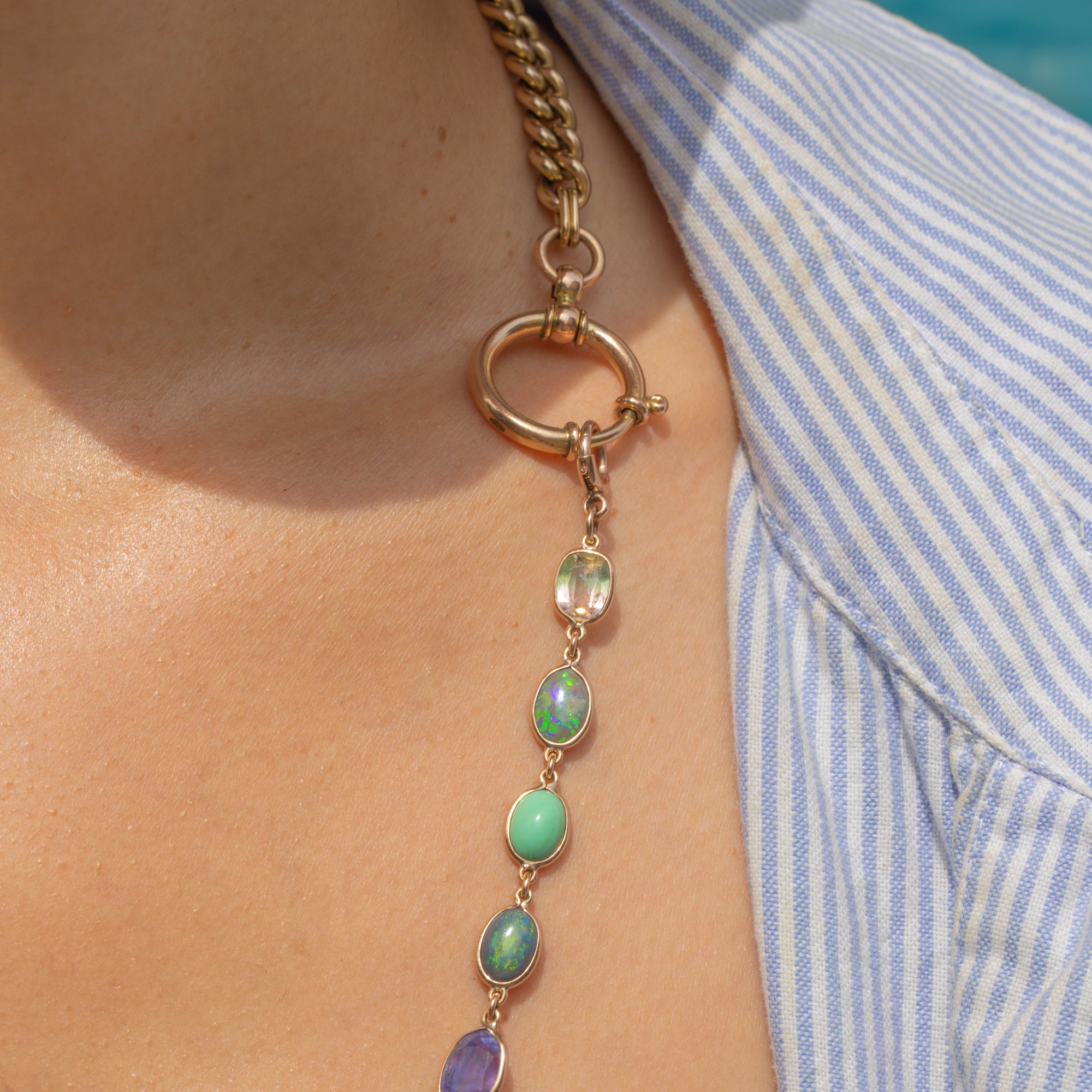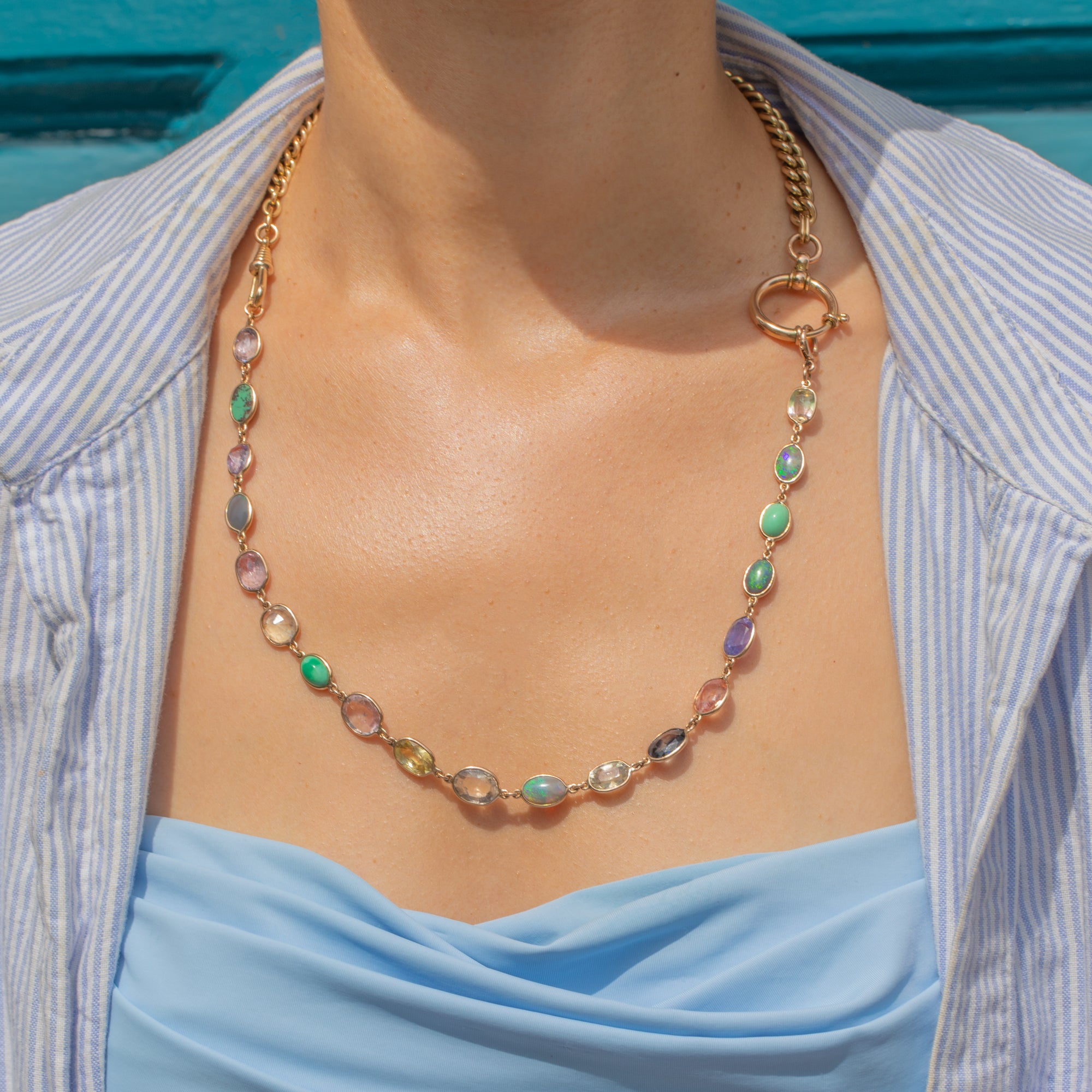 VERY GOOD-EXCELLENT: Each radiant gemstone is secure in its bezel, with the Sapphires having been beautifully faceted and the Opals and Turquoise each with a smooth domed surface. There are signs of wear to some gemstones, with the Sapphires specifically having fleabites and nibbles present. However, these are difficult to spot when the piece is worn, and is to be expected with age. With its bolt-ring in perfect working order, this Victorian Gold necklace extender can be worn with utmost confidence!