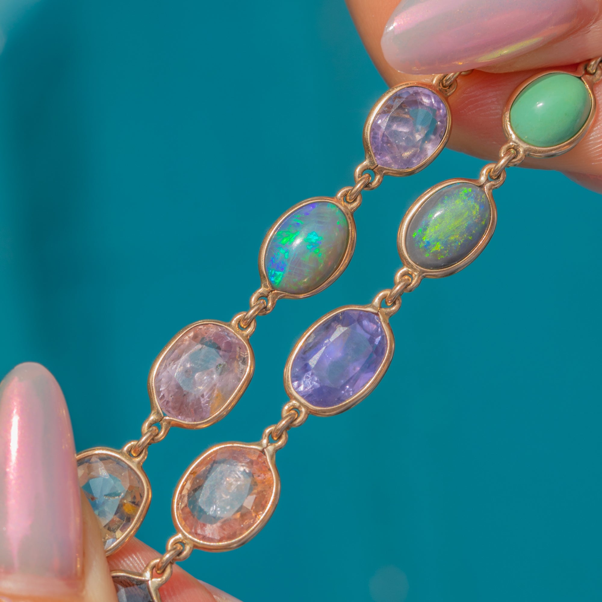 MATERIALS: Tests as 9ct Gold, Ametrine (1.05ct), Black Opal (3.05ct combined), Turquoise, Natural Sapphires (Lilac, lavender, pale lavender, Paparadscha, Blue, Cornflour blue, Pale green, Pale yellow) (26.10ct)