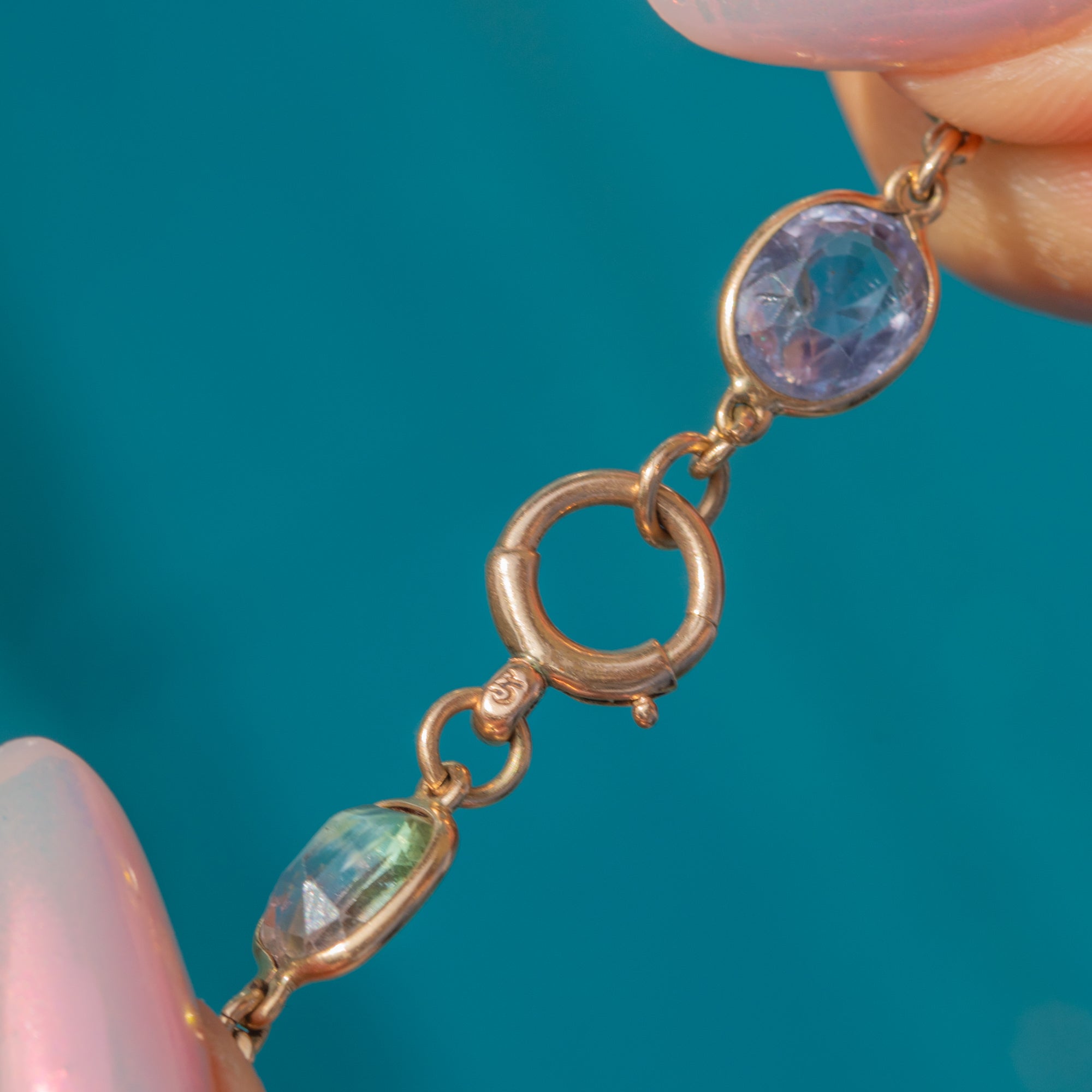 The Sapphires display a spectrum of soft hues—from lilac and lavender to yellow and blue—totalling 26.10 carats combined. Each gemstone is elegantly set within a polished 9ct Gold bezel and connected by a finely crafted links, complete with a large antique bolt ring.