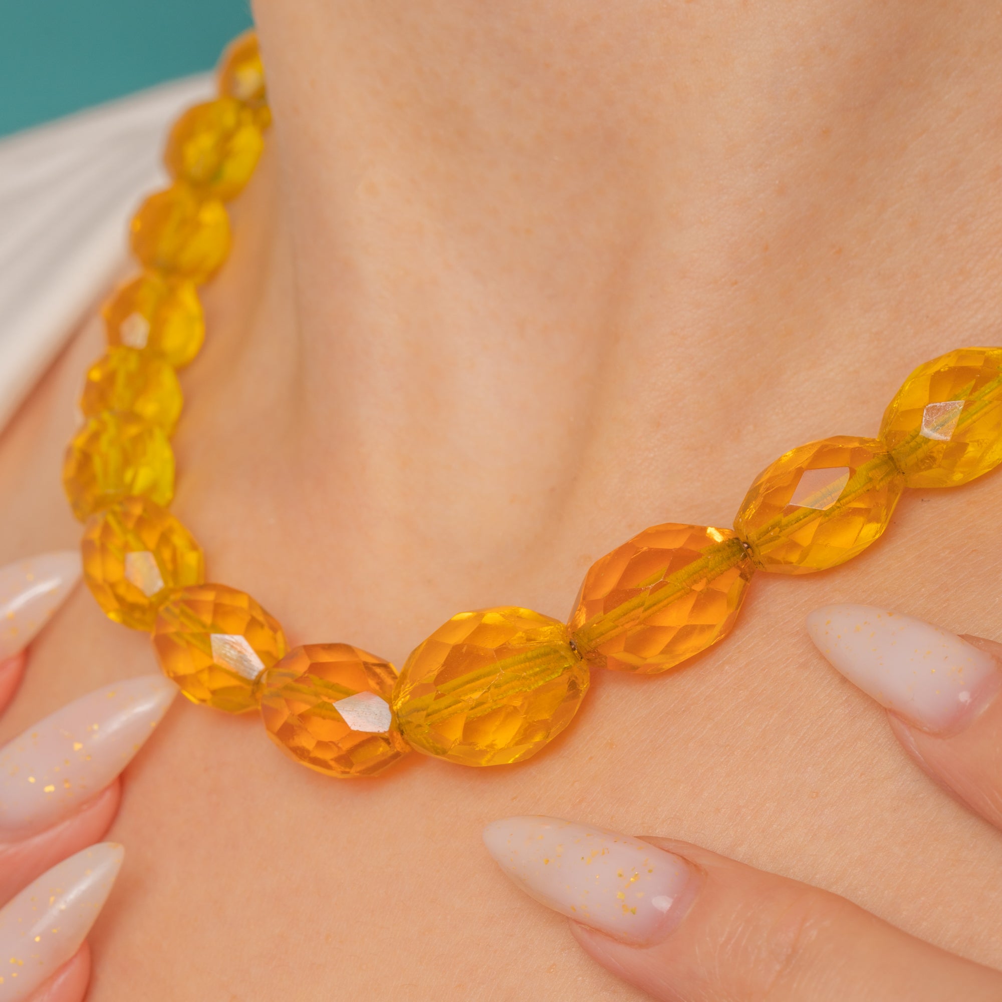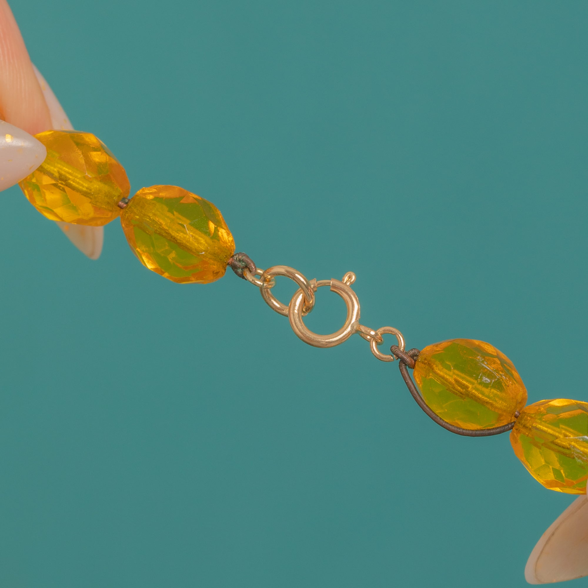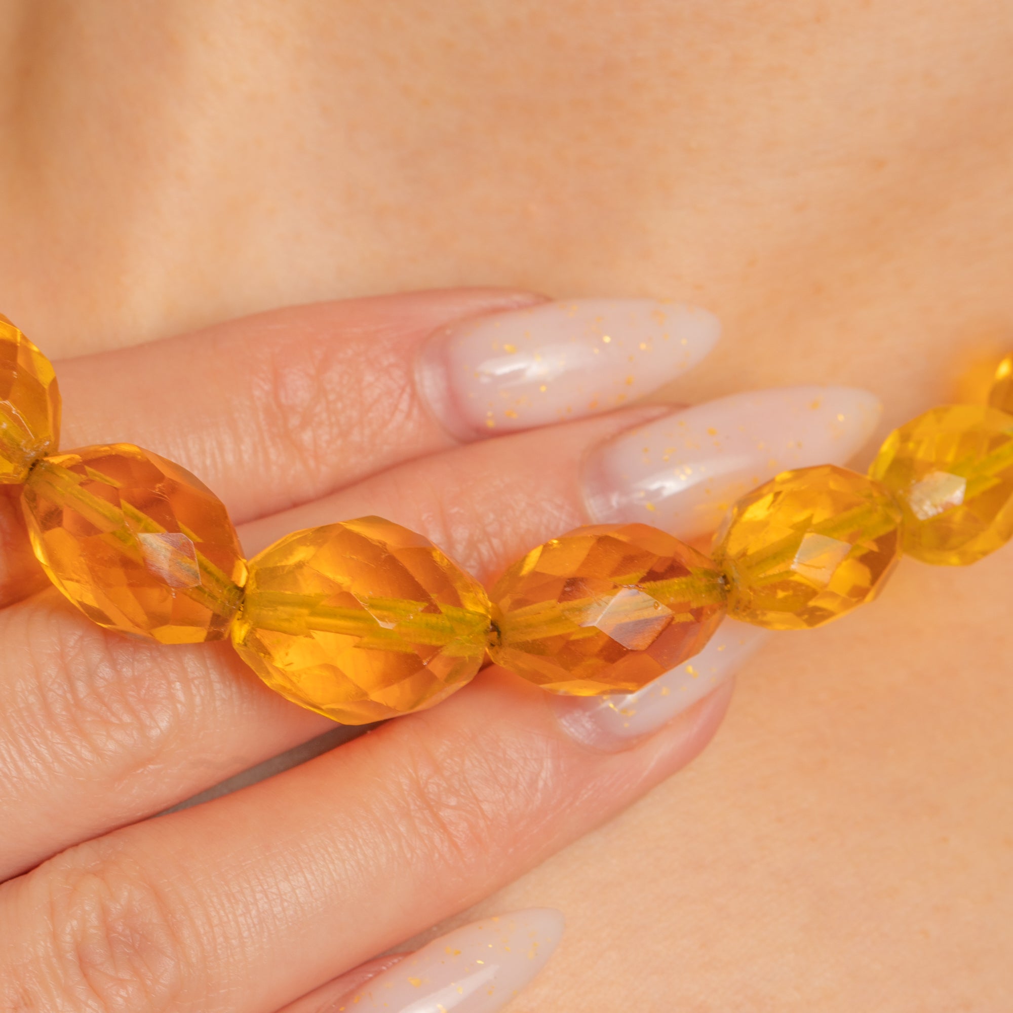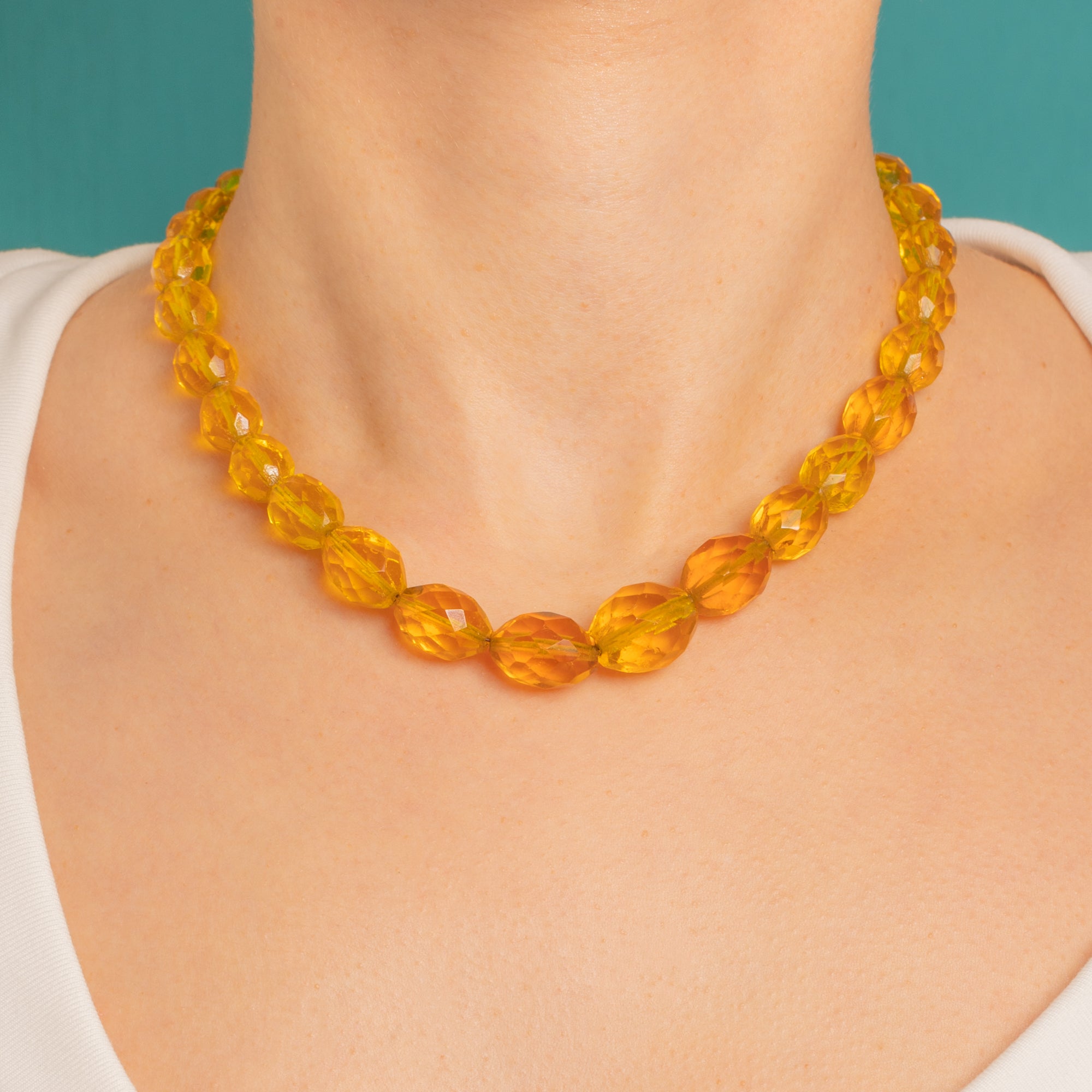 Glowing with sunlit tones of honey and golden amber, this Art Deco necklace is a radiant statement at the collar. Graduated, crisply faceted Uranium Glass beads create a smooth, sculptural line that dances with light, bringing together the playful and the poised in true Deco style.
