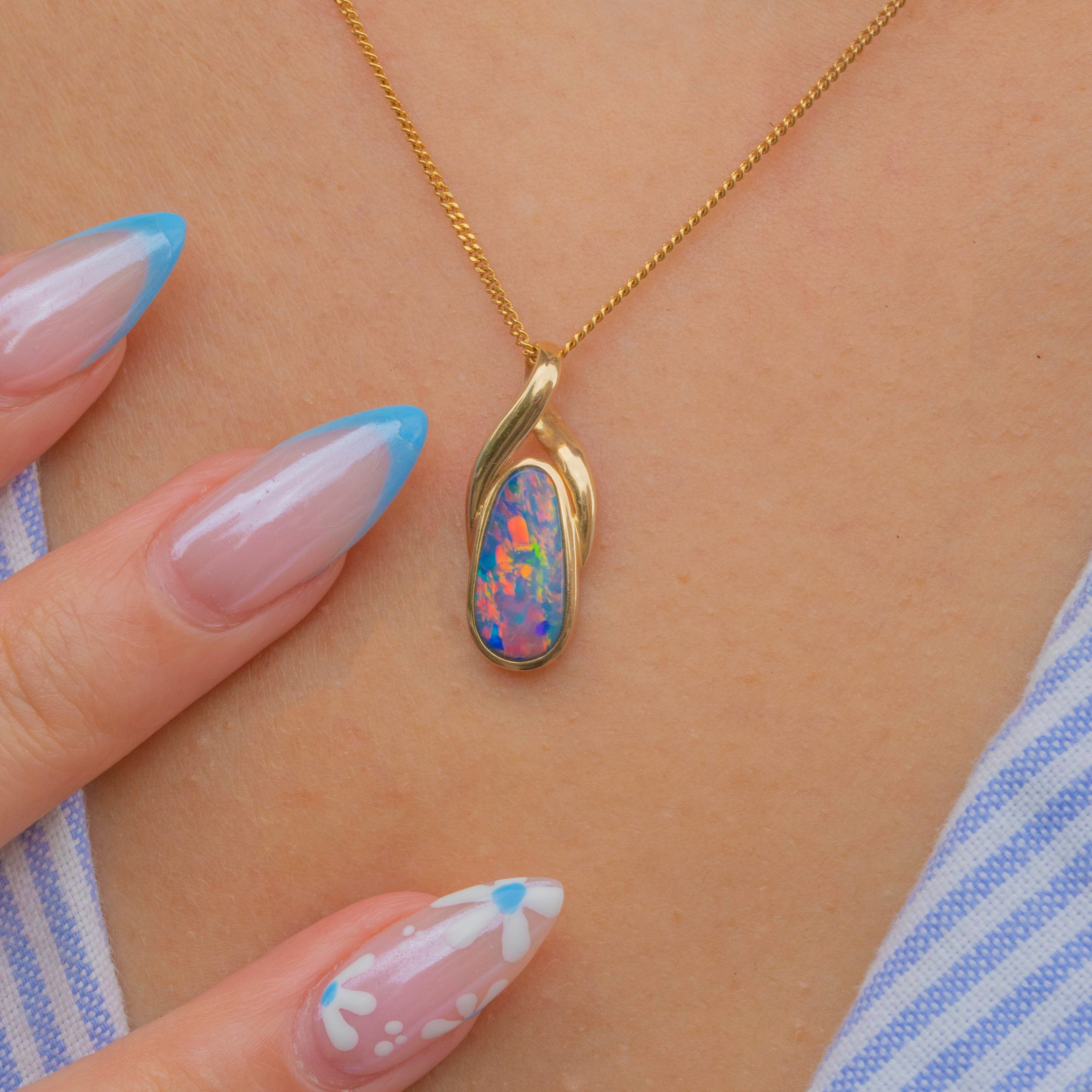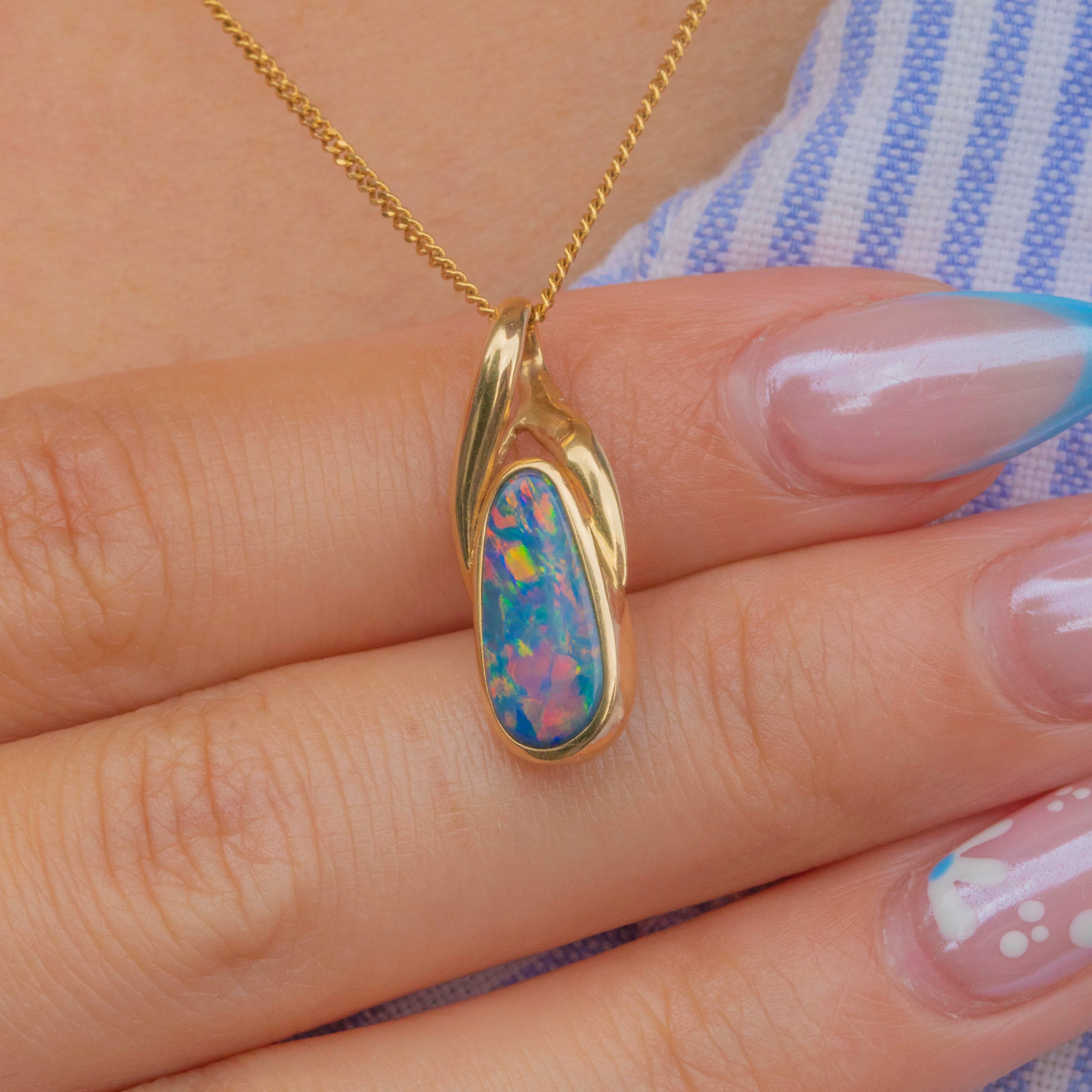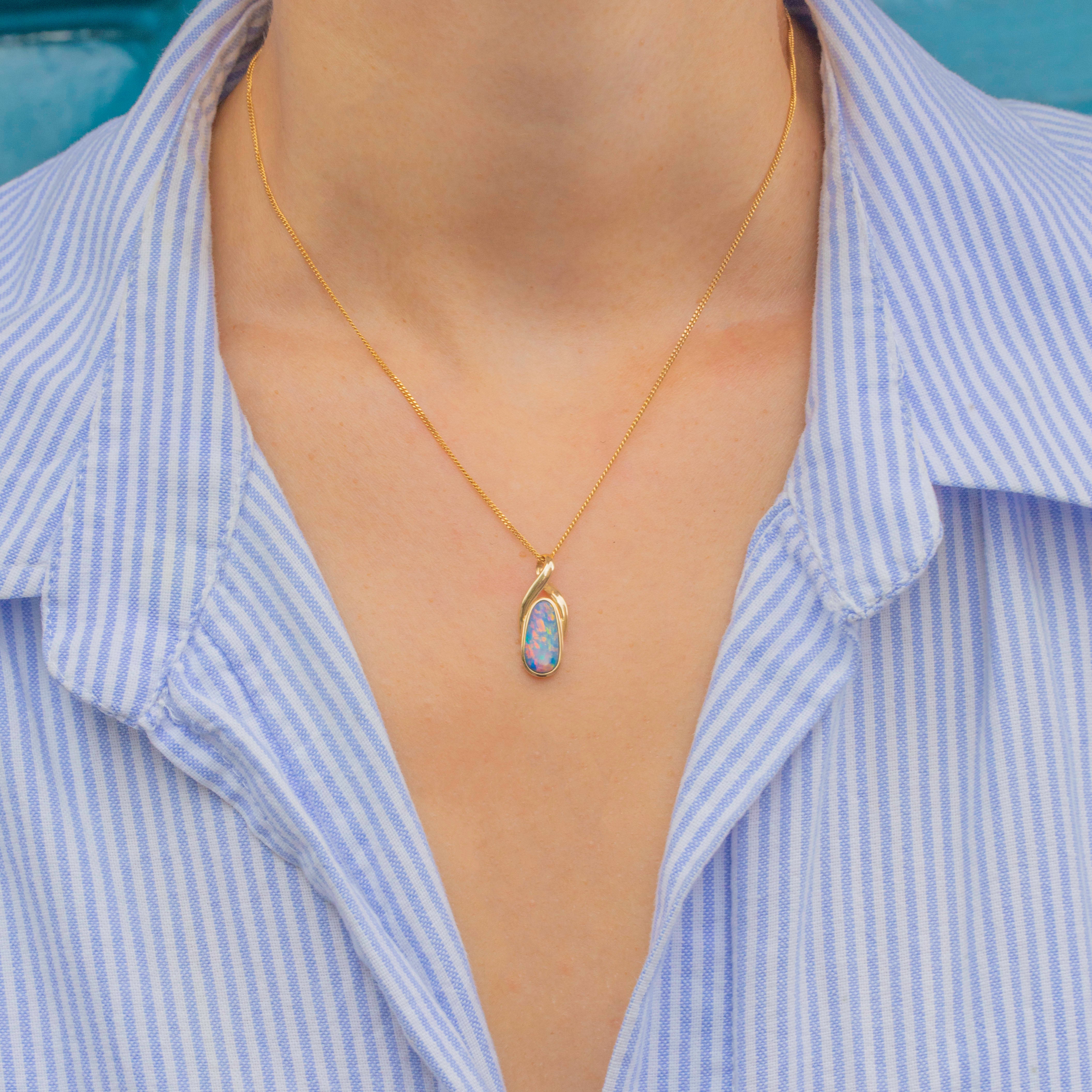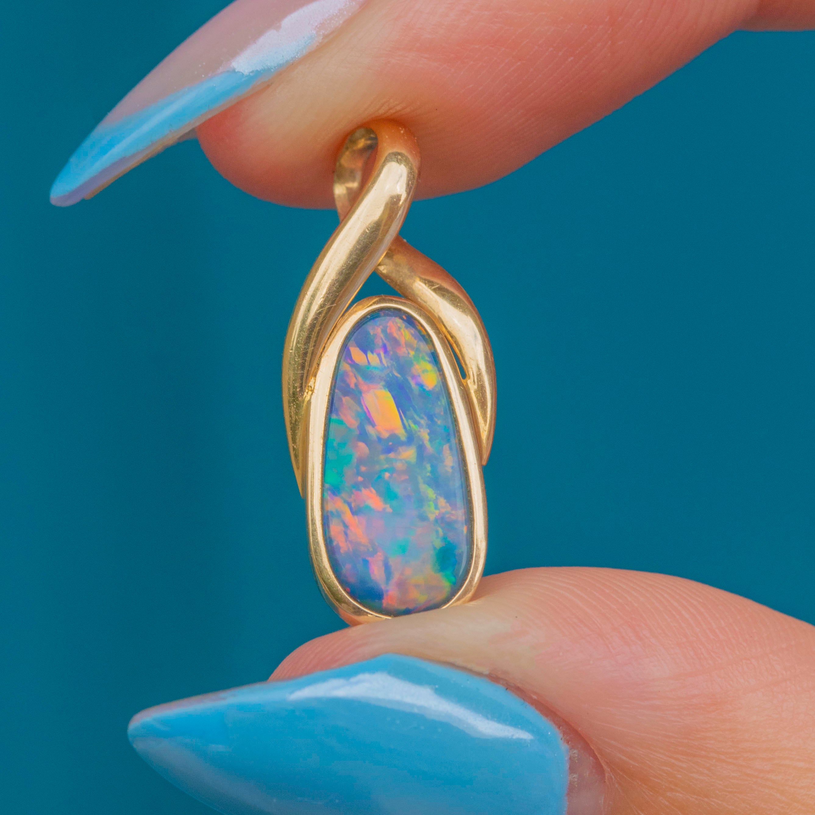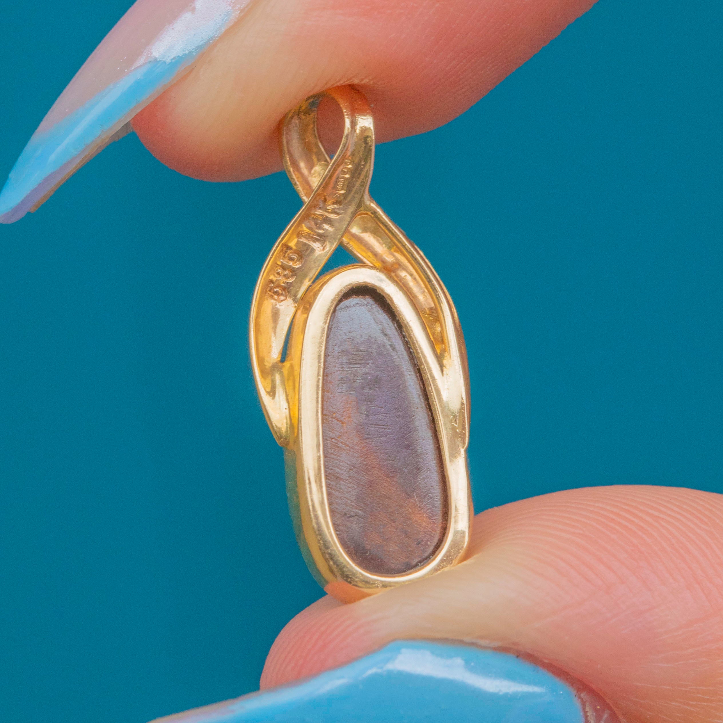 An intriguing design, this 14ct Gold boulder Opal pear-shaped pendant is a treat for the eyes! A sleek 14ct Gold setting hugs the smooth boulder Opal, allowing it to suspend effortlessly from a chain and reveal its entirely natural beauty.
