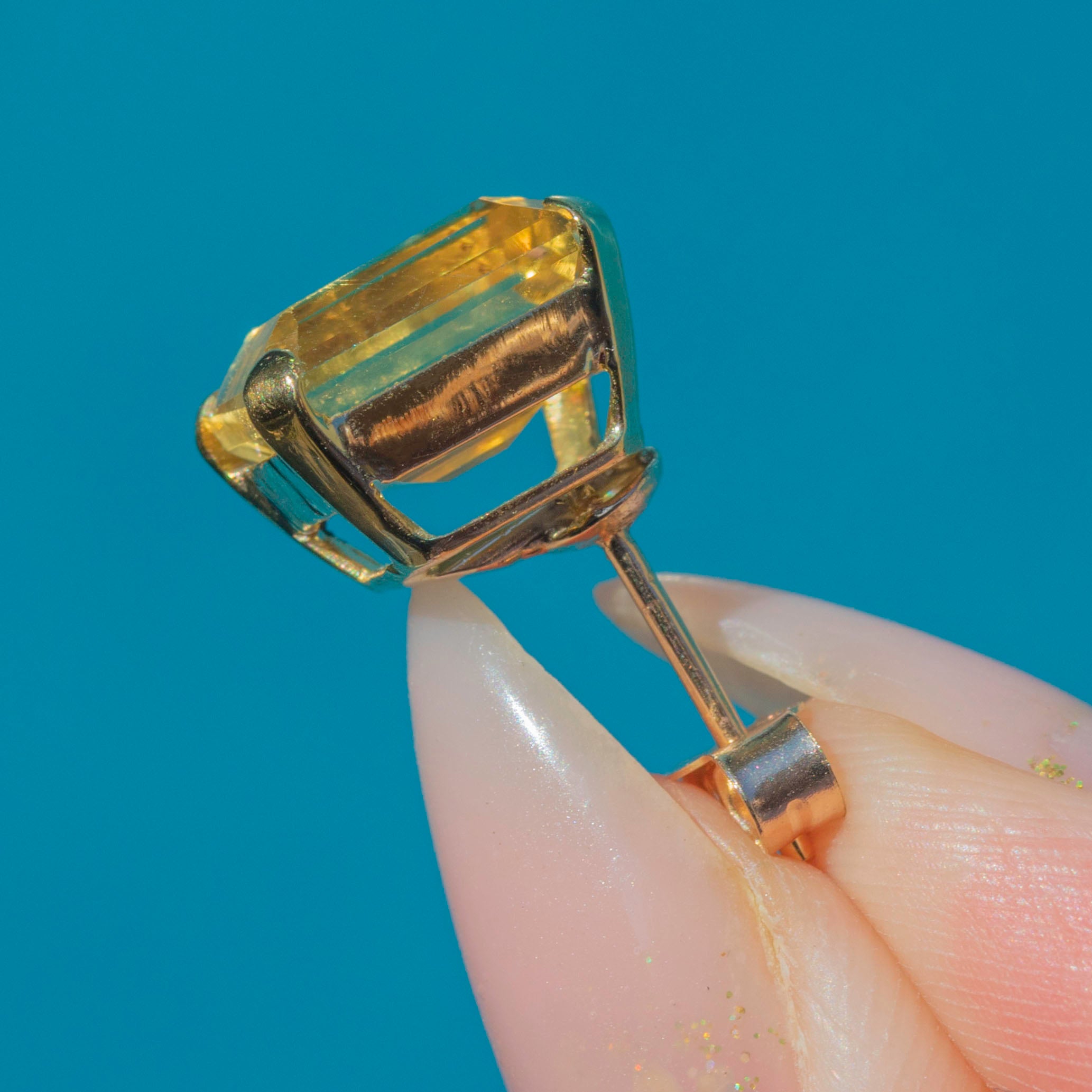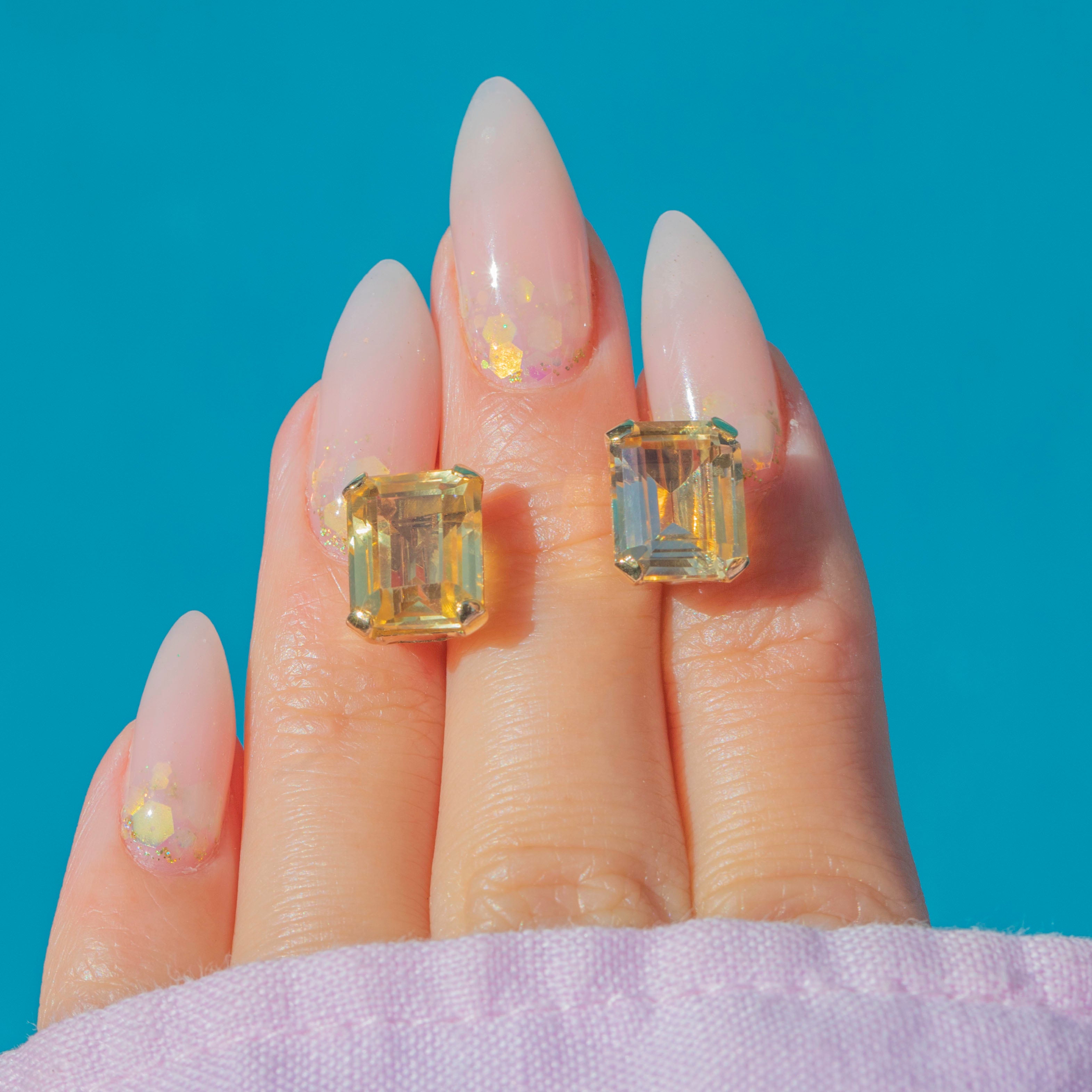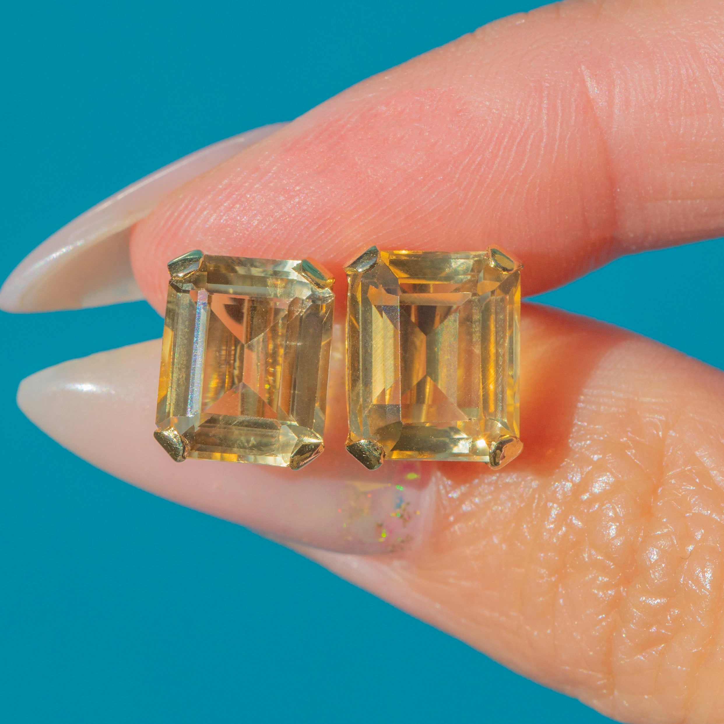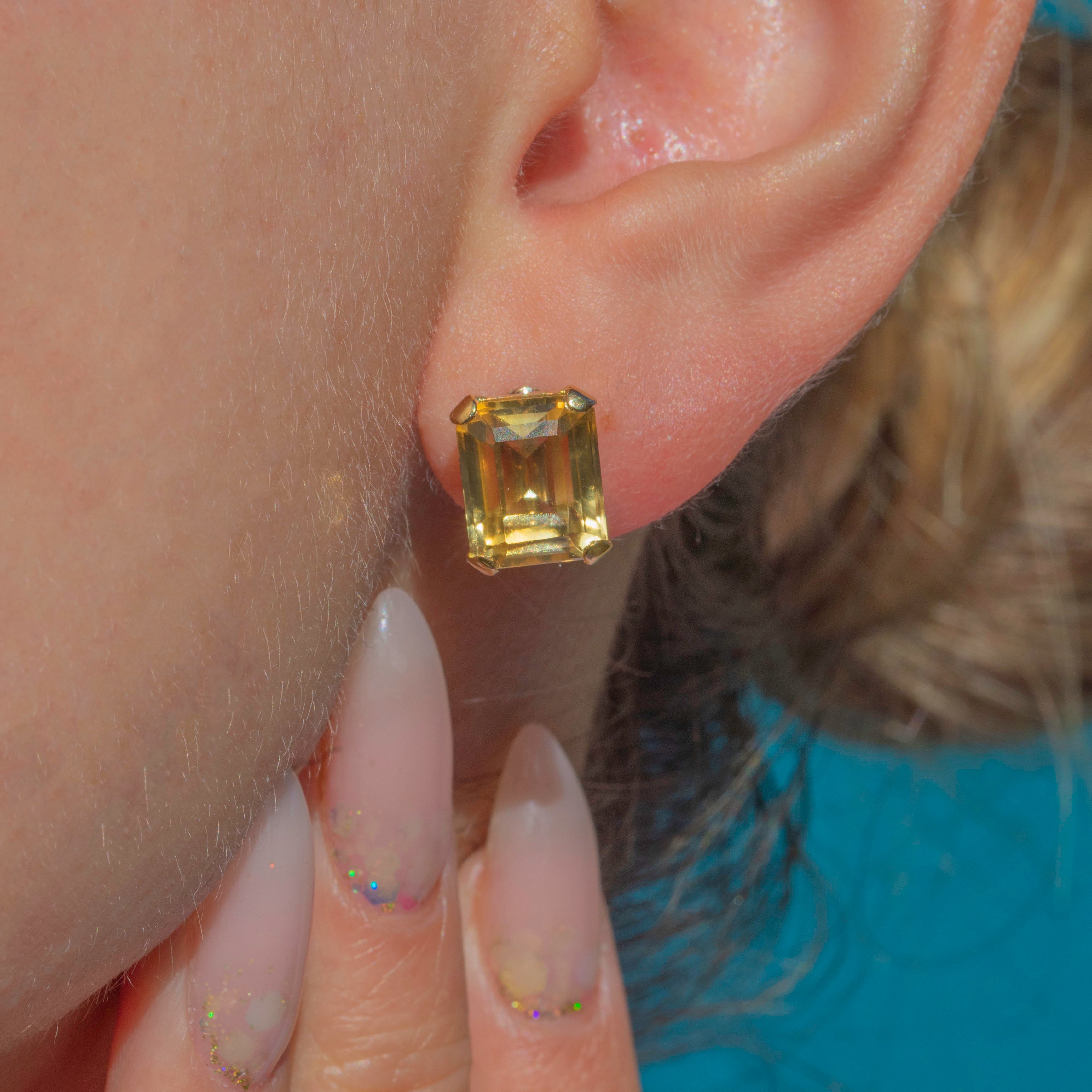 These Art Deco Citrine earrings are a dazzling pair, set with striking emerald-cut Citrines in rich golden hues. The gemstones measure 10mm by 8.5mm each, weighing an impressive 4.13ct apiece, and are mounted in 14ct Gold settings that showcase their bold geometry.