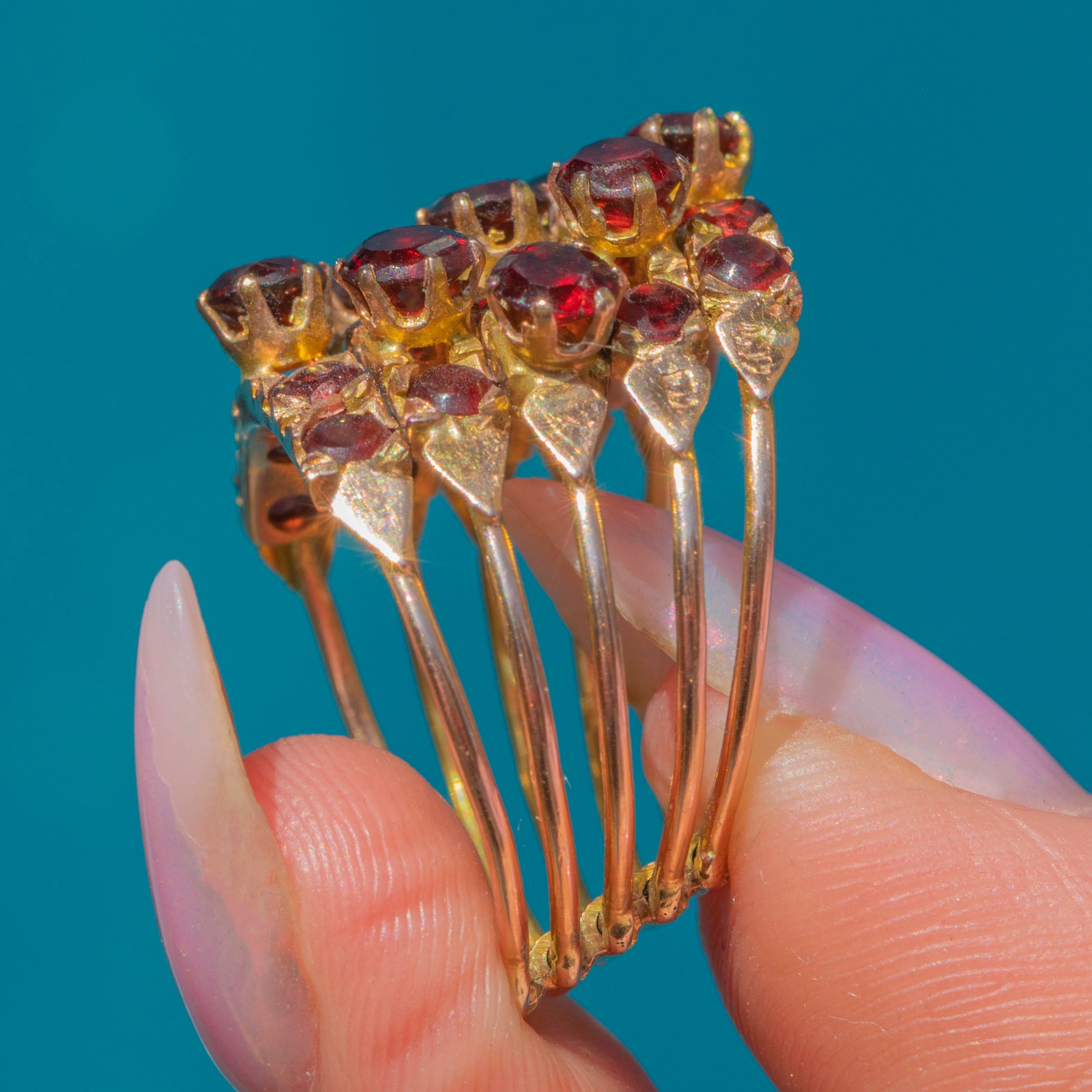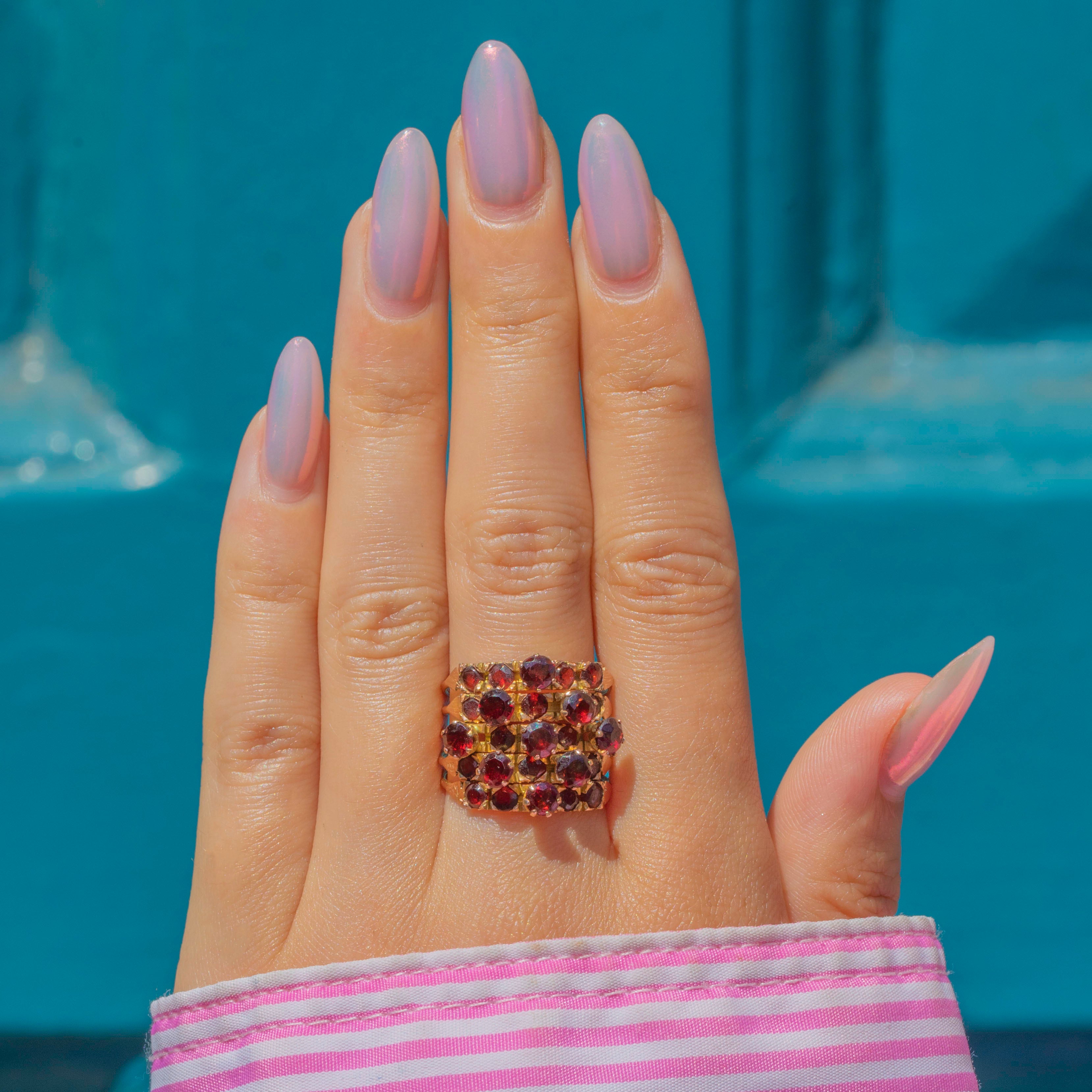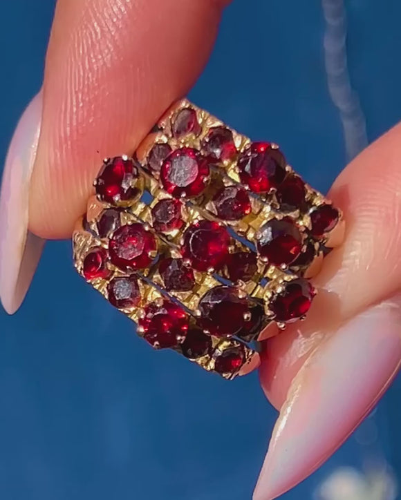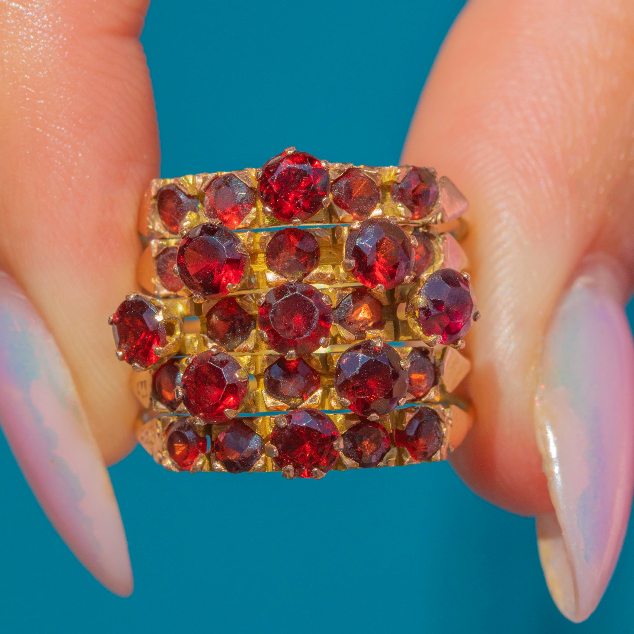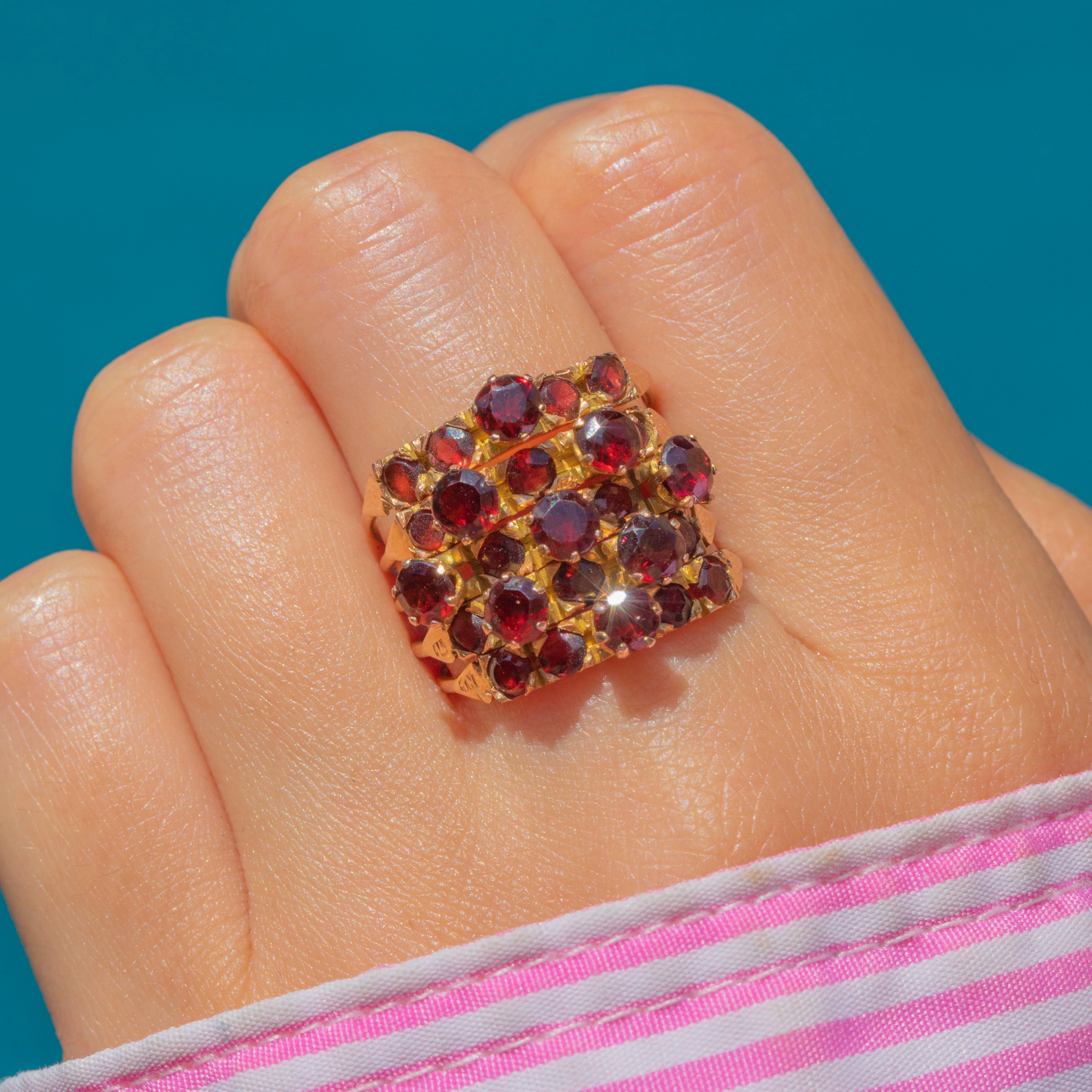 A stunning Victorian Harem ring with a generous helping of saturated Garnets, each one possessing a marvellous magenta hue!