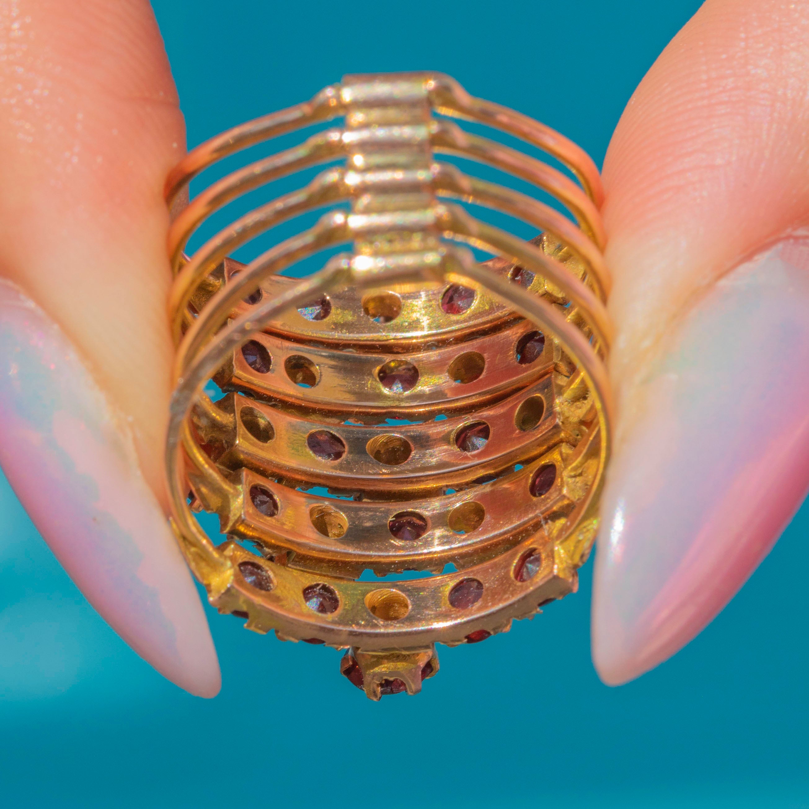 The term "Harem Ring" refers to its unique design, which incorporates multiple bands that wrap around the finger, creating a harmonious and fluid silhouette reminiscent of the ornate jewellery worn by women in the lavish harem palaces of the Ottoman Empire. Complete with an unusual rosy 14ct Gold five-pronged shank, she might just be the ring of your dreams!