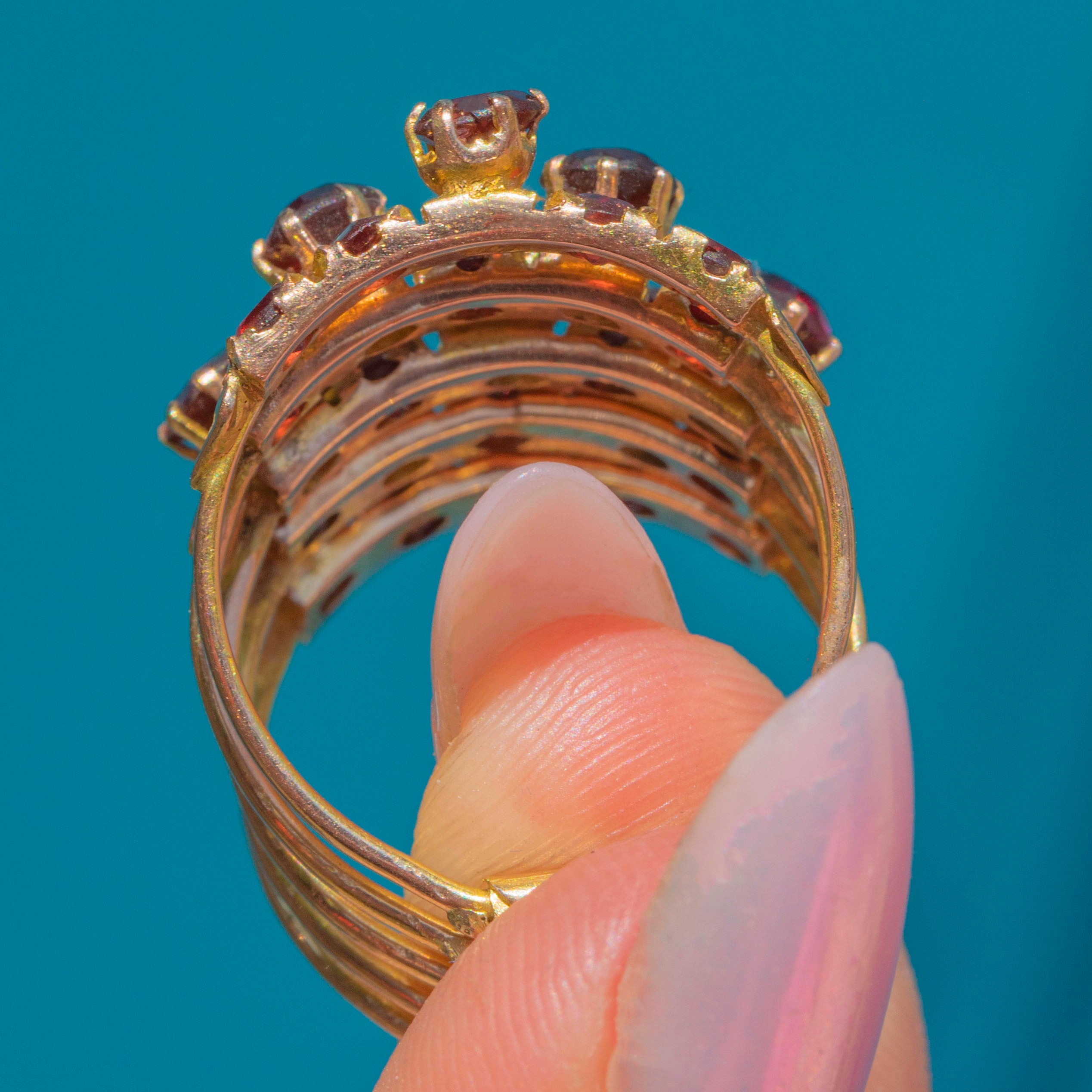The Garnets are near pristine, with only a couple showing mild wear to the surface, and are securely held within their settings. The Gold is brightly saturated and the bands have kept their form well, feeling comfortable on the finger and promising many more years of wear and enjoyment!