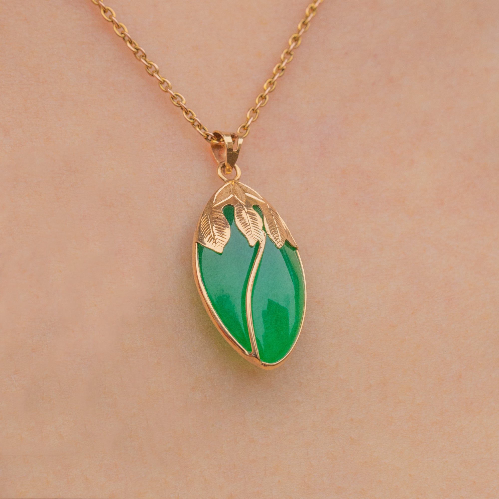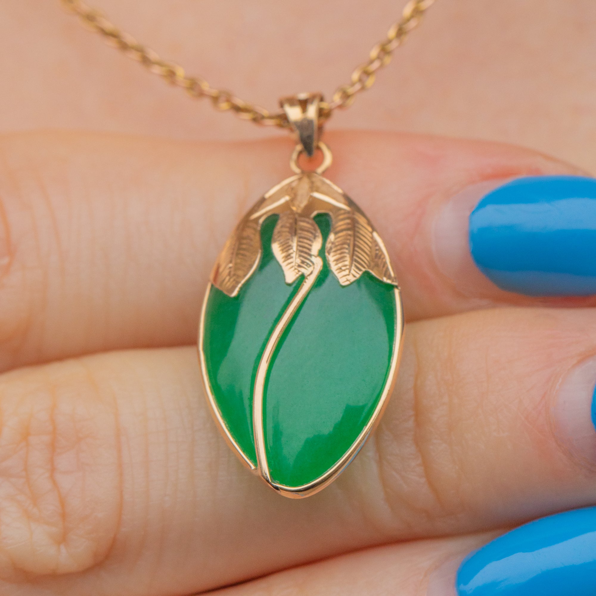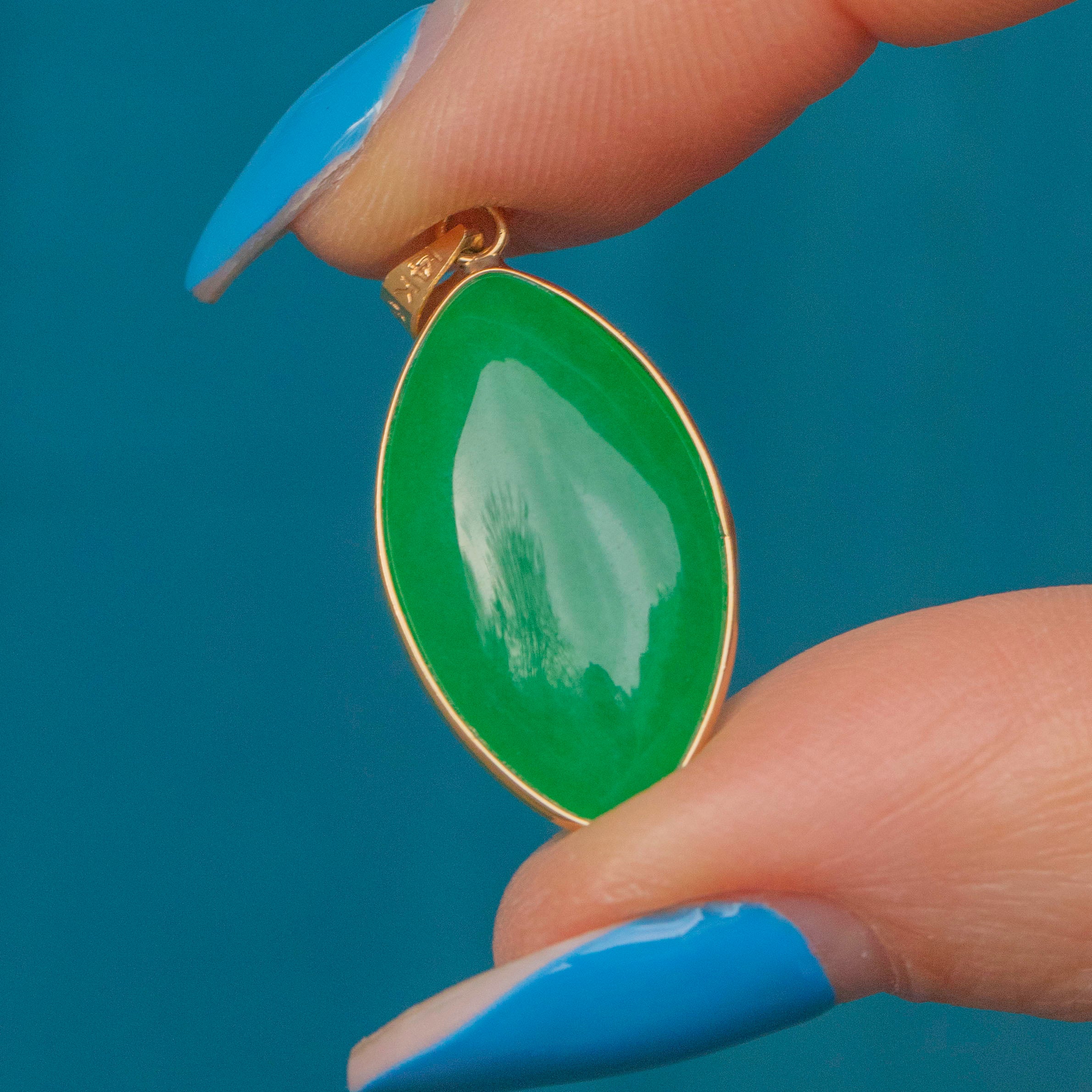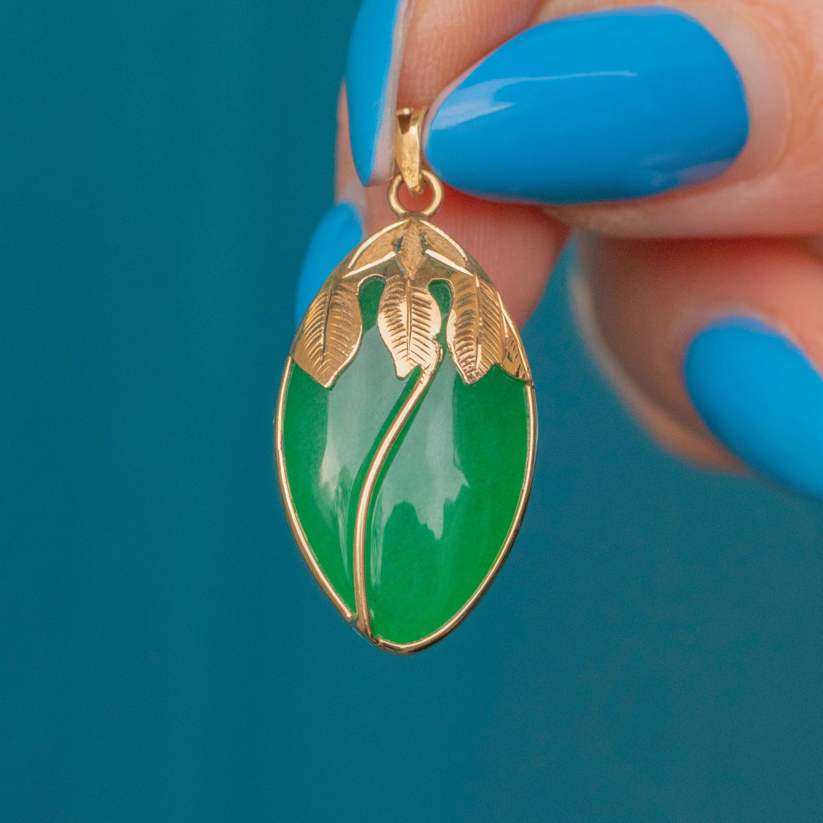 This elegant vintage pendant features a captivating navette-shaped Jade gemstone, her smooth surface displaying vibrant serene green hues which look radiant in the light. She is framed within an intricately detailed 14ct Gold bezel, with her radiant leaf detailing effortlessly complimenting the Jade's natural hues.
