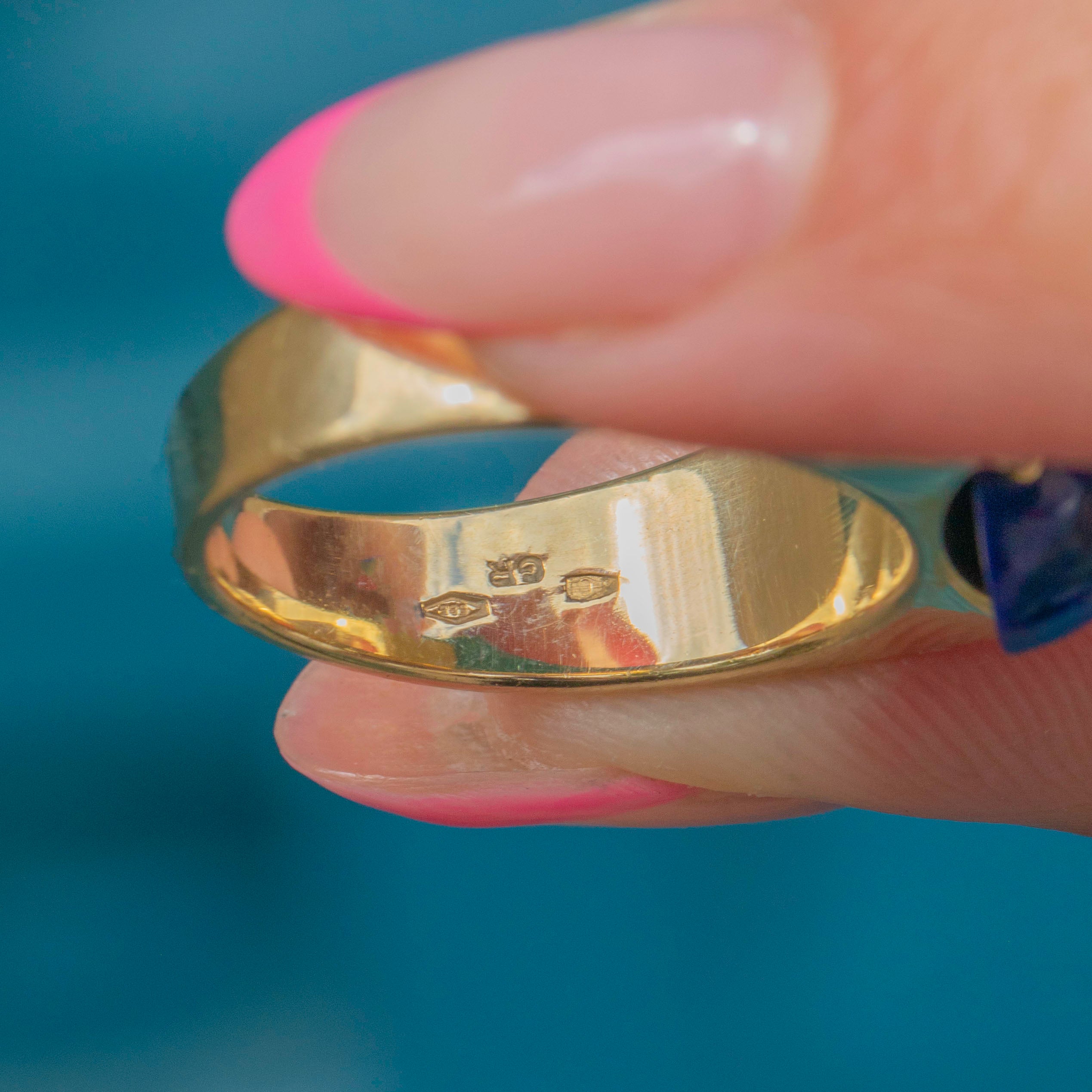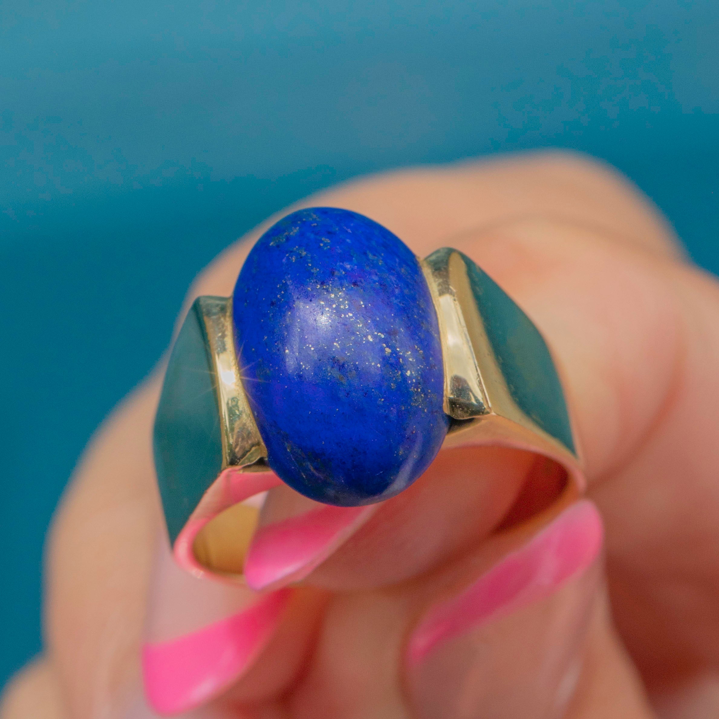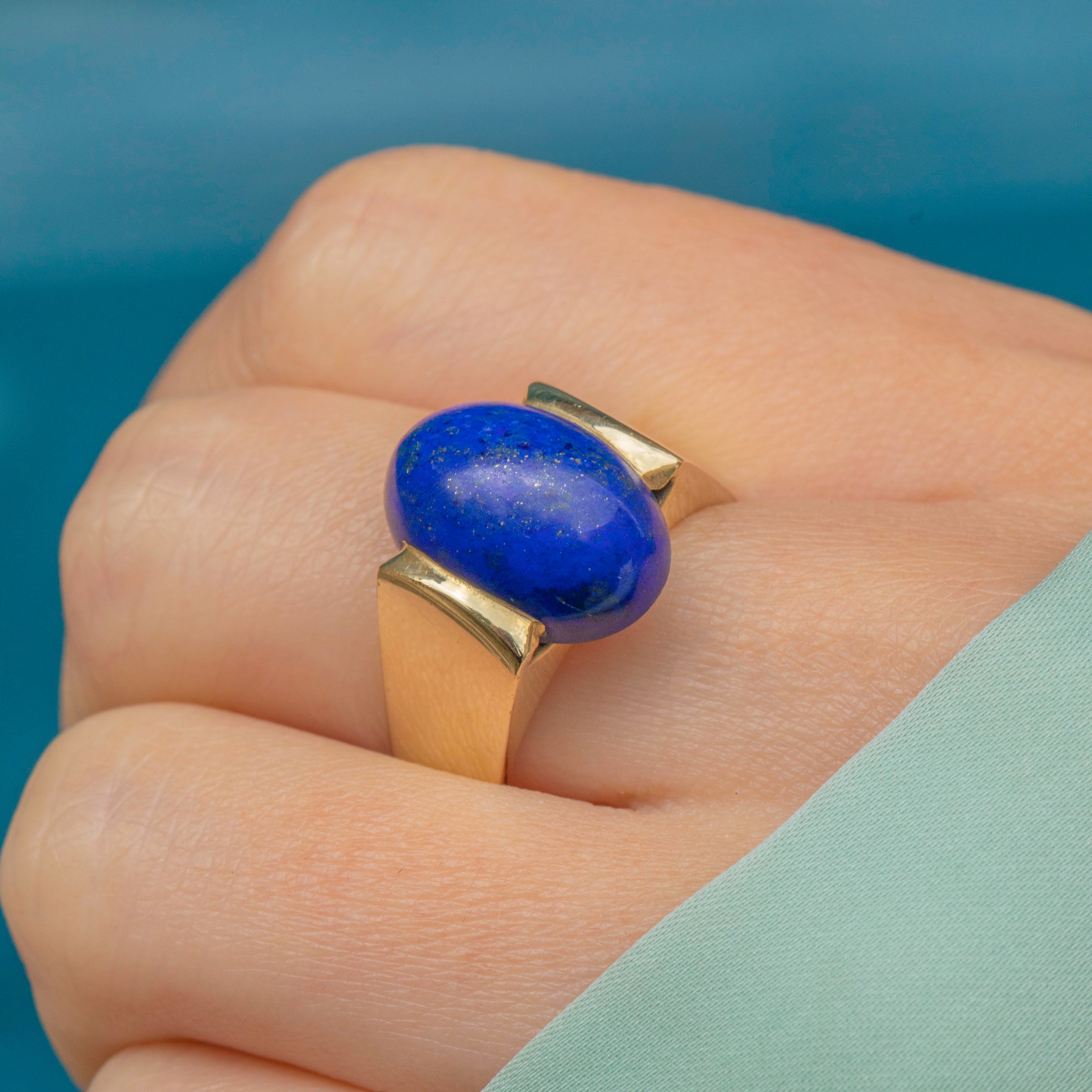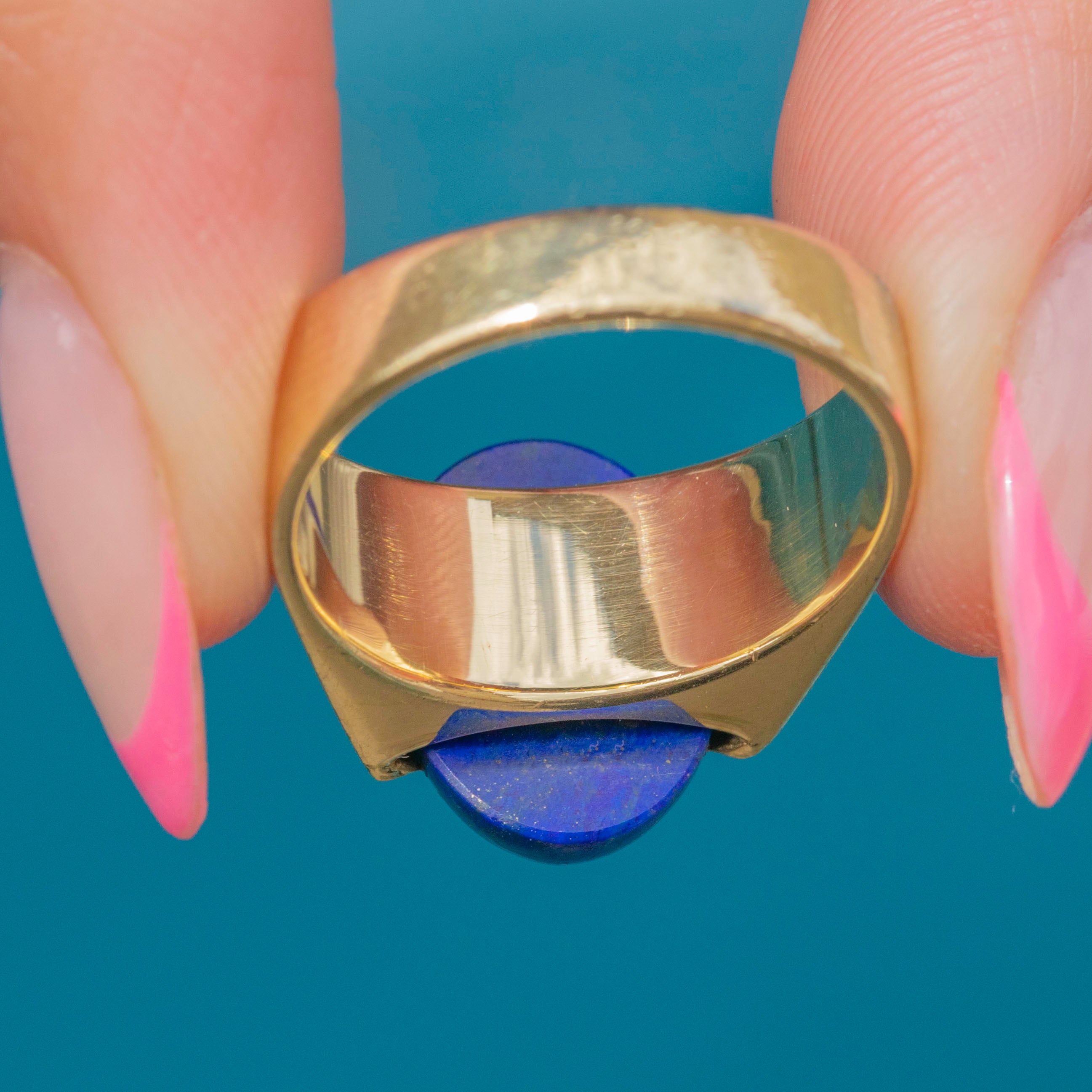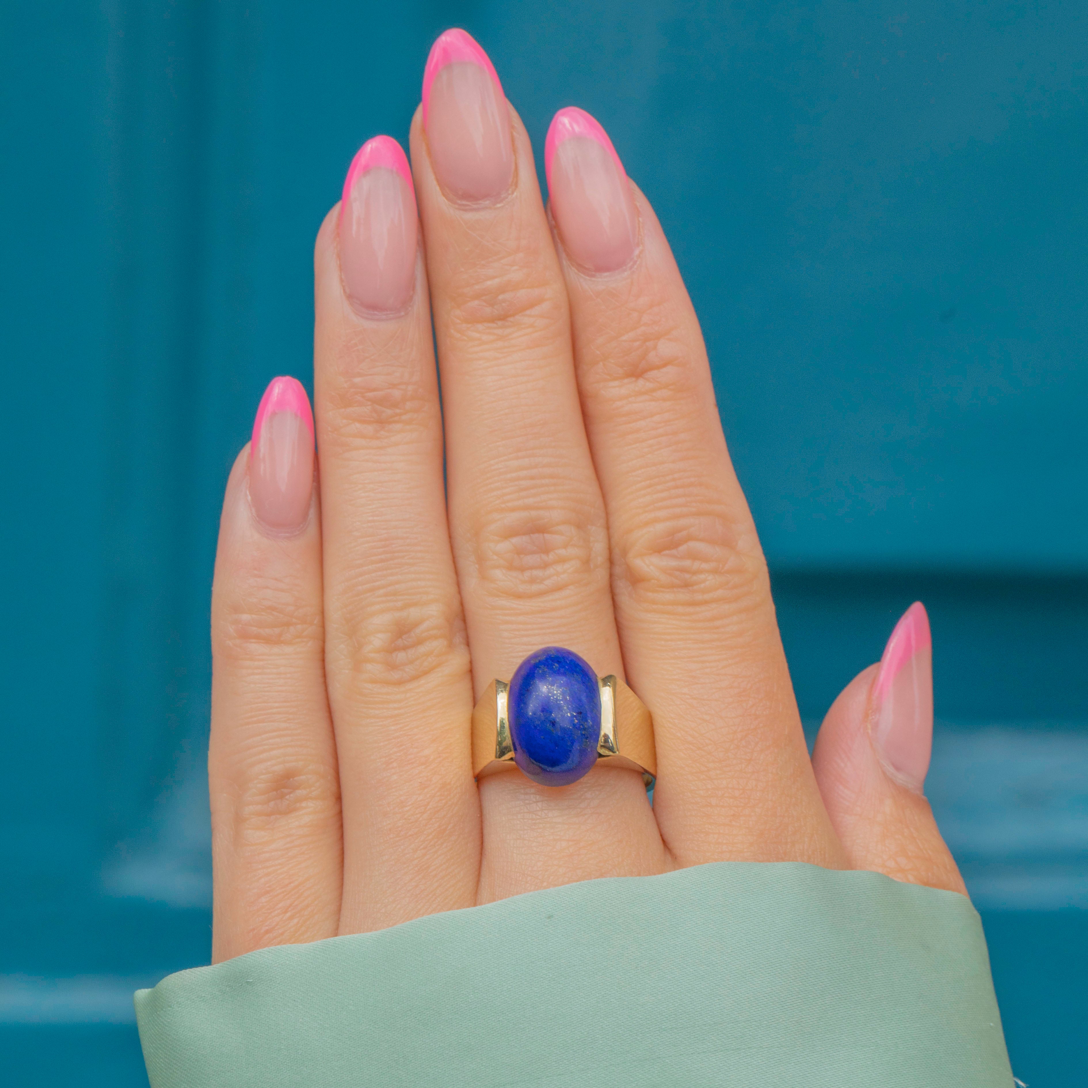 With a saturated deep royal blue hue, her domed Lapis Lazuli has a brilliant radiance and adds a lovely pop of colour to this ring. She is flanked by chunky 14ct Gold shoulders, with a lovely buttery sheen, effortlessly complementing her bold gemstone.