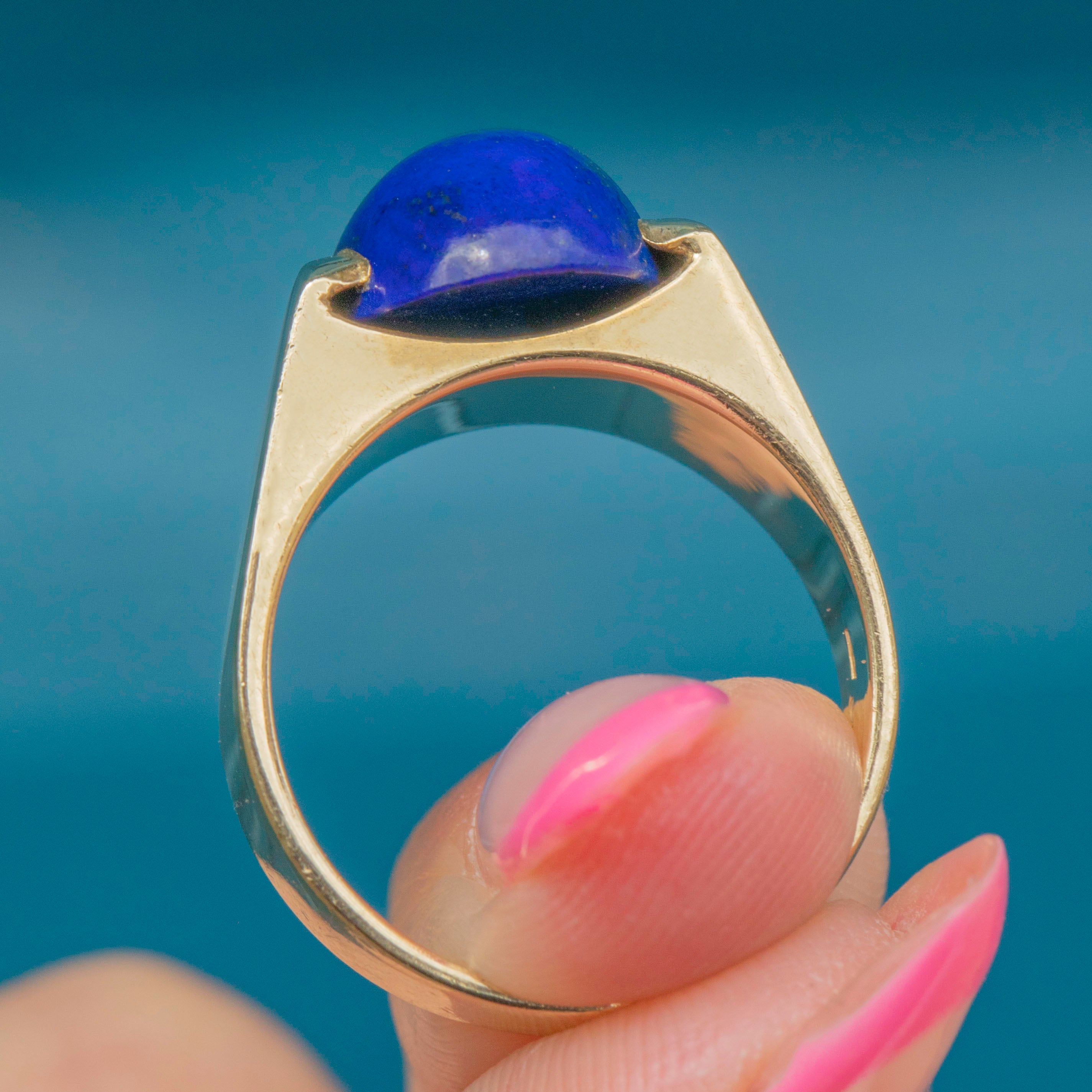 VERY GOOD-EXCELLENT: This 14ct Gold Lapis Lazuli ring is in great condition. The Lapis Lazuli has a lovely domed finish and is securely set. The Gold is bright and buttery, with only some minor dings to the back of the ring band, which are difficult to spot. With little else to note, she is a must-have piece!