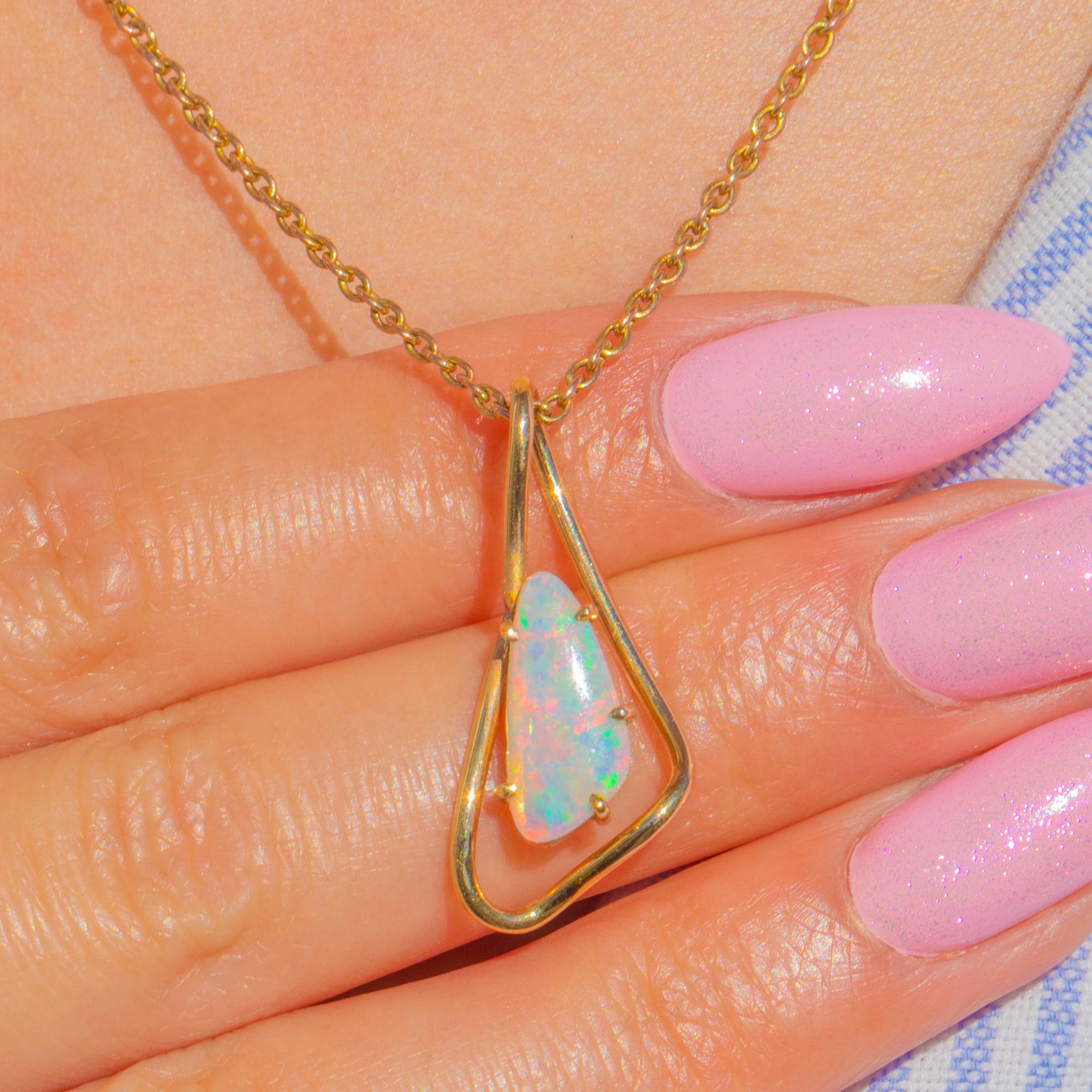 A sleek Mid-Century “Loupe” pendant crafted in 14ct Gold, this piece spotlights a freeform Opal cabochon alive with pink, green, blue and peachy-orange flashes. Its luminous play-of-colour glows against the warm Gold, creating a quietly luxurious focal point.