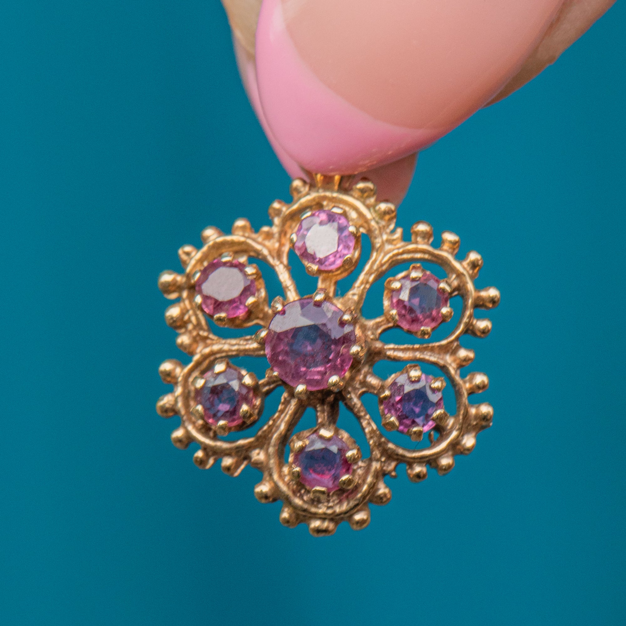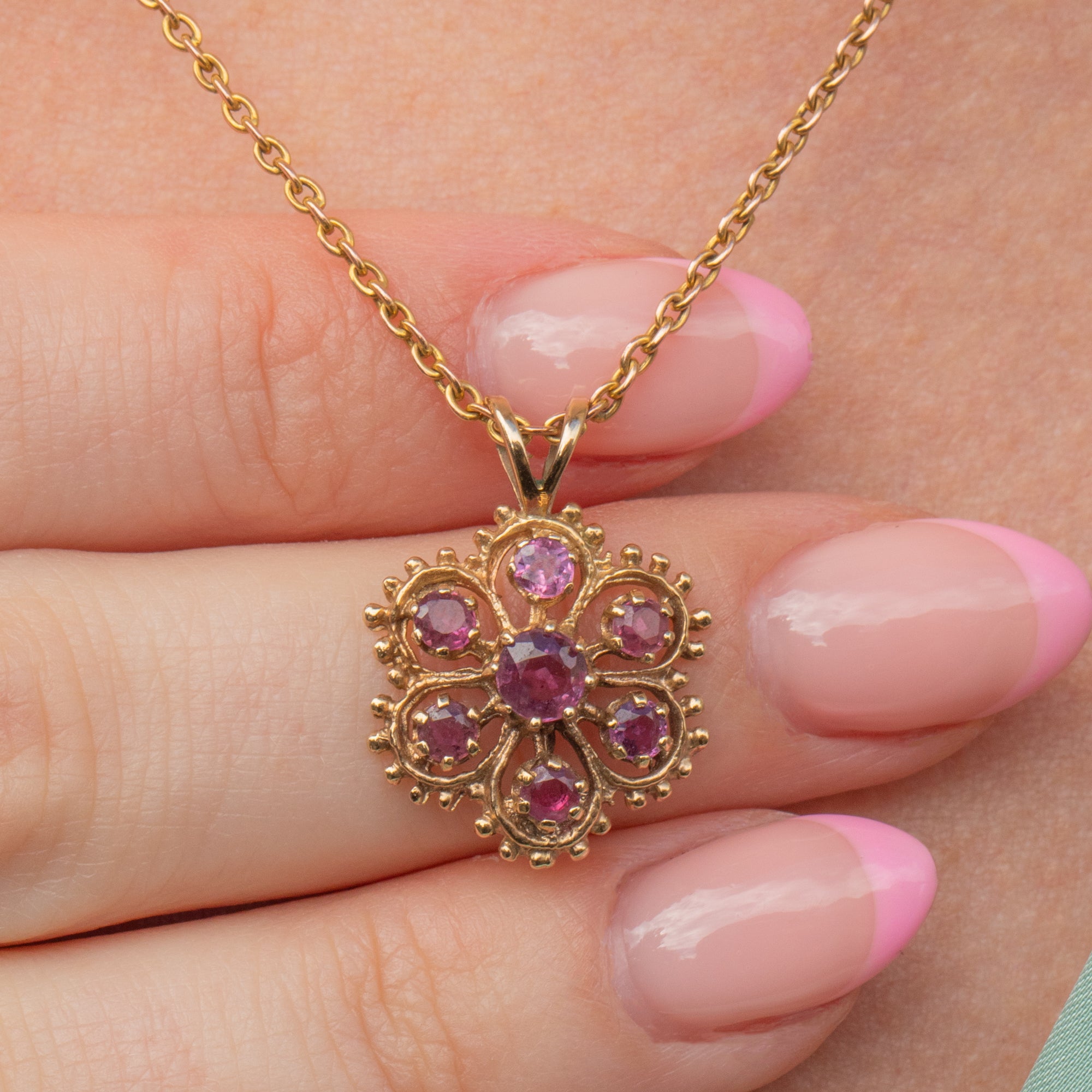 EXCELLENT. With all her Sapphires secure and free from any wear, the Gold buttery and the body of the pendant having remained well formed, this 14ct Gold pink Sapphire flower pendant is in excellent condition and can be worn with confidence with the use of its robust bale!