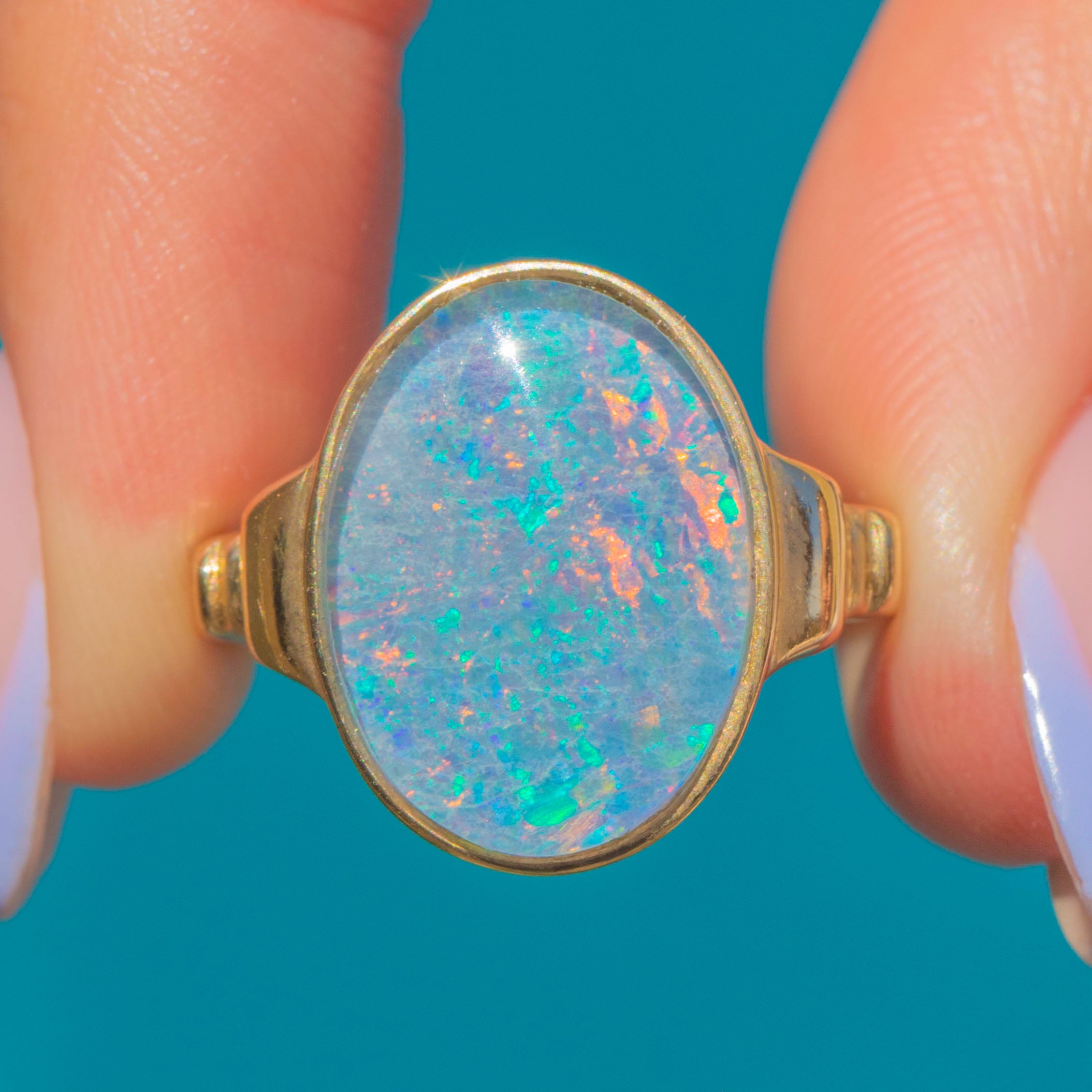 You will become mesmerised the moment you lay your eyes on this magnificent 14ct Gold Opal triplet dress ring! Her Opal triplet boasts exquisite hues of soft pastel blues, with contrasting striking flashes of orange and pink.