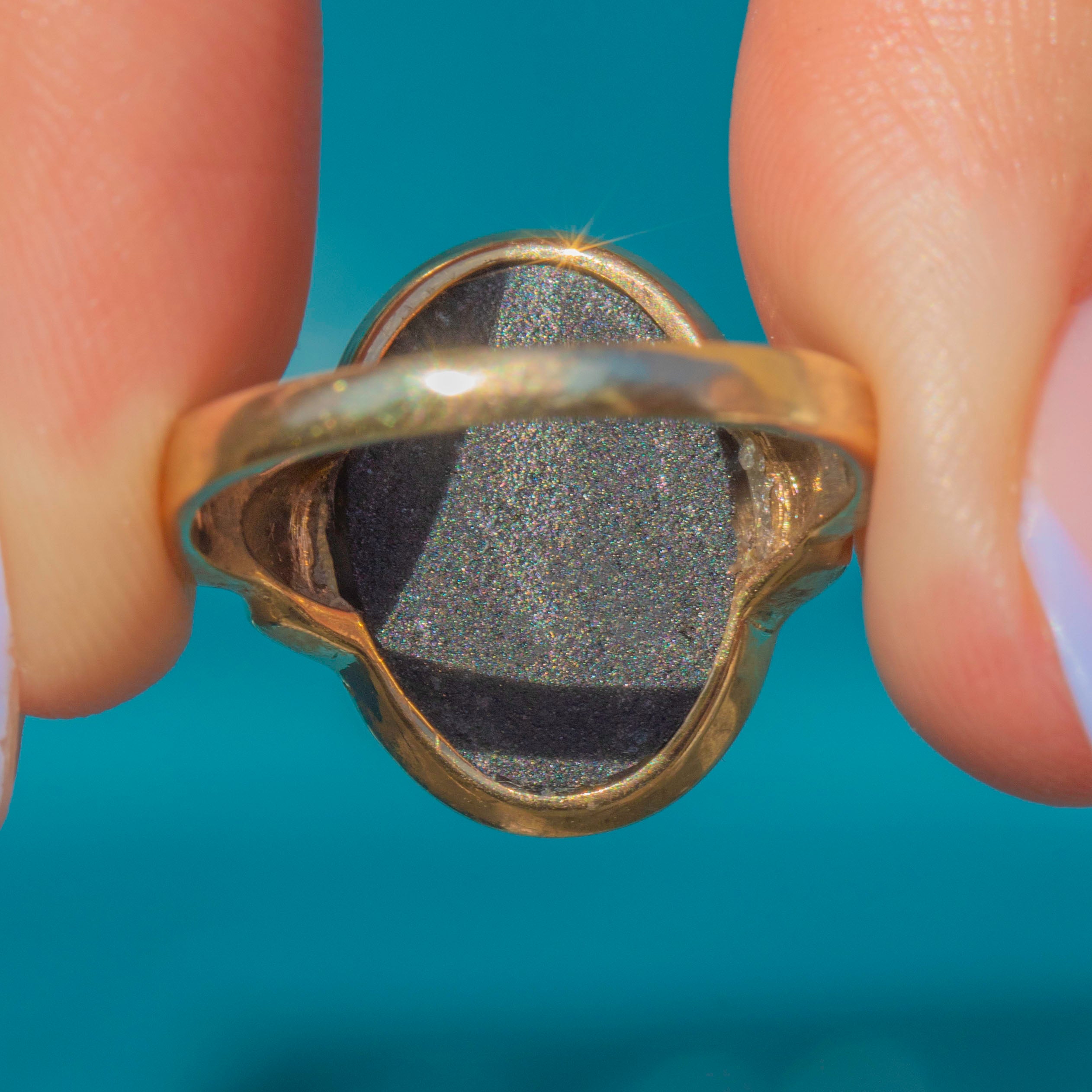 EXCELLENT: This 9ct Gold Opal triplet ring is in wonderful condition. The Opal triplet is smooth, free from surface wear, and secure within its bezel setting. The Gold is buttery and the band has retained its form well over the years, promising years of wear and enjoyment!