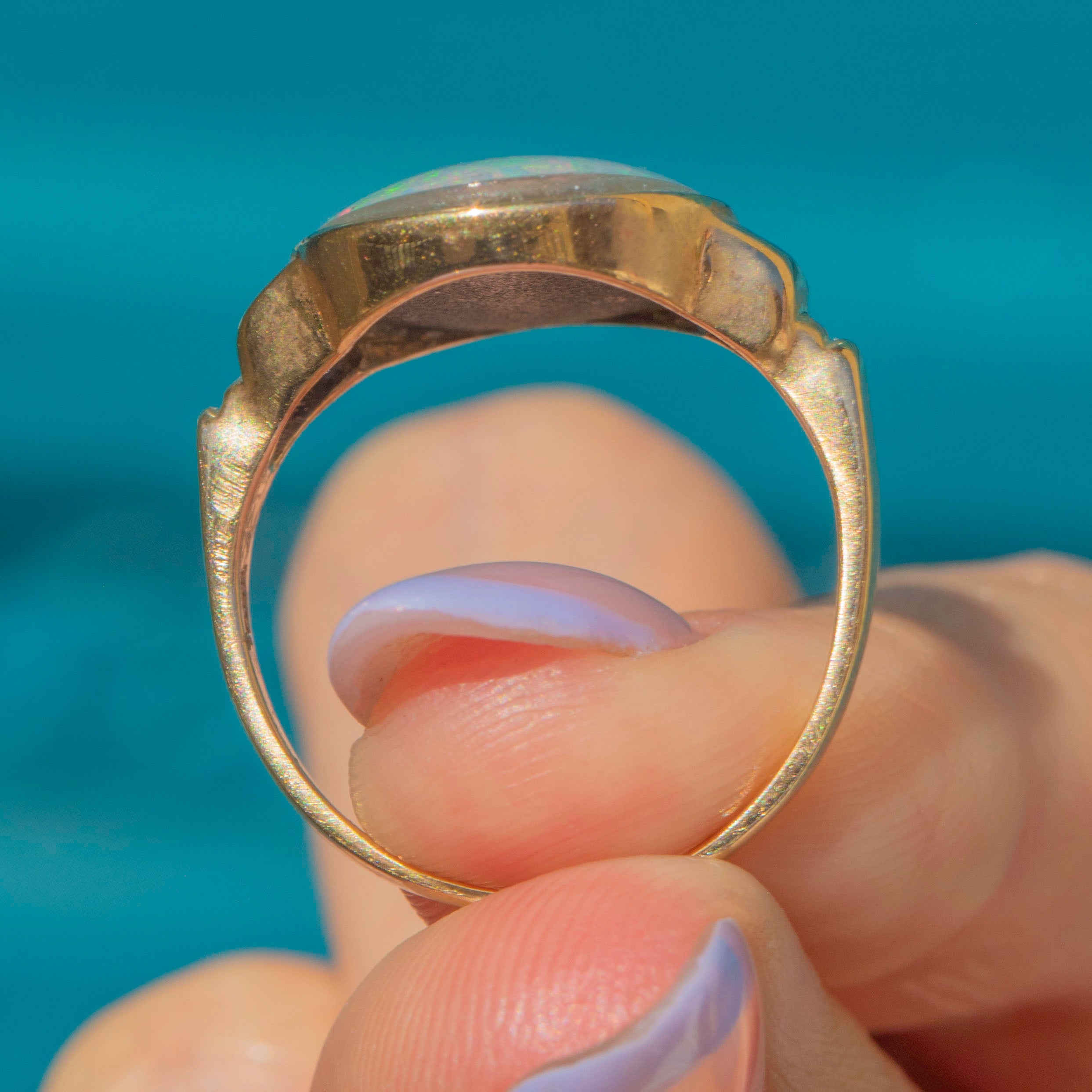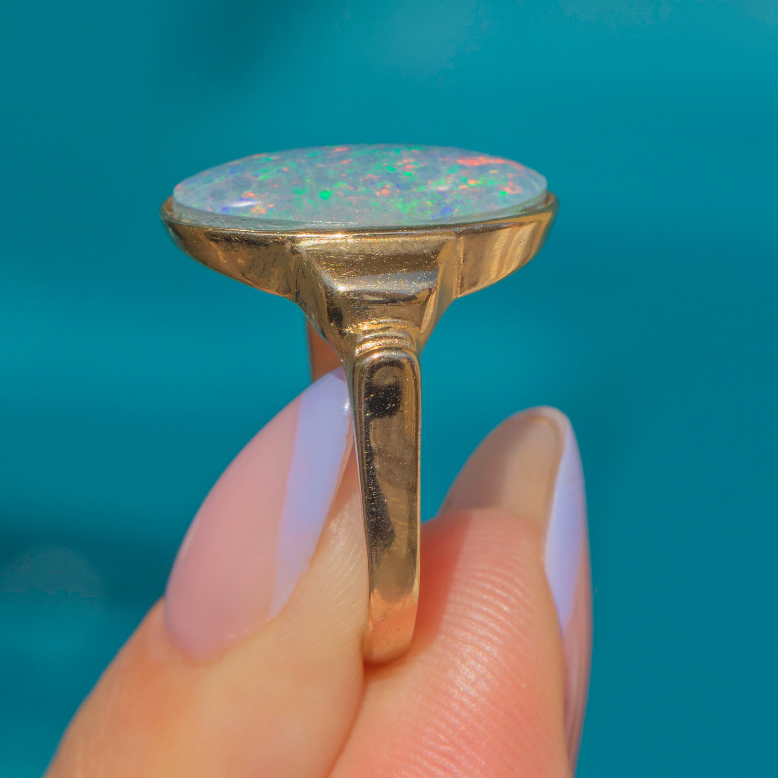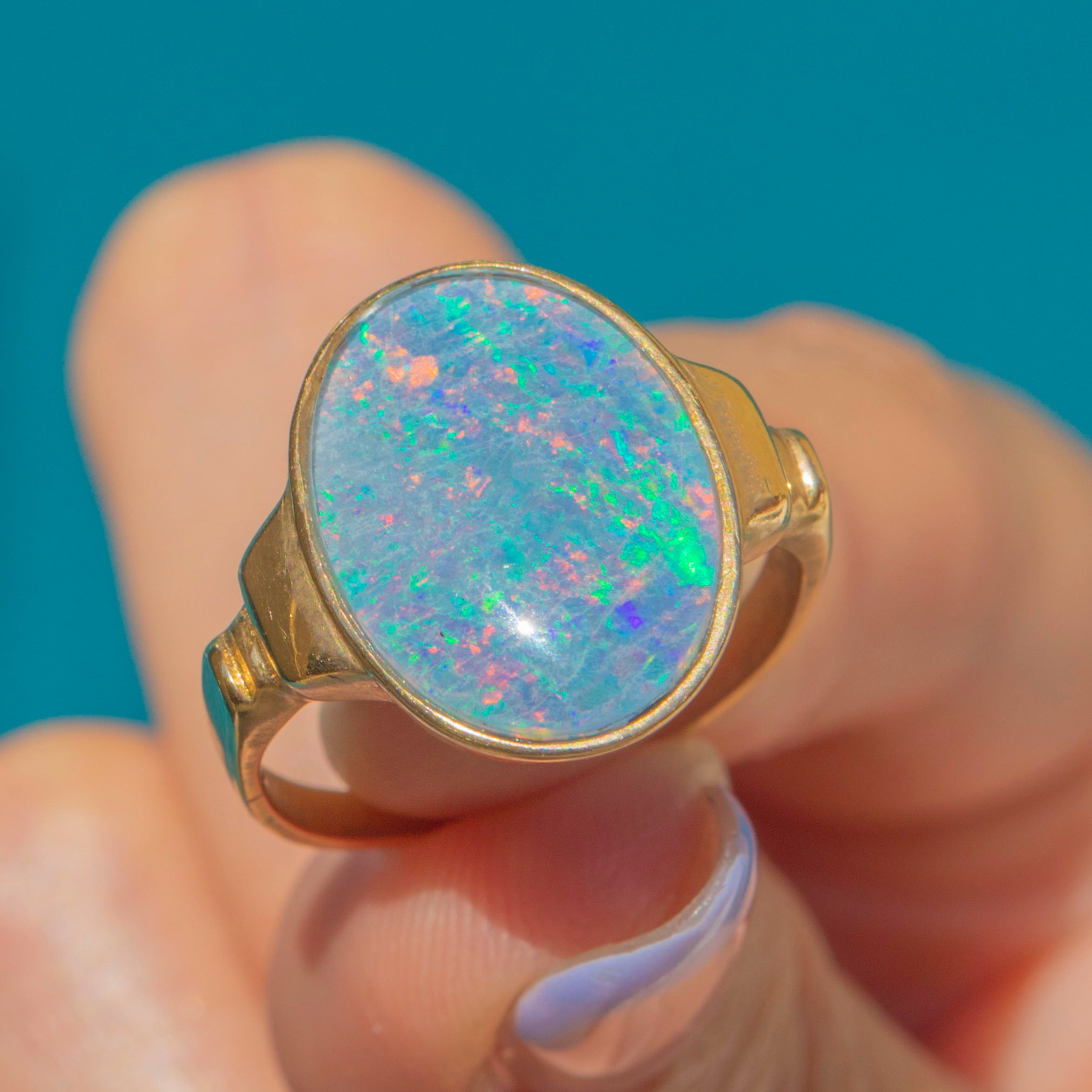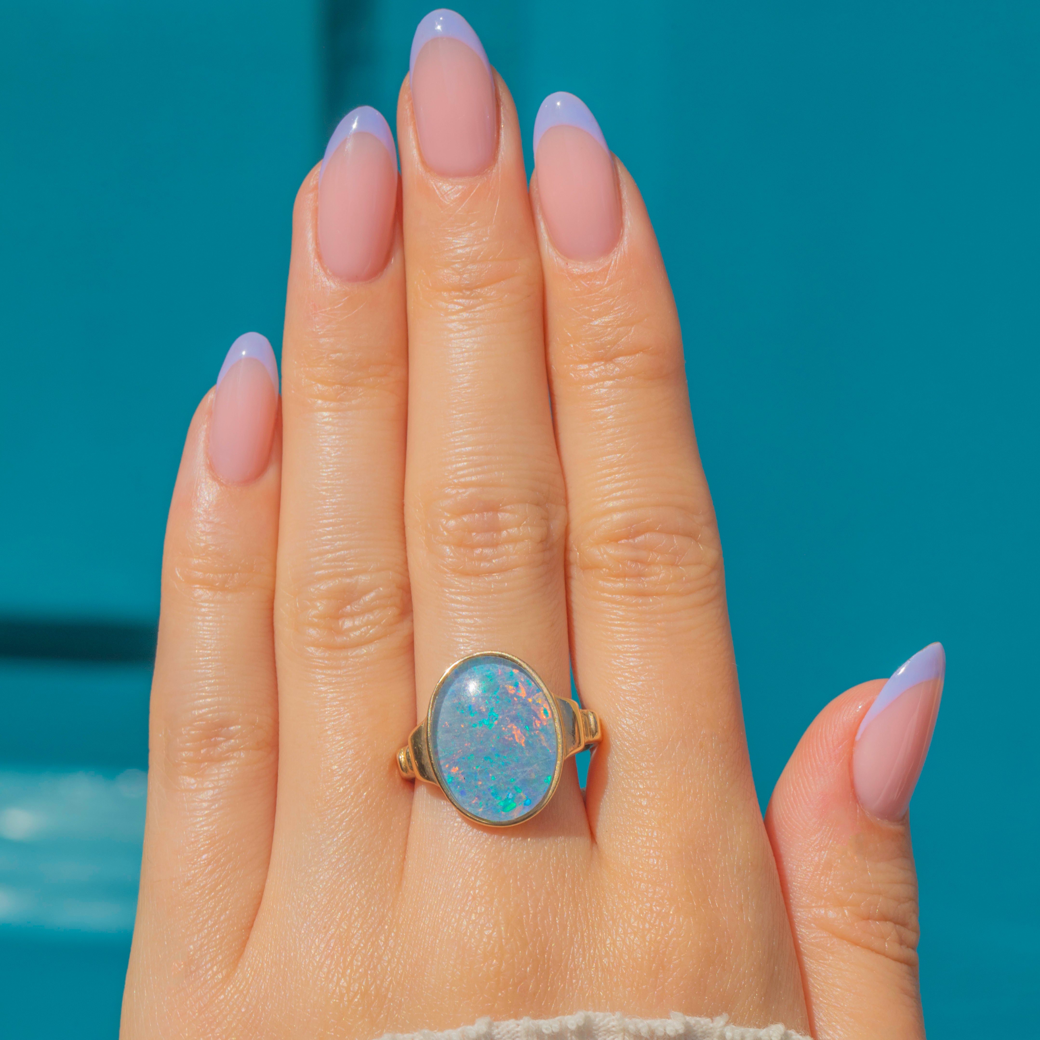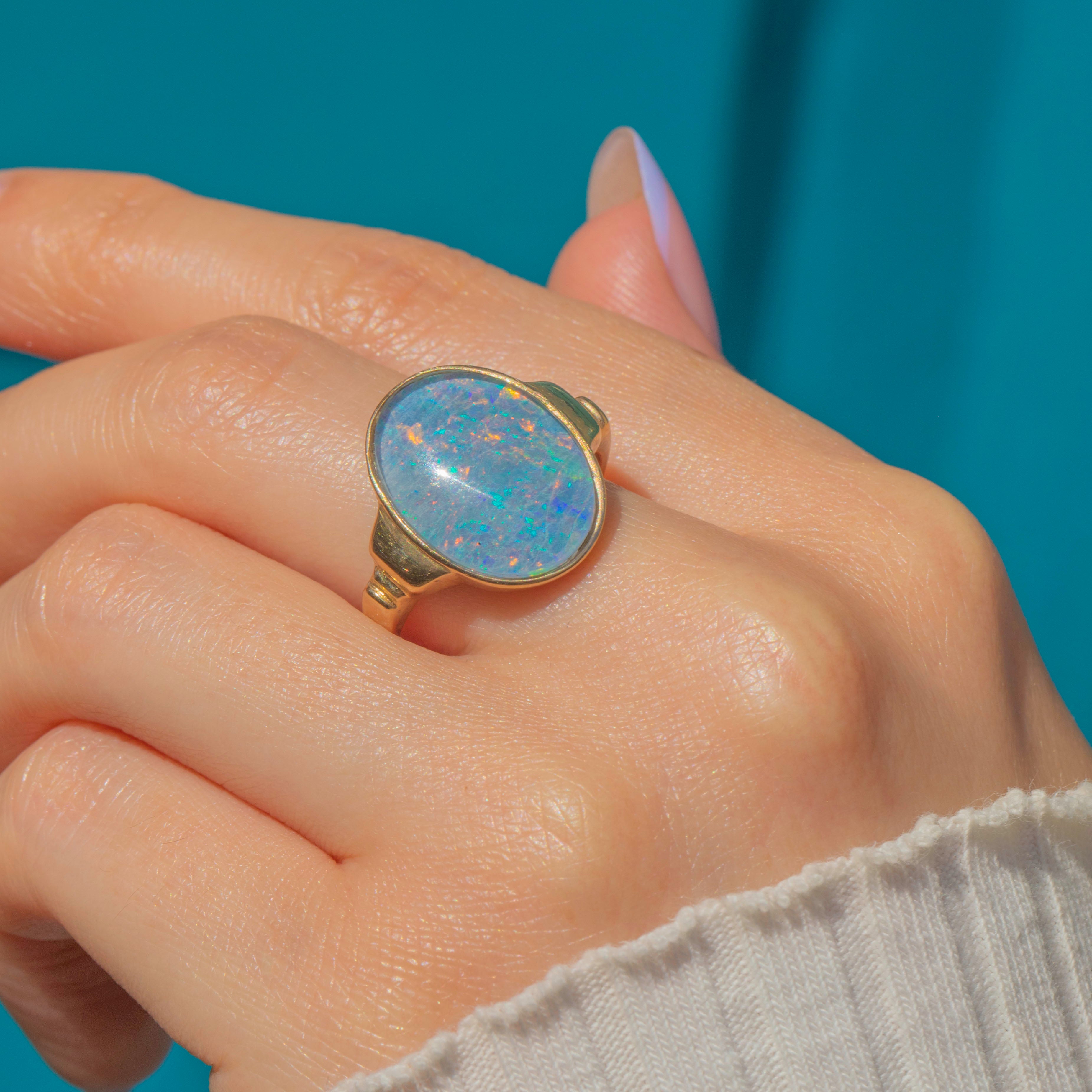 Crafted from buttery 14ct Gold, the Opal triplet sits firmly within her bezel and is flanked by bold geometric shoulders, giving this vintage ring an eye-catching finish. Providing exceptional finger coverage, this vintage Opal ring will instantly bring the wow factor to your outfit!
