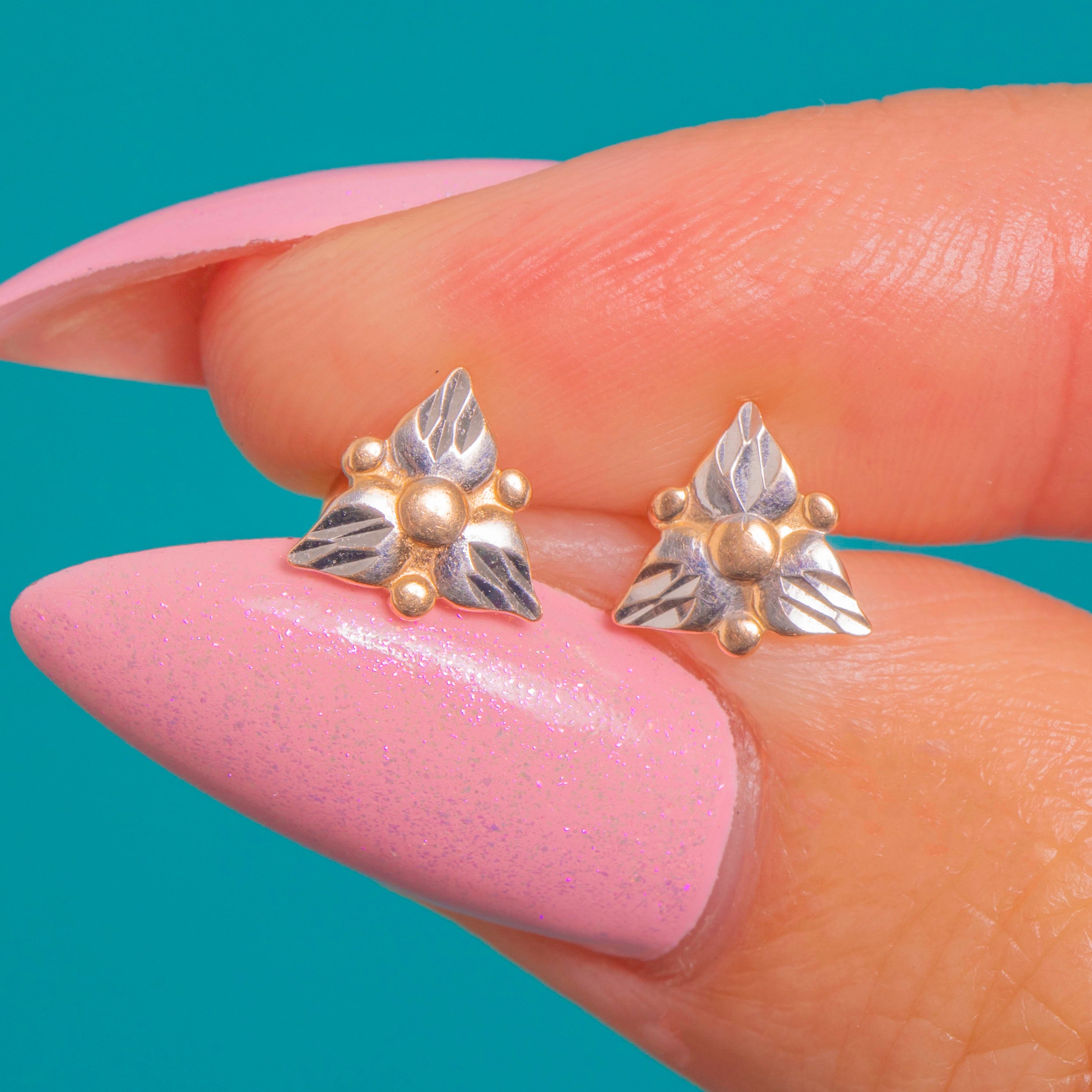 Petite yet beautifully detailed, these Vintage trefoil stud earrings are crafted in two-tone 14ct Rose & White Gold. Three softly contoured, leaf-like petals frame a raised domed centre, with delicate granule accents adding texture and sparkle. Fine engraved veining brings a graceful, botanical feel to this refined miniature design.