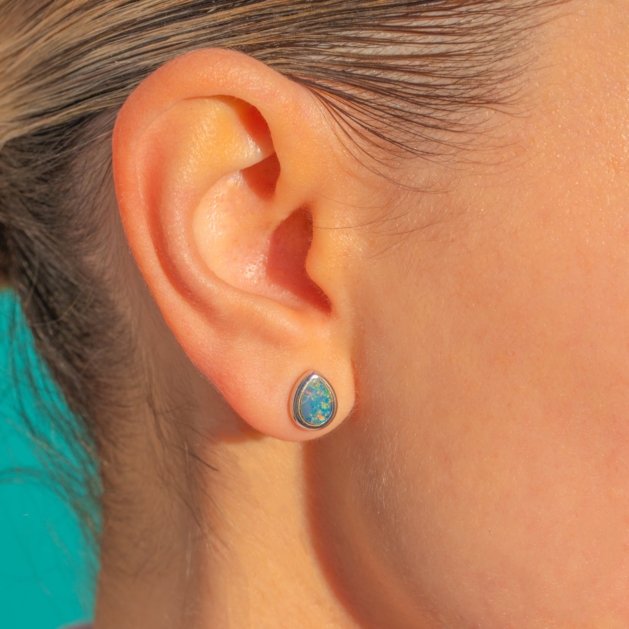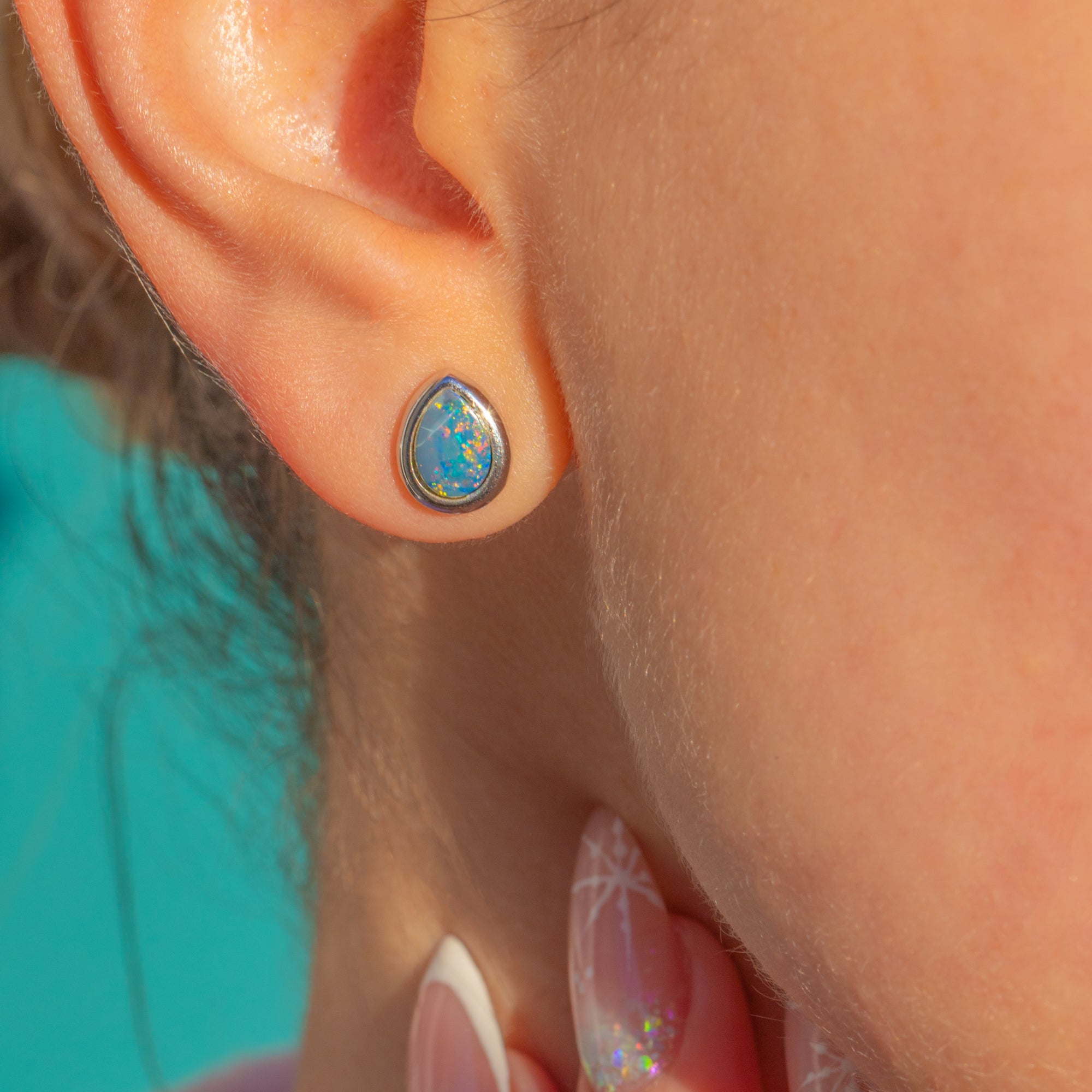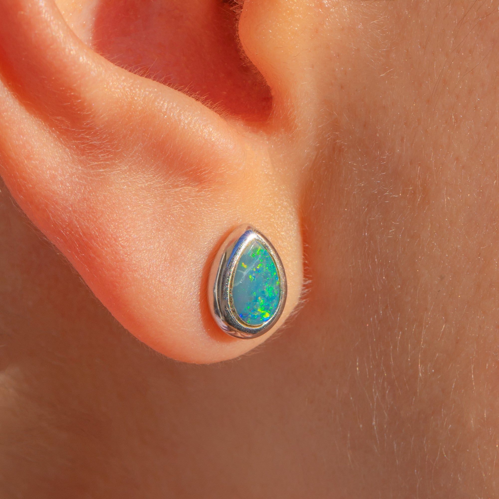 The Opals (likely doublets) are bright and glittering, sitting securely within smooth White Gold bezels. Lightweight and easy to wear, they make a gorgeous everyday choice.