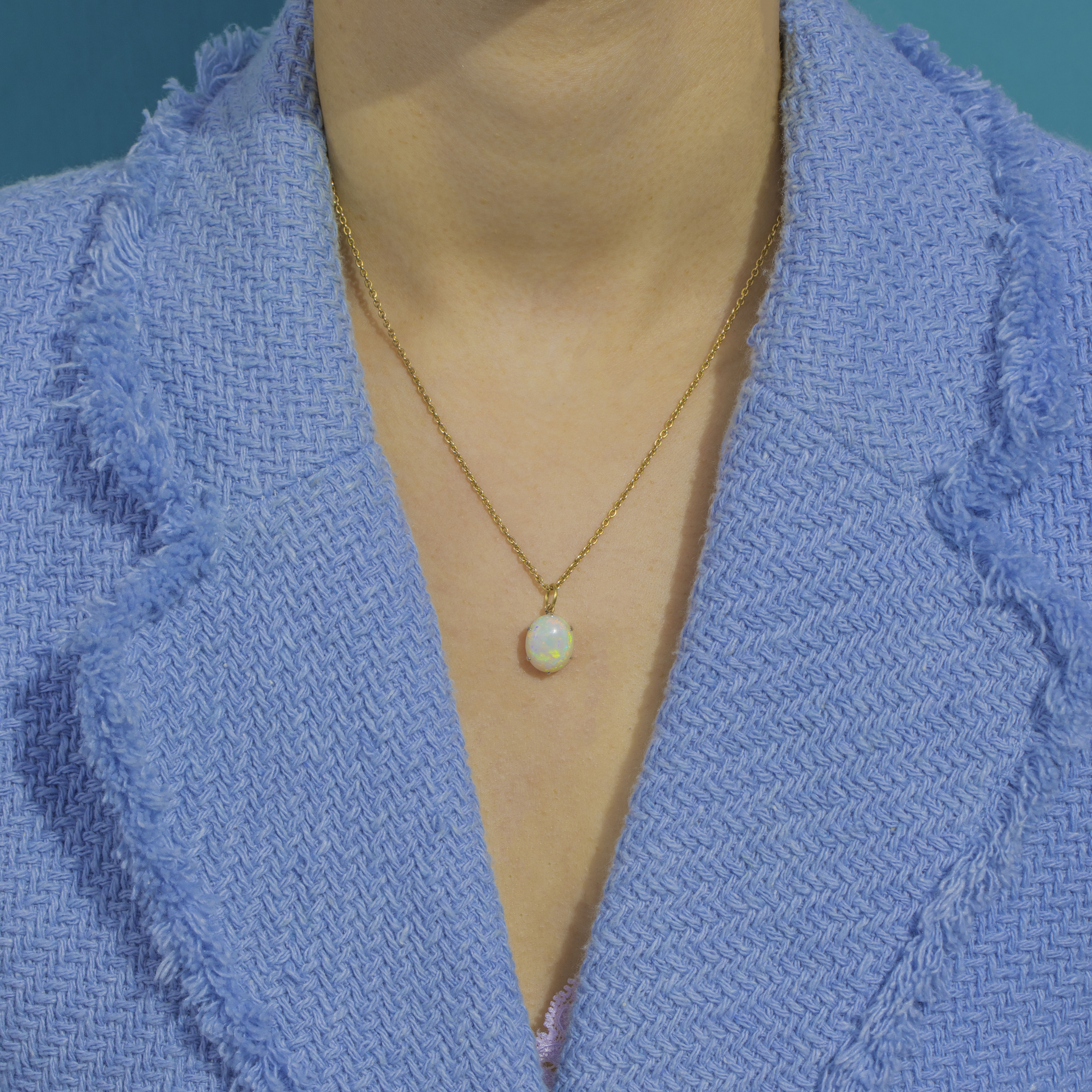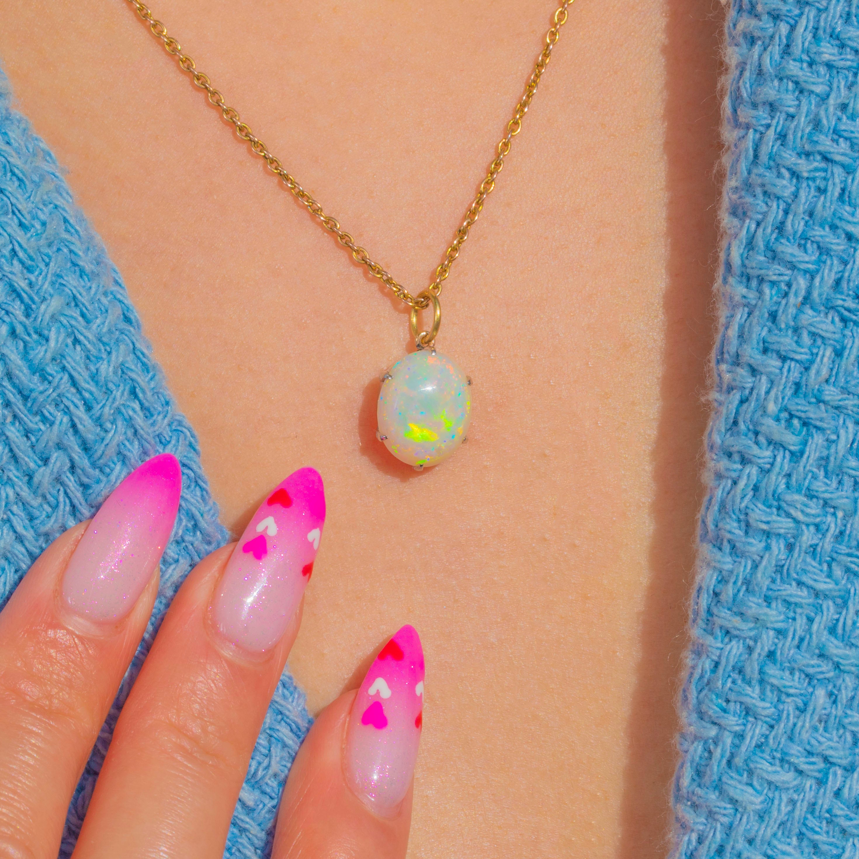 A luminous Opal cabochon takes centre stage in this sleek Vintage charm, alive with flashes of emerald green, electric blue, warm golden orange and delicate pink. Its minimalist solitaire design lets the gemstone’s captivating play-of-colour sing, a timeless piece you’ll reach for again and again.