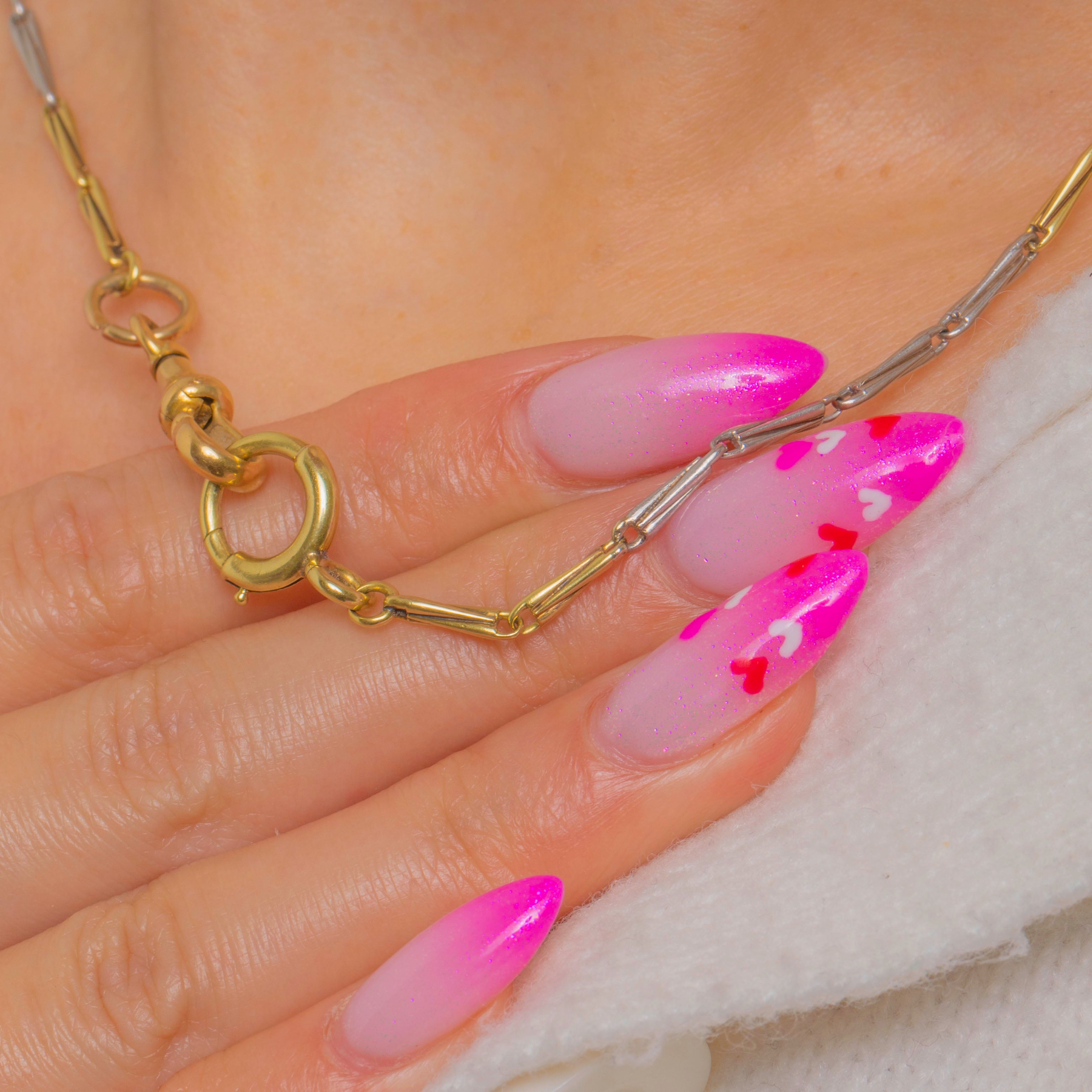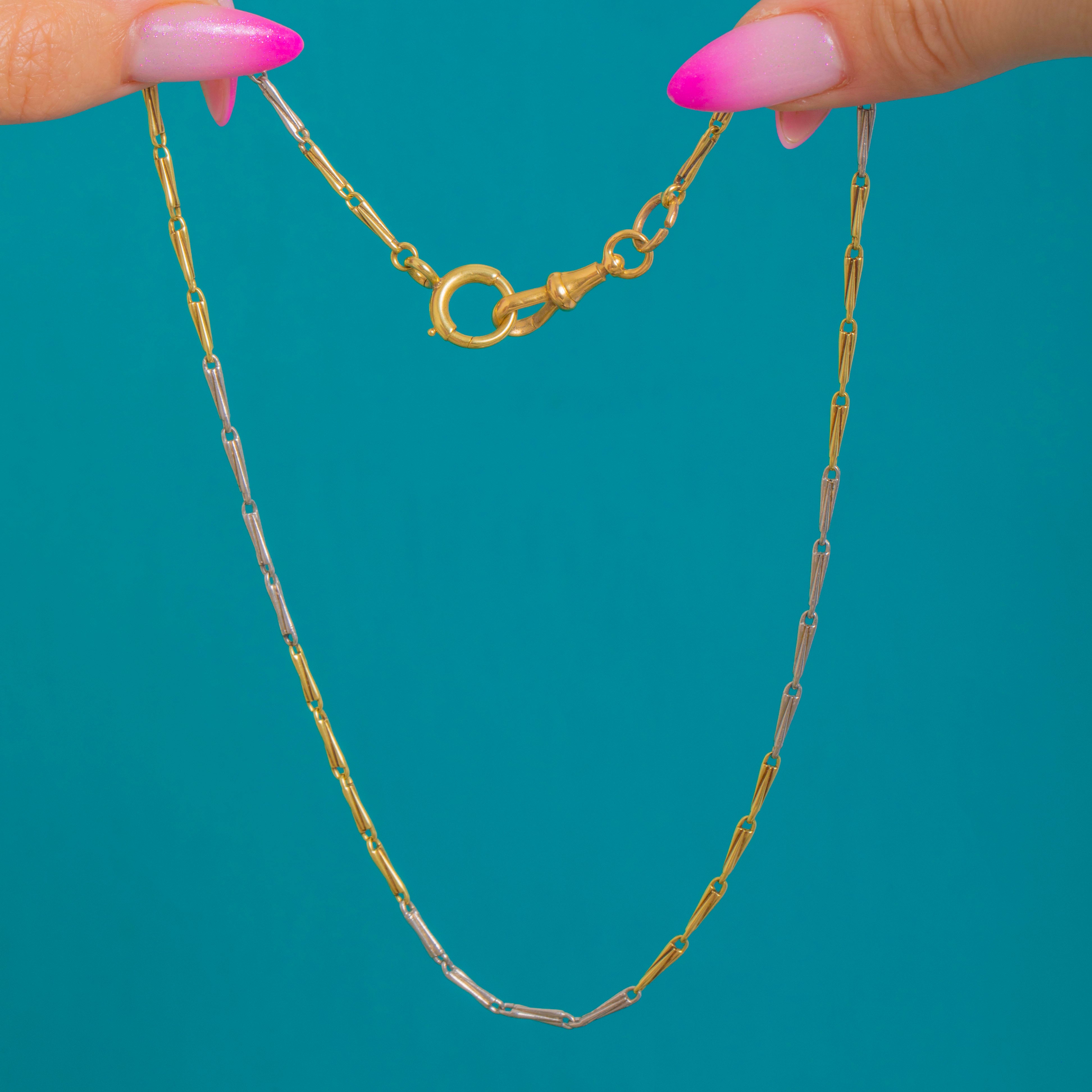 A timeless Victorian fancy chain rendered in luxurious 18ct Yellow Gold and Platinum. Alternating elongated bar links create a sleek geometric rhythm, the warm glow of Gold playing beautifully against cool Platinum for an effortlessly elegant two-tone look.
