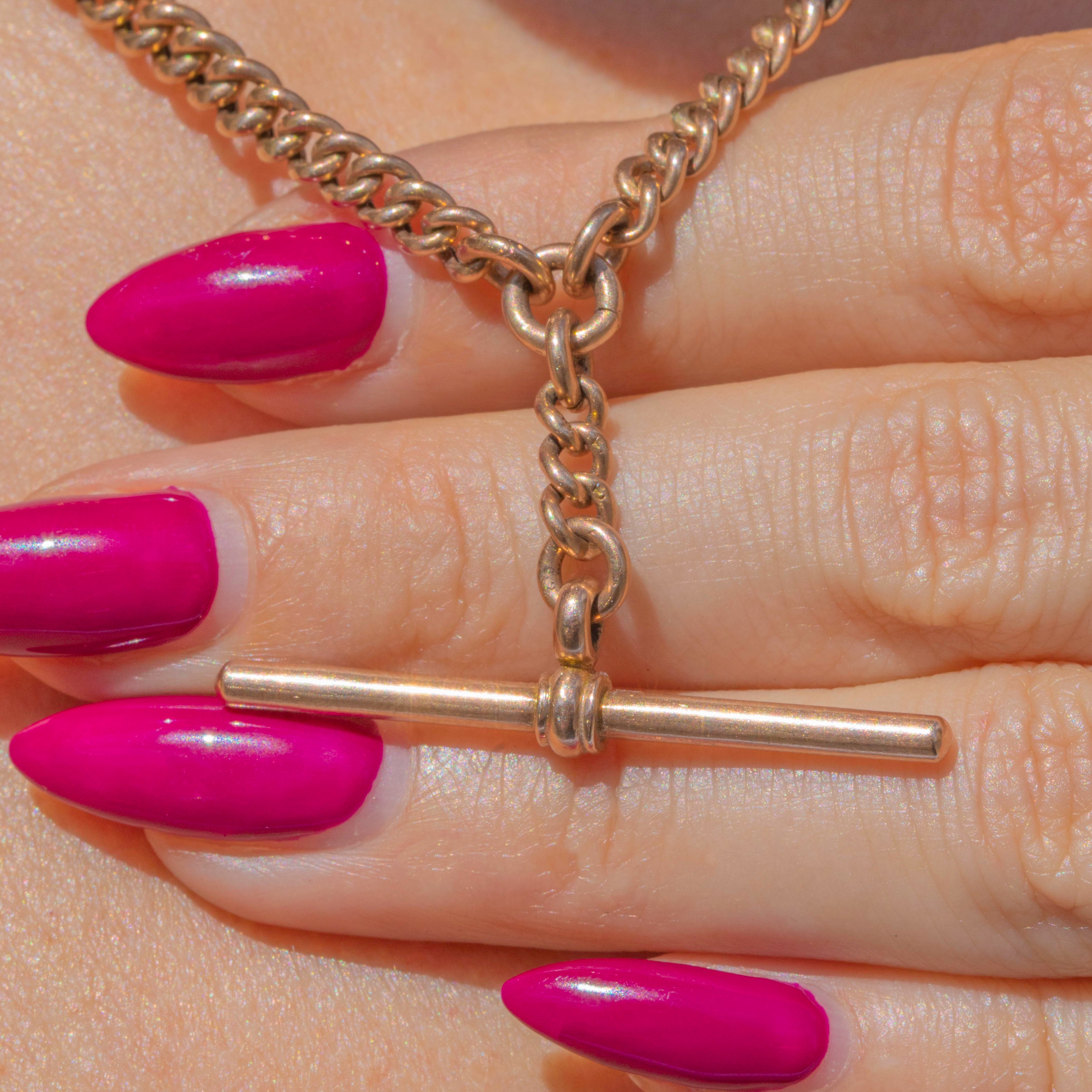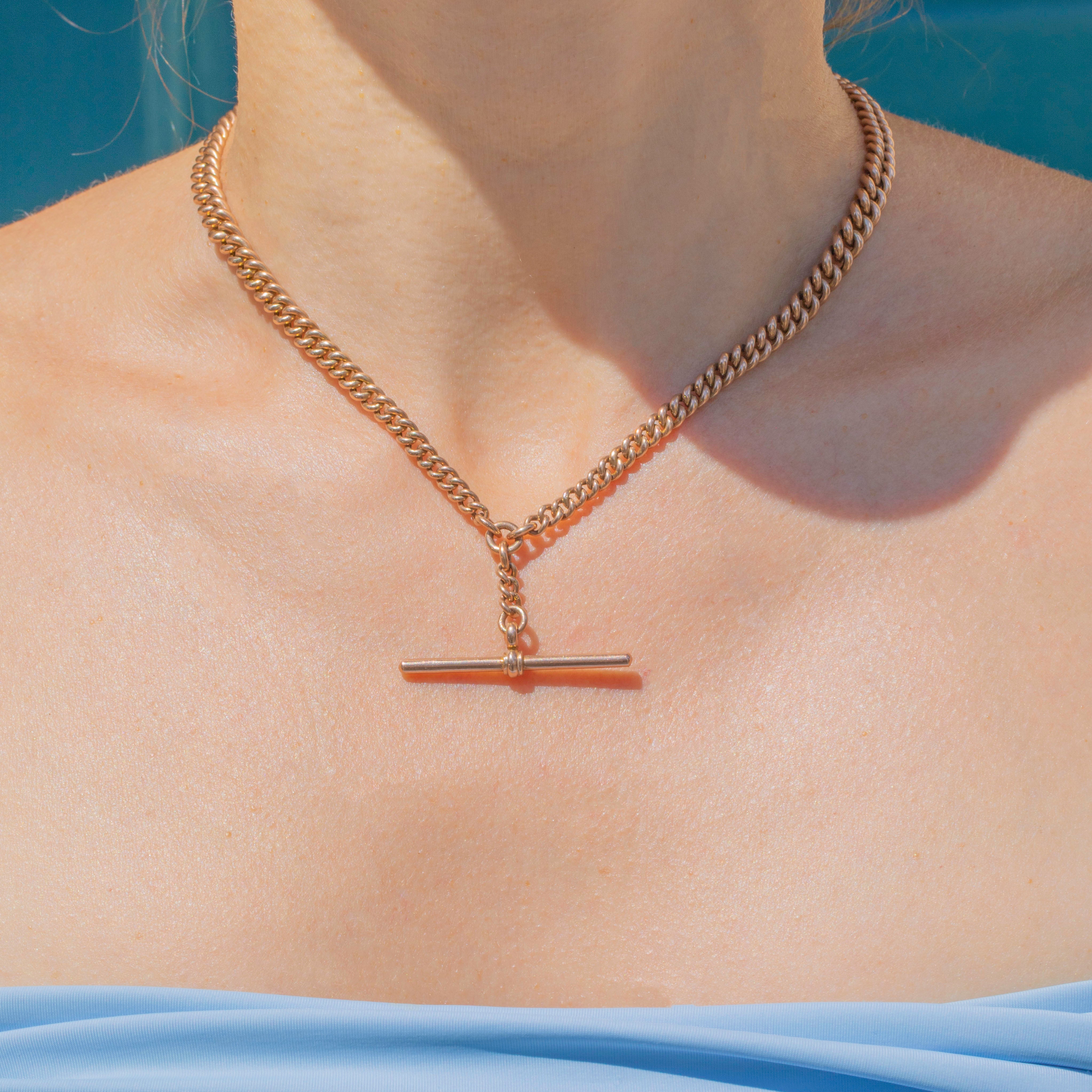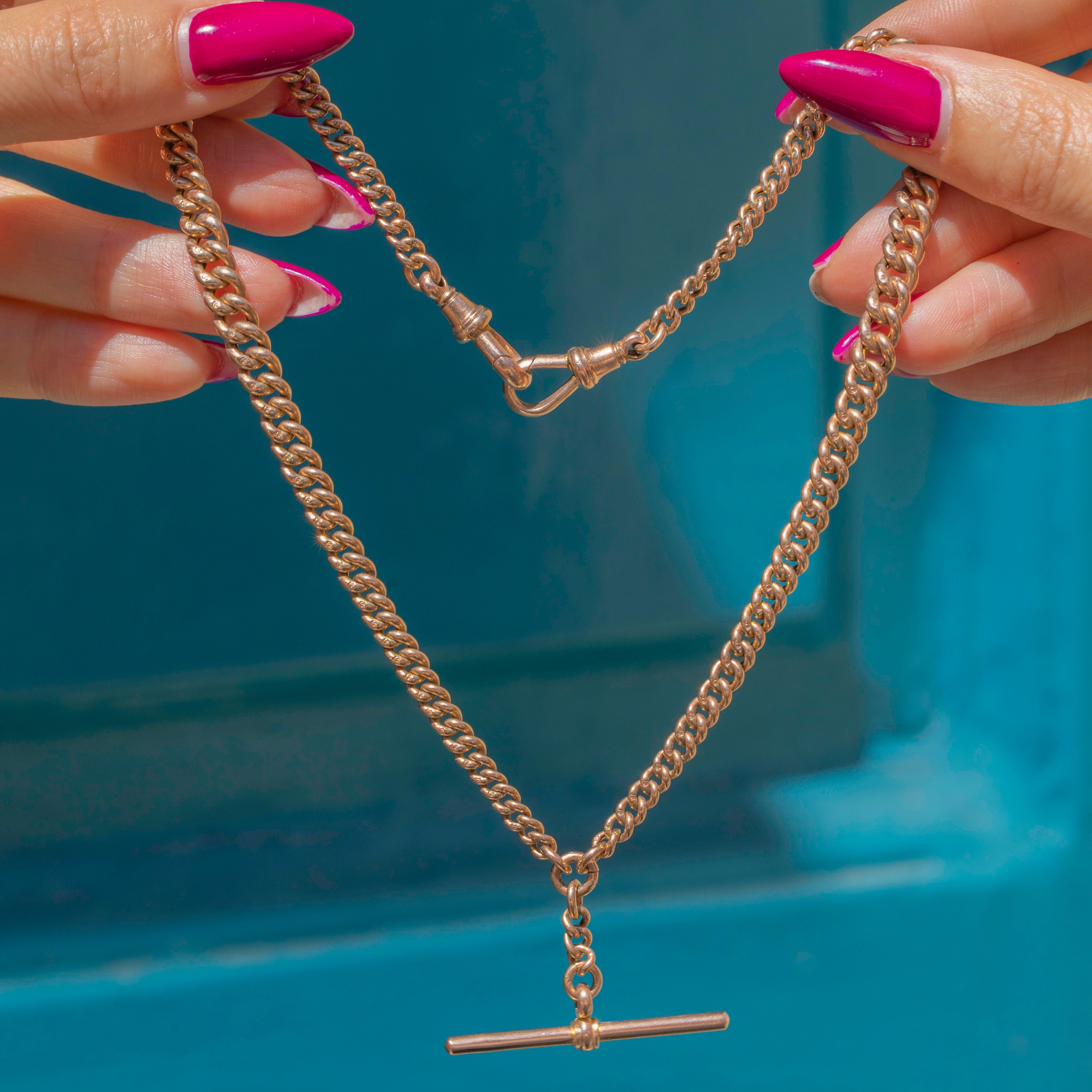 Crafted from glossy, warm 9ct Rose Gold, this Victorian Albert chain is complete with two dog-clips and centred by a large T-bar, making it a highly sought-after piece. Each chunky curb link has been stamped, an indicator of its high-quality nature.