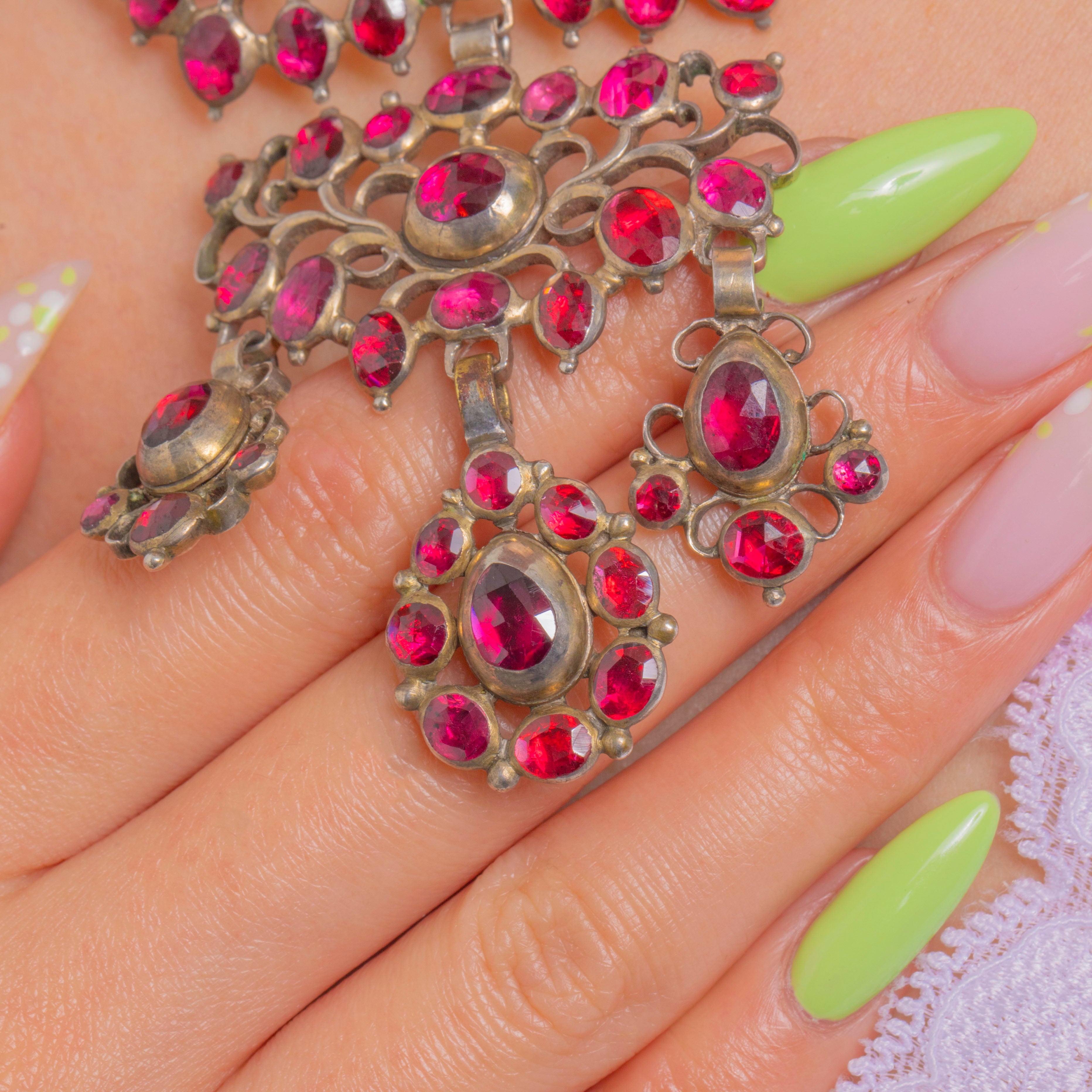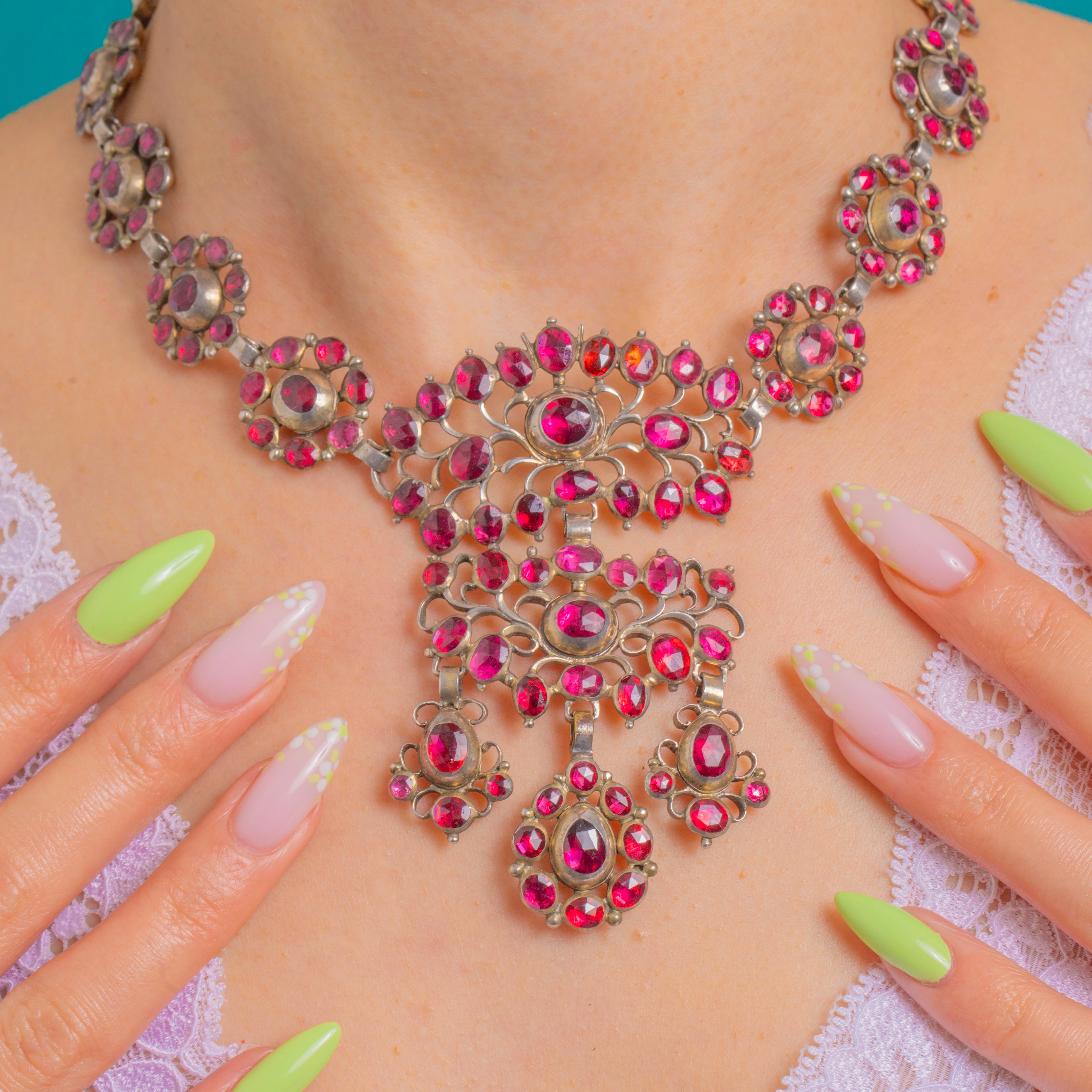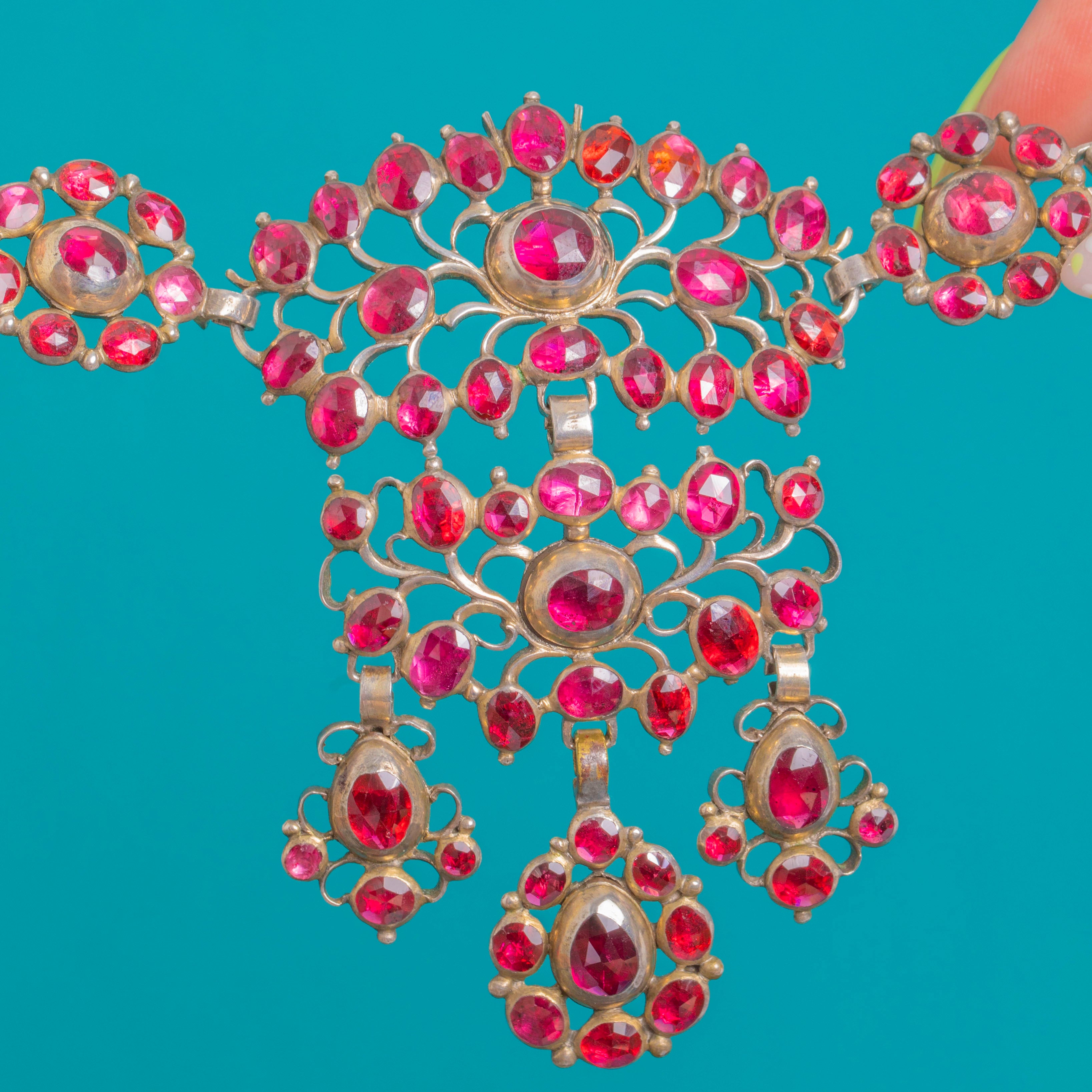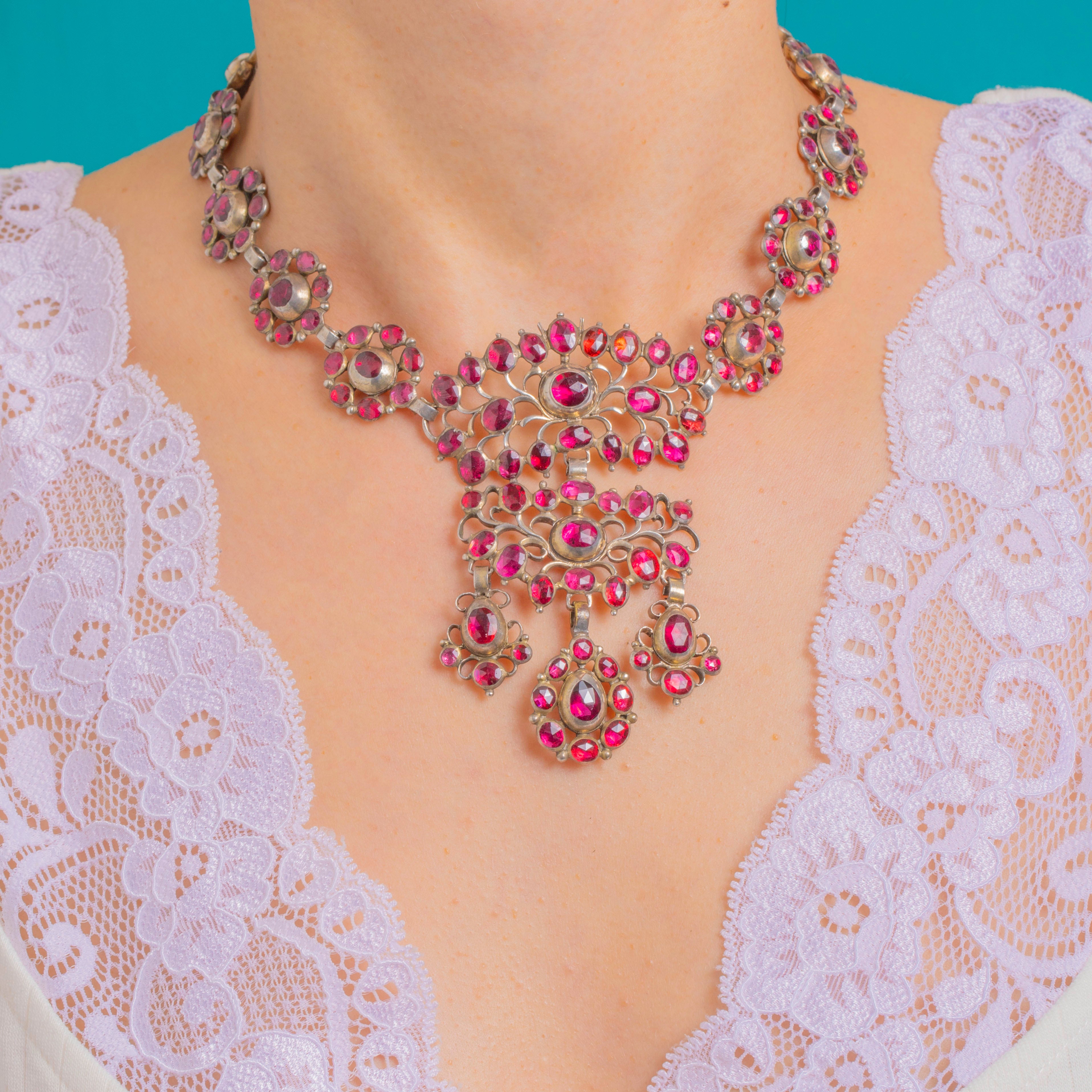 This spectacular Georgian Garnet necklace is an opulent, collar-grazing bib composed of rosette clusters and an openwork central plaque with three articulated drops. The Garnets glow a rich, wine-red and are arranged as rounds, ovals and pear-shaped drops in sumptuous halos for a dramatic, romantic presence at the neckline, totalling approximately 65.00cts.