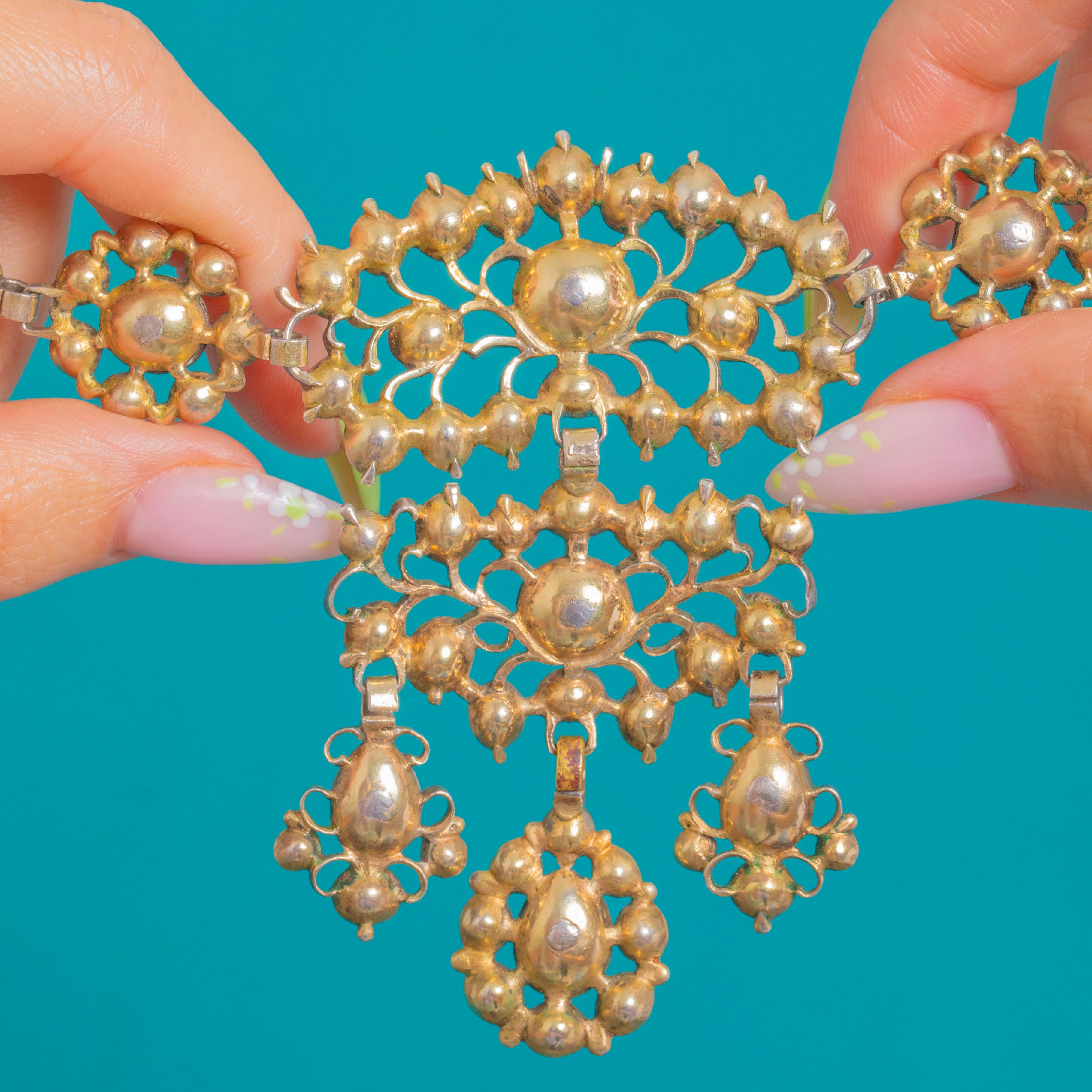 Each stone is closed-back and securely collet-set in Silver with 9ct Gold backing, the multi-part articulation allowing the necklace to drape and move beautifully. Foliate scrolls, floral rosettes and the classic girandole silhouette epitomise refined Georgian grandeur and timeless evening elegance.