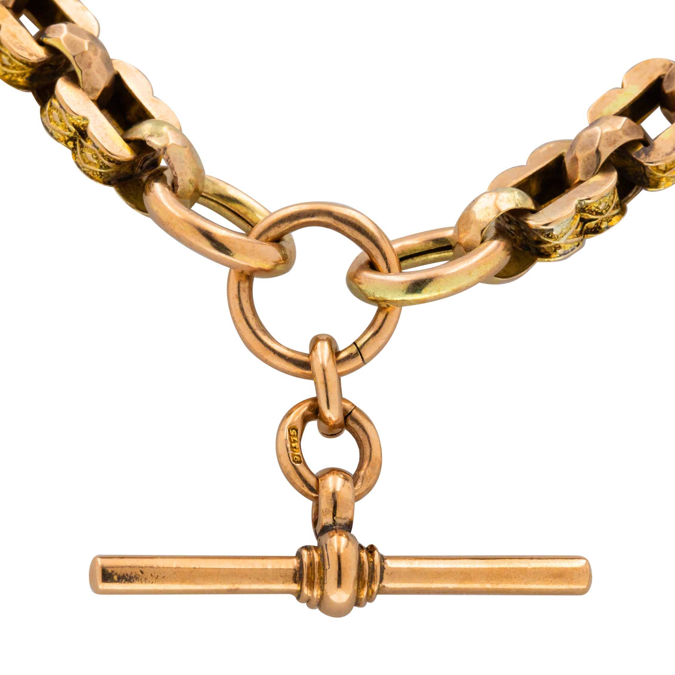 This Victorian 9ct Gold fancy link Albert chain exudes timeless elegance, featuring an authentic T-bar and matching dog clips! This chunky delight is crafted from 38 grams of solid, buttery 9ct Gold and will make a statement wherever she goes.