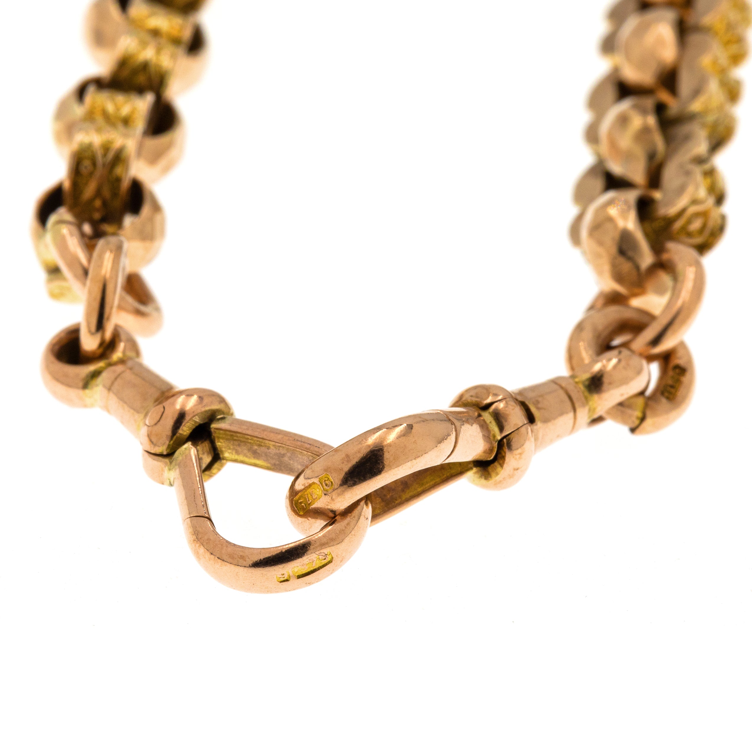 EXCELLENT. This Victorian 9ct Gold fancy link Albert chain is offered in excellent condition. The 9ct Gold is buttery and the engraved details have all reminded crisp. The links are all uniform and securely affixed, with no dings or dents to note. The dog clips are in perfect working condition allowing you to wear this phenomenal antique Gold chain with confidence!