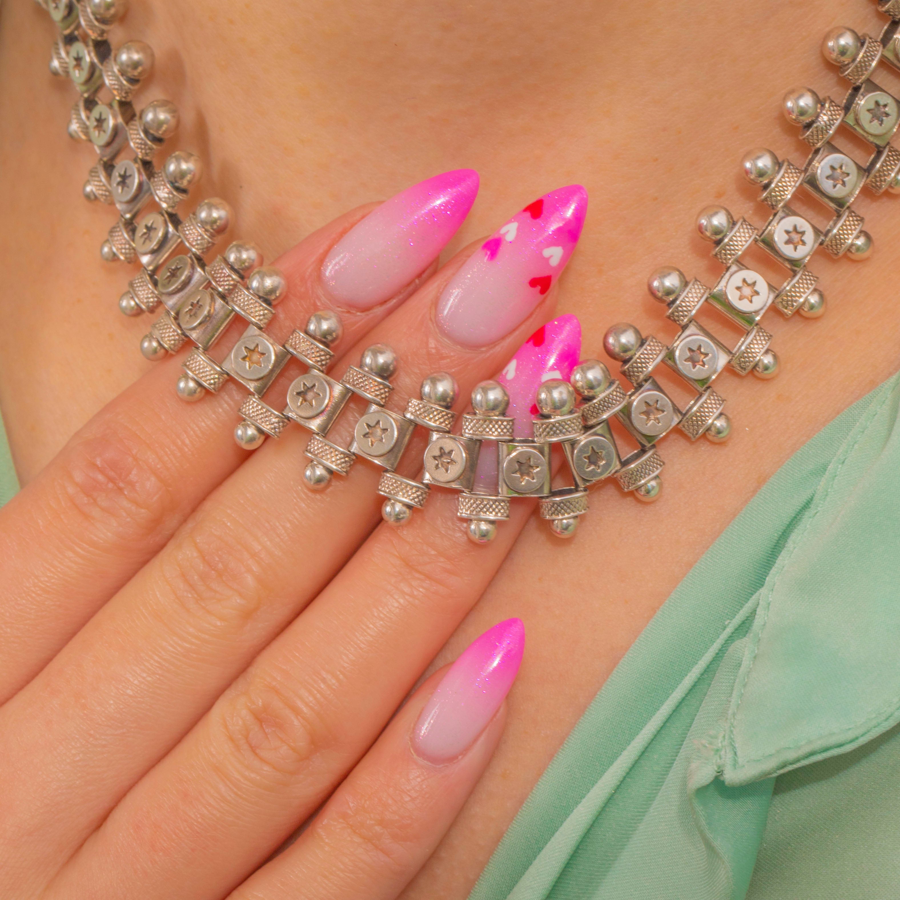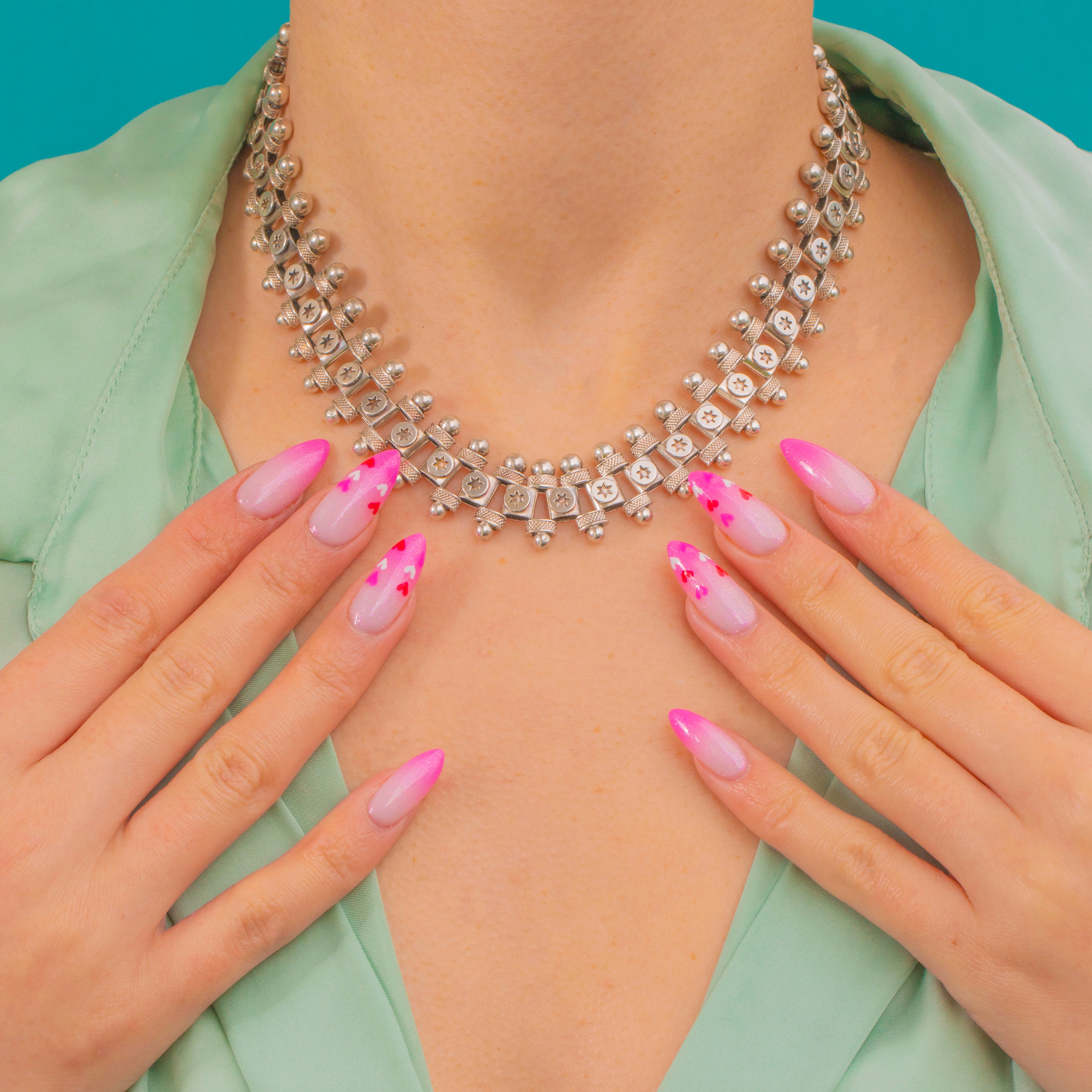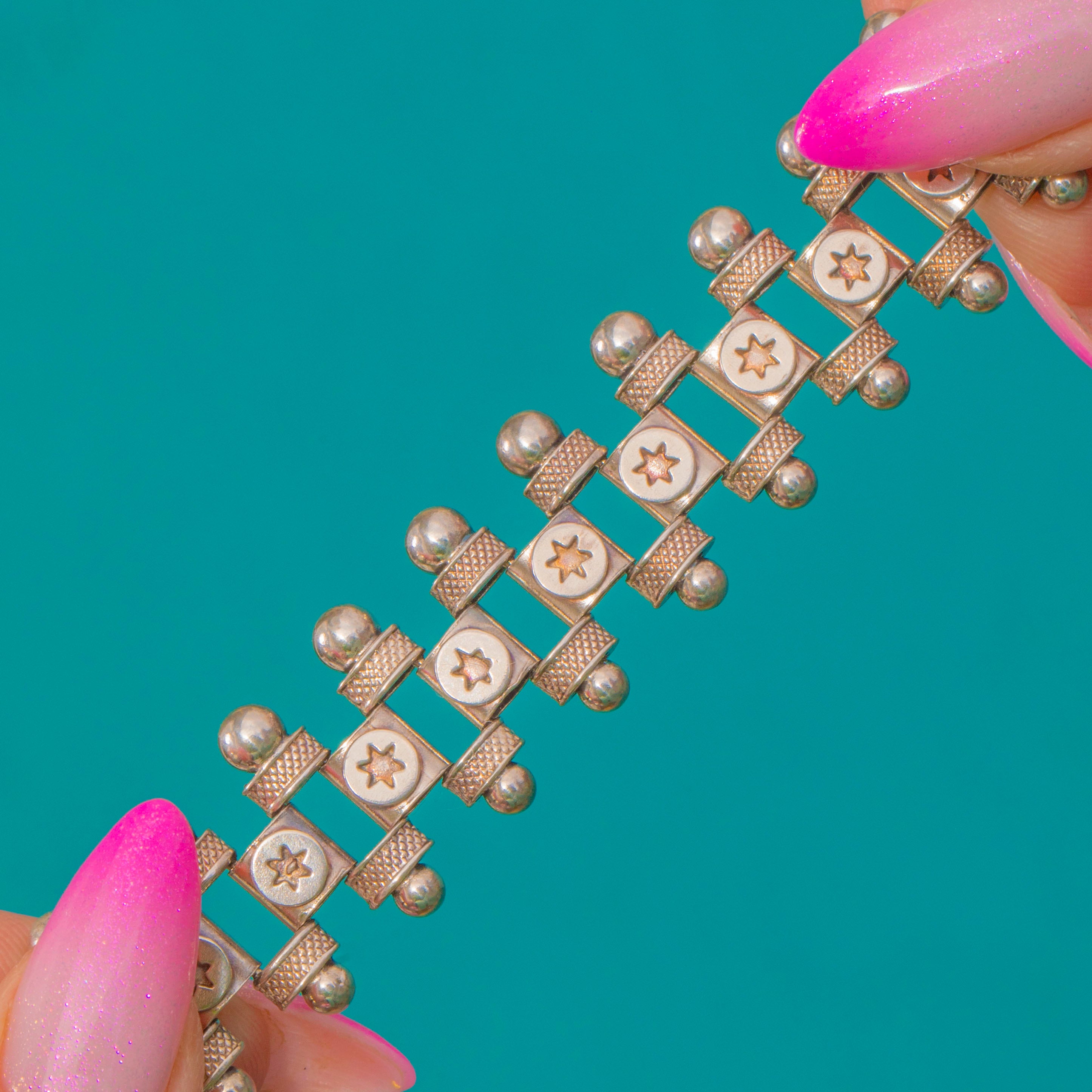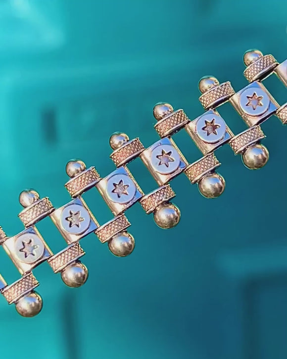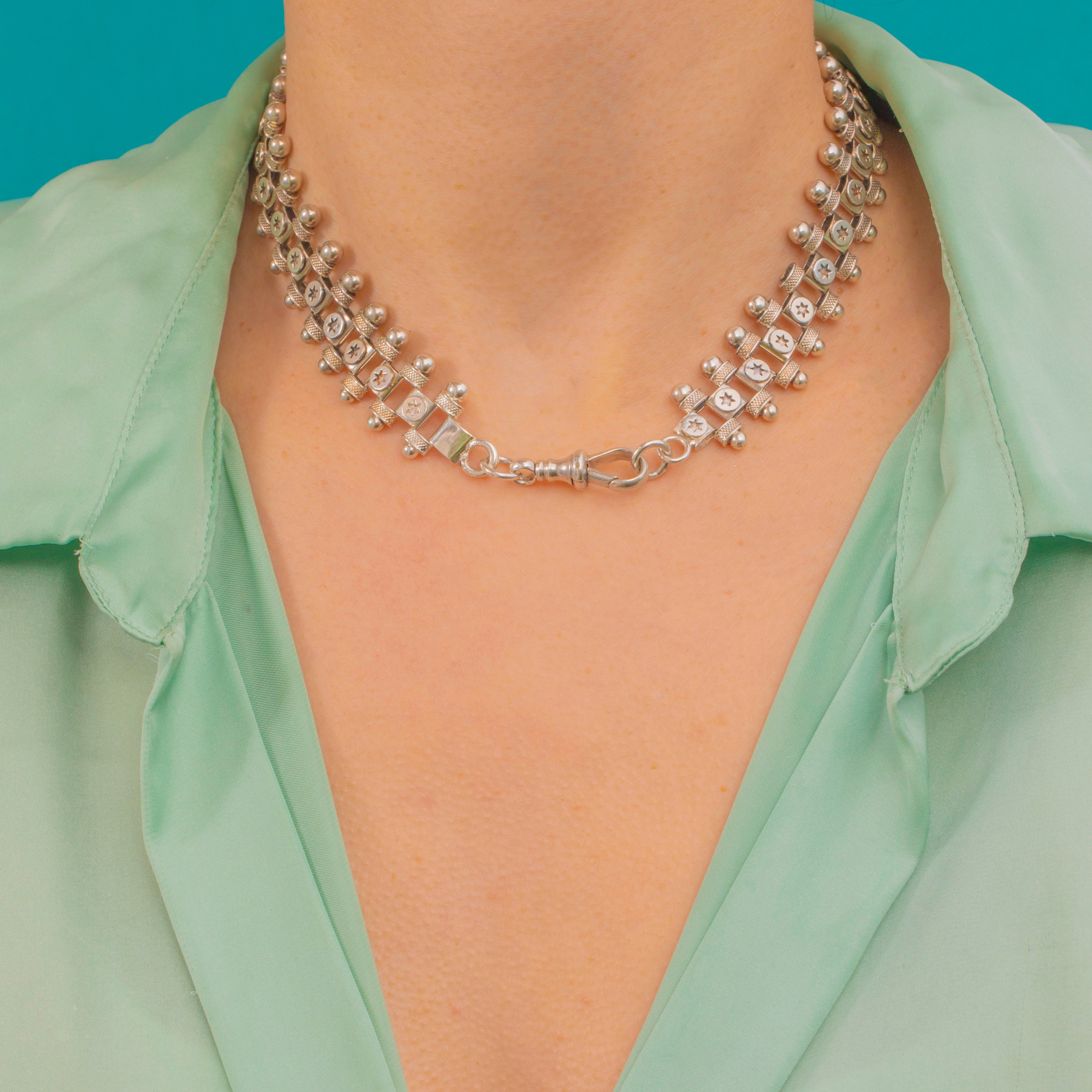 A striking Victorian Silver book chain collar composed of boldly articulated square links, each crisply punched with a star motif and bordered by textured collars with petite beaded finials. The geometry creates a rhythmic, architectural look that sits beautifully at the base of the neck, its bright Sterling Silver enhanced by gentle antique patina in the recesses.