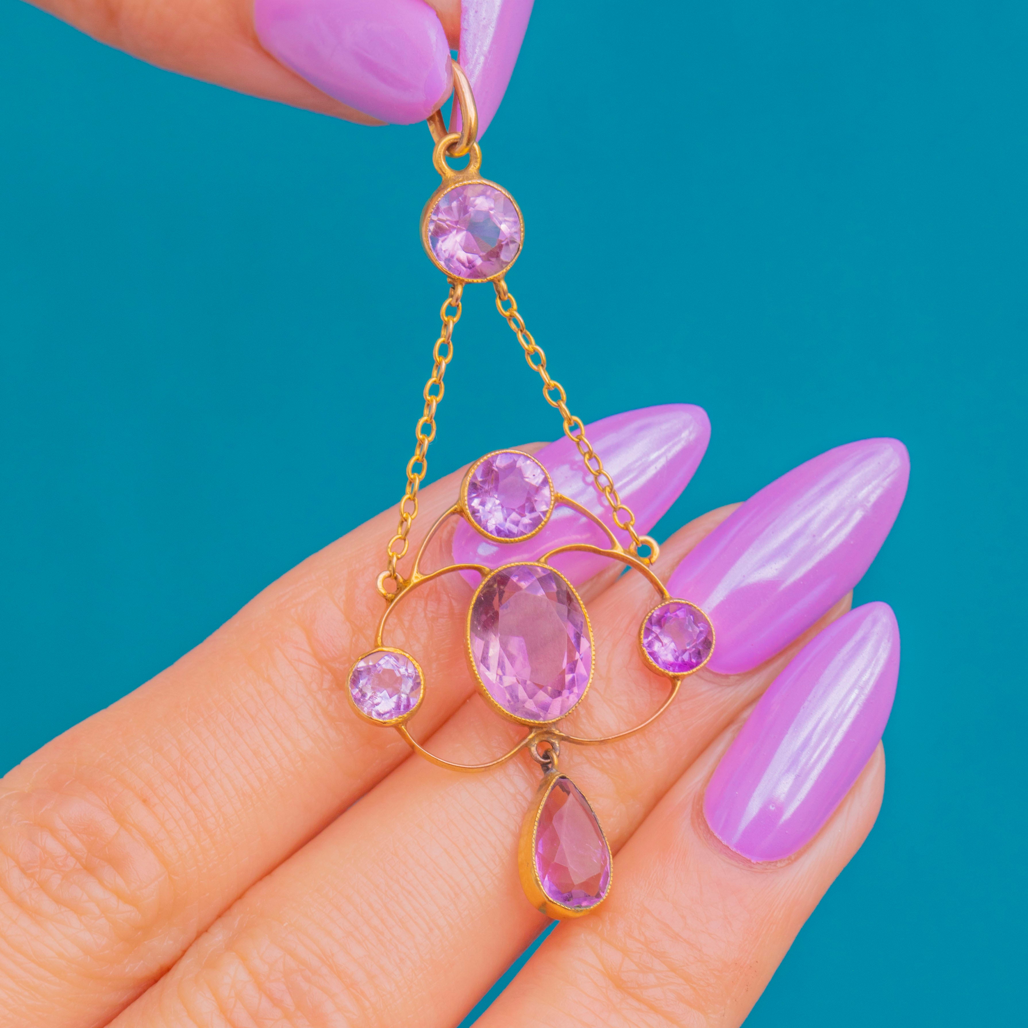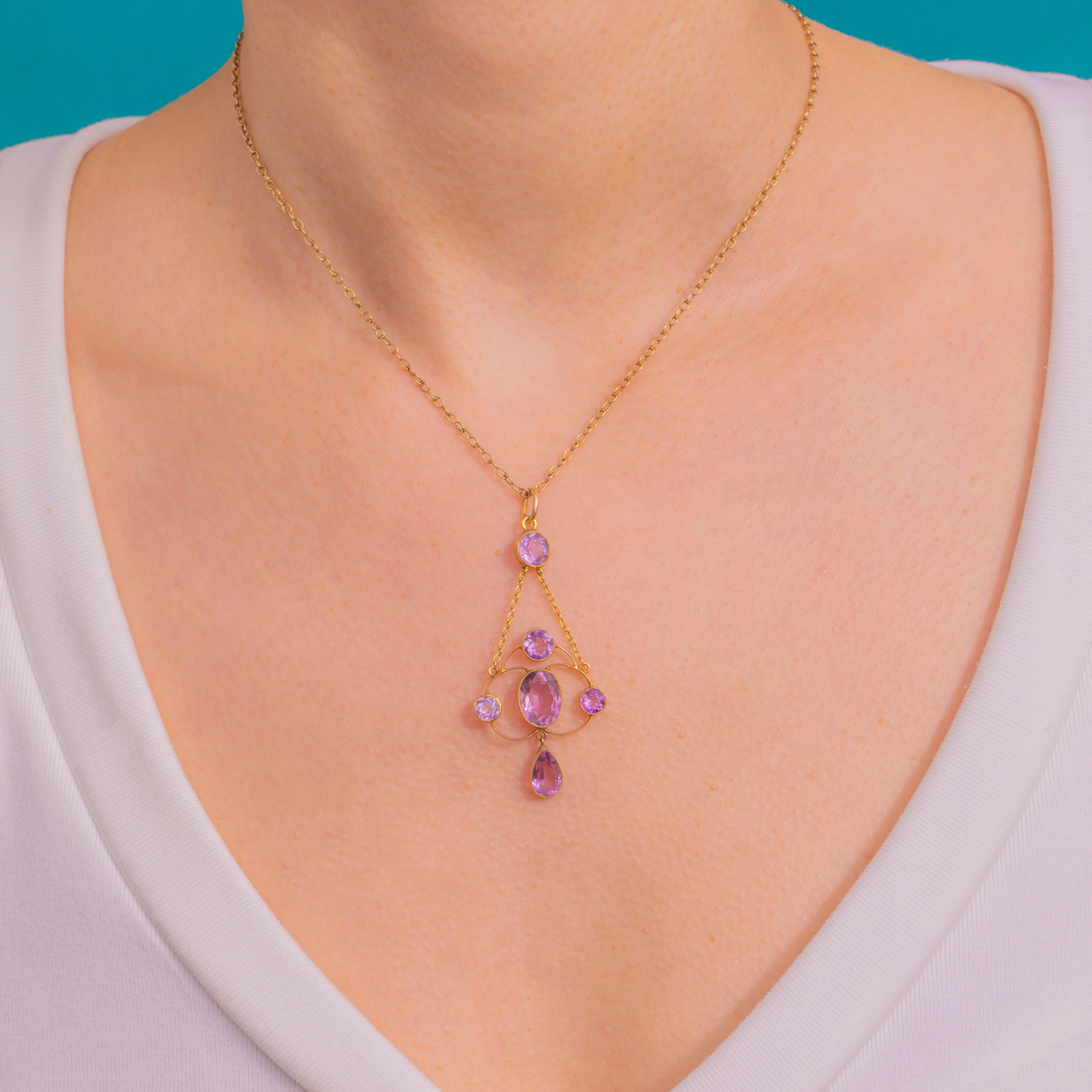Evoking the romance of the Edwardian era, this 15ct Gold Amethyst lavalier pendant drapes with graceful articulation and a whisper of movement. Soft lavender Amethysts glow against the warm Gold, lending an ethereal light to the neckline.
