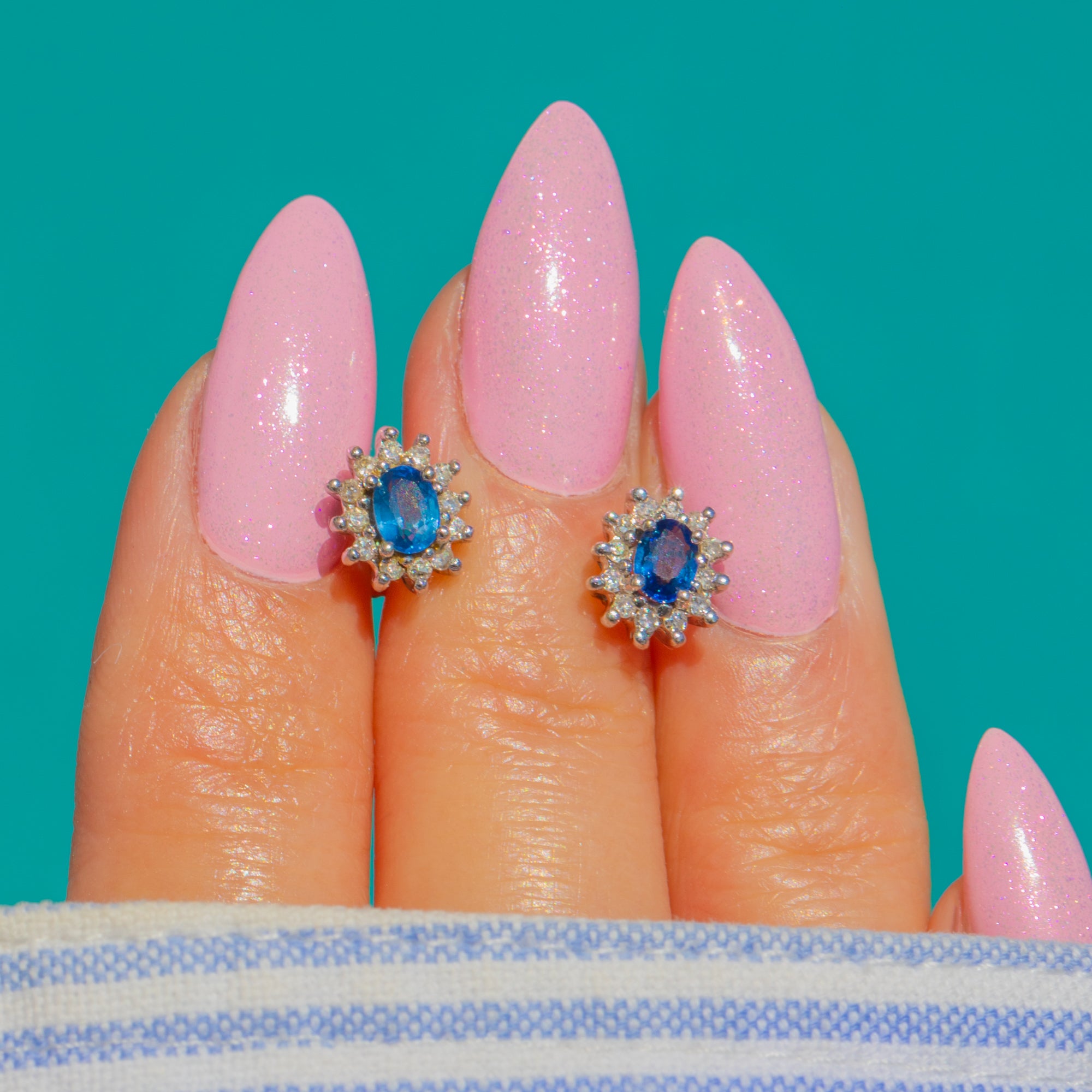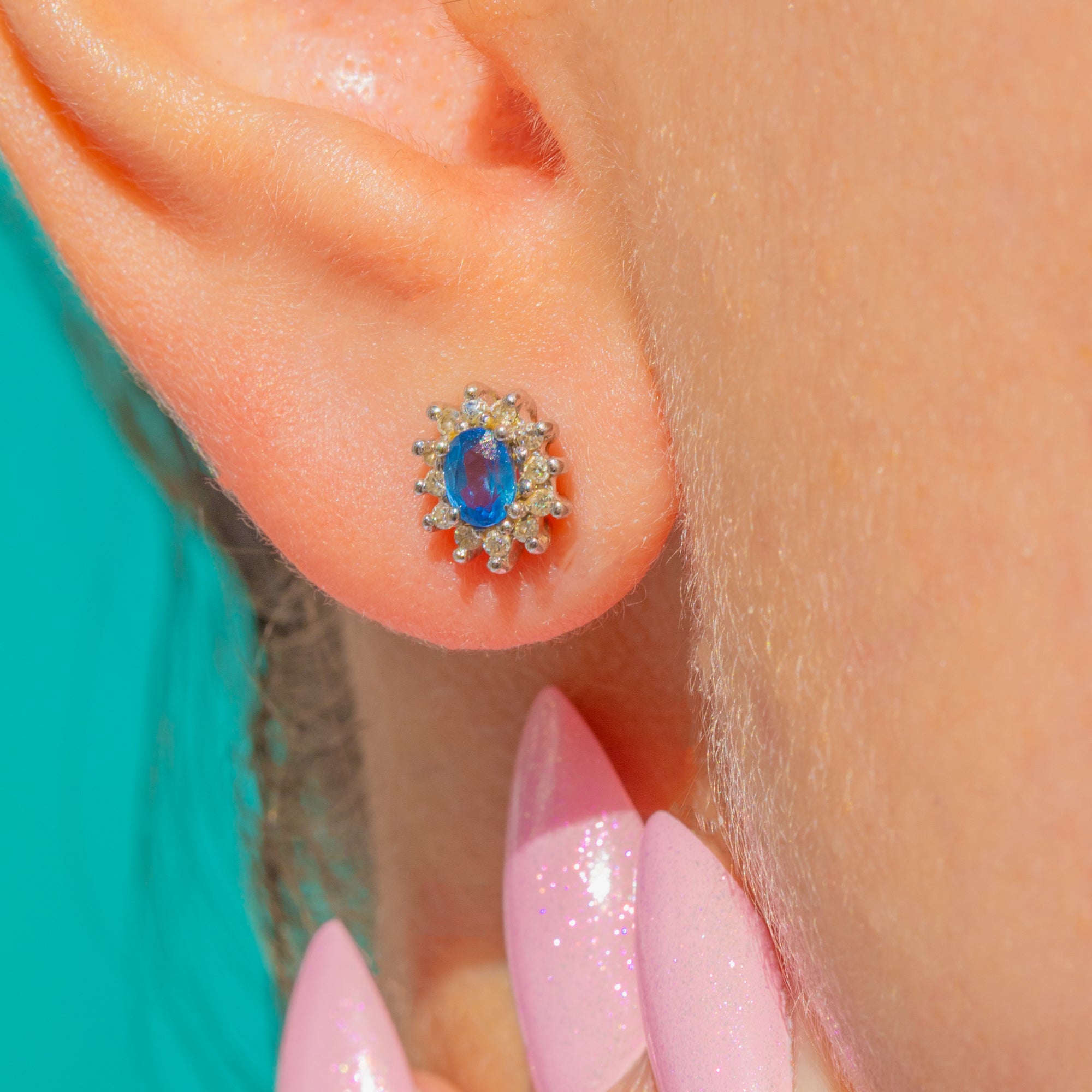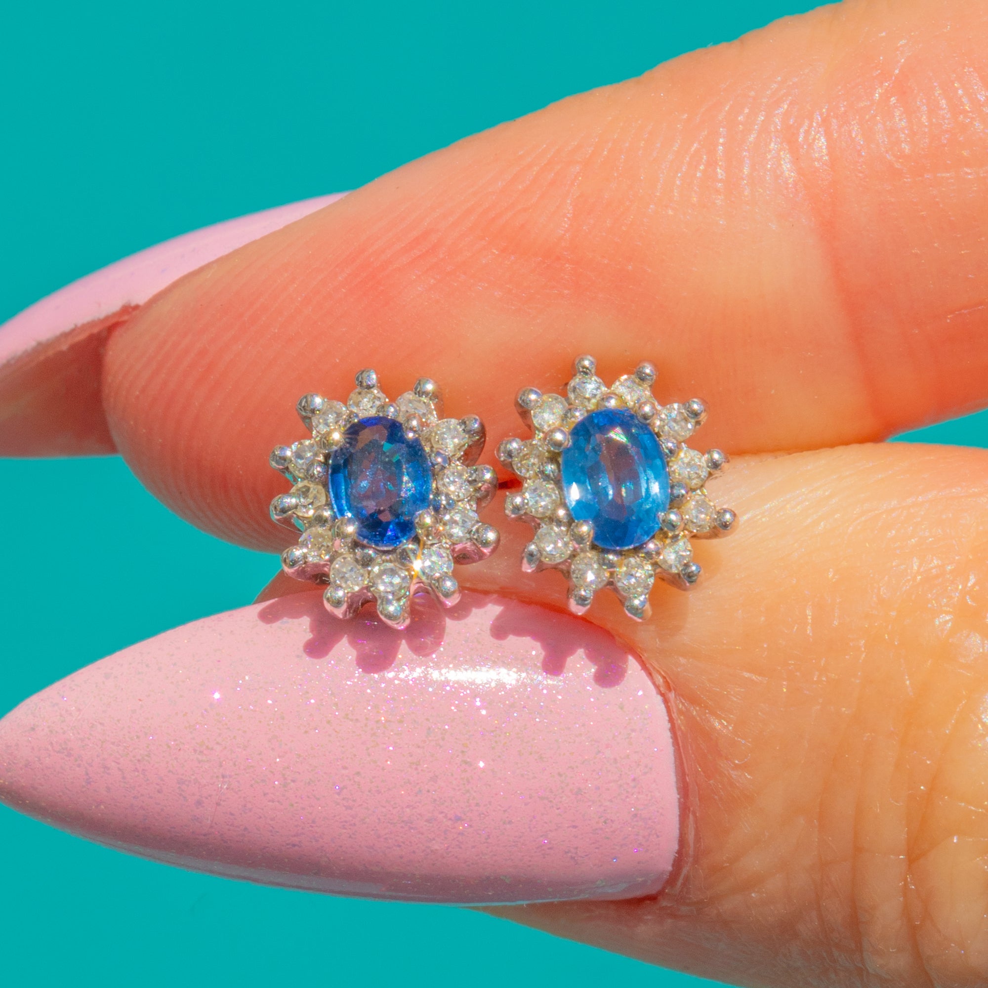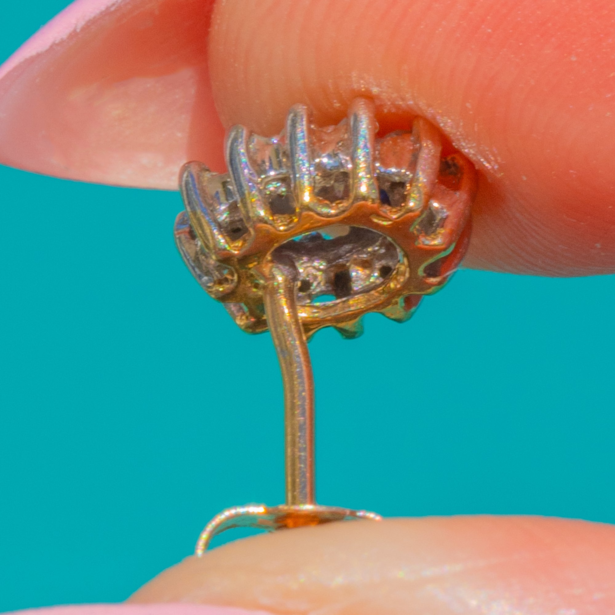 These vintage cluster stud earrings are a beautifully classic design, crafted in 15ct Gold and set with vivid Cornflower Blue Sapphires framed by a sparkling halo of Diamonds. The oval Sapphires bring a lovely depth of colour to the pair, while the surrounding Diamonds add brightness and delicacy.