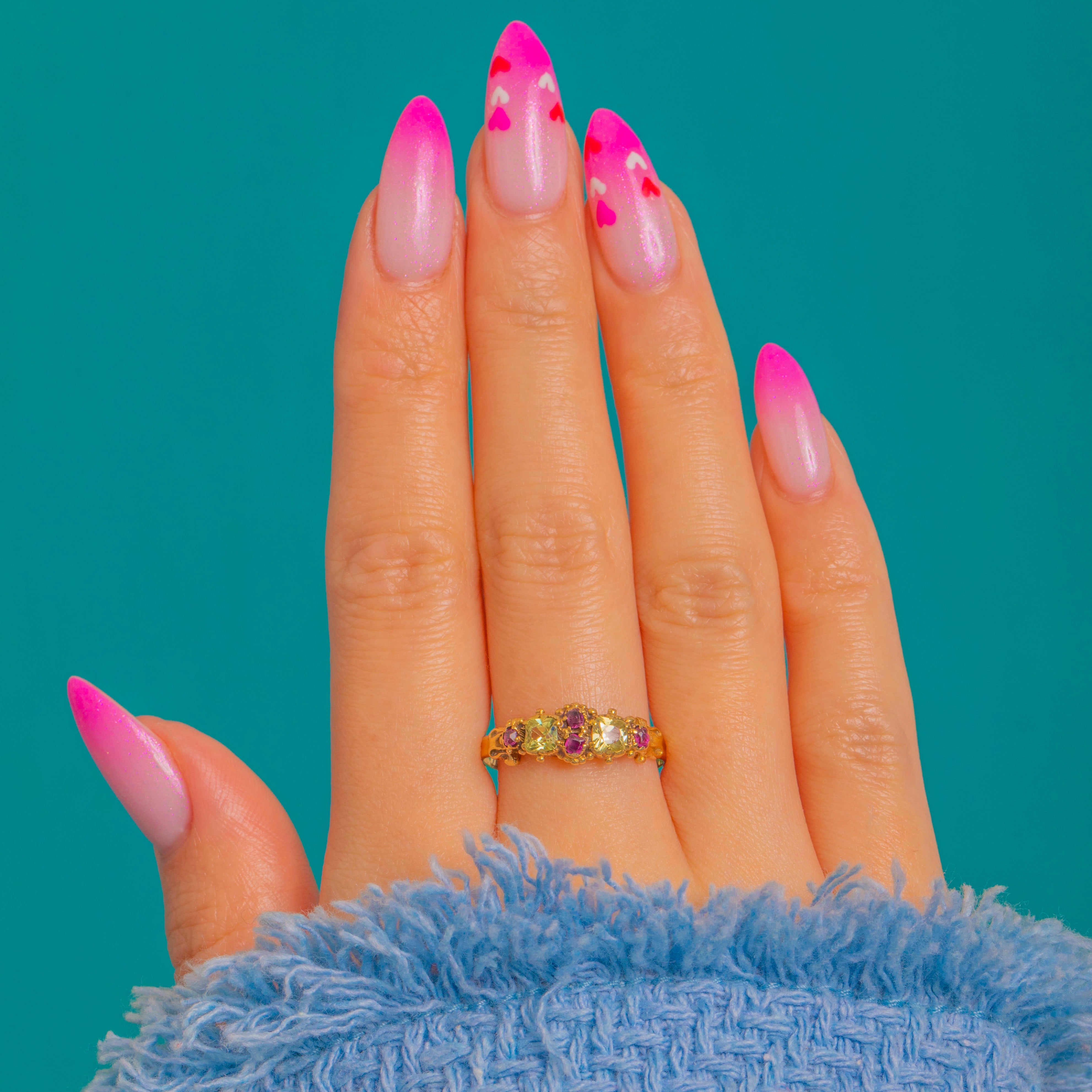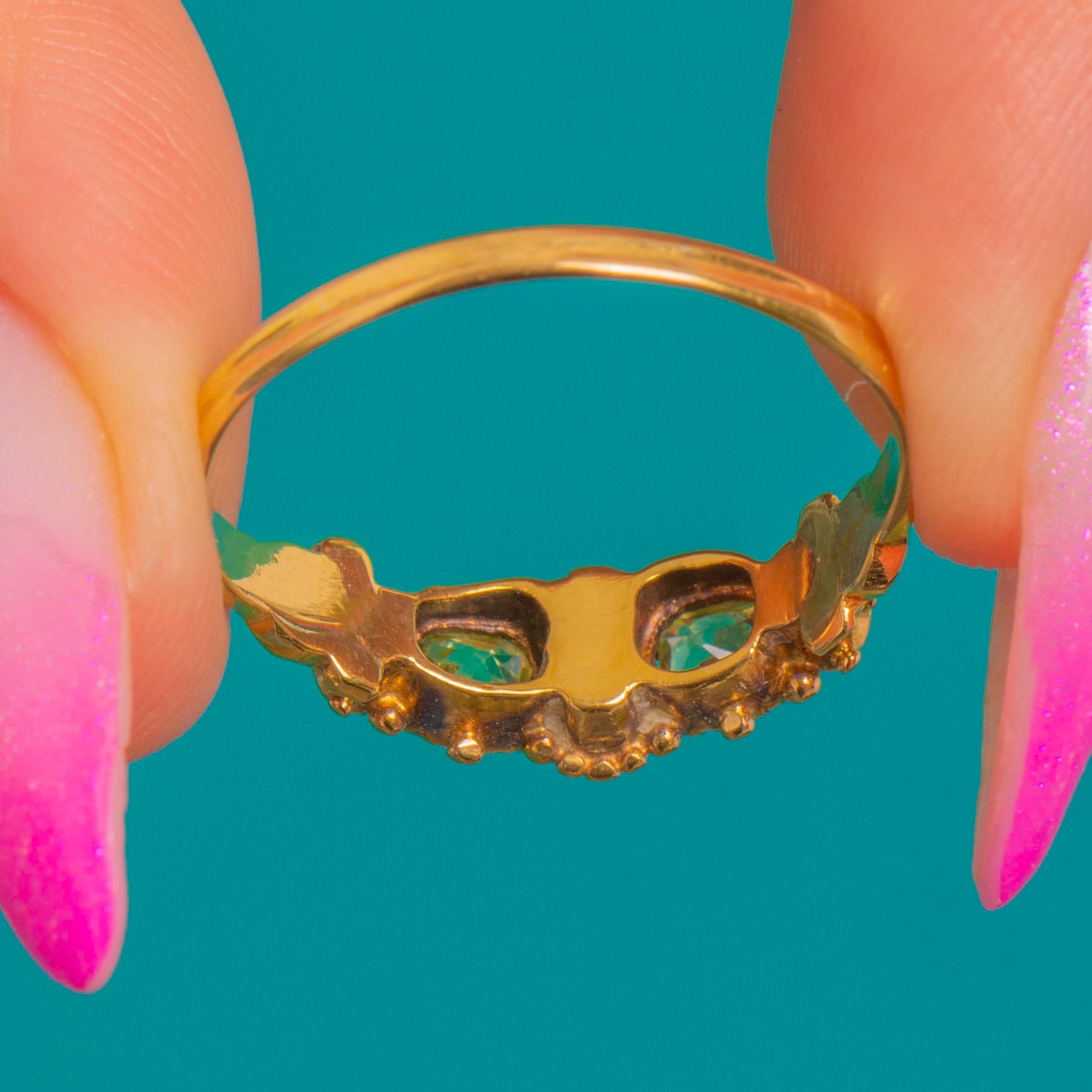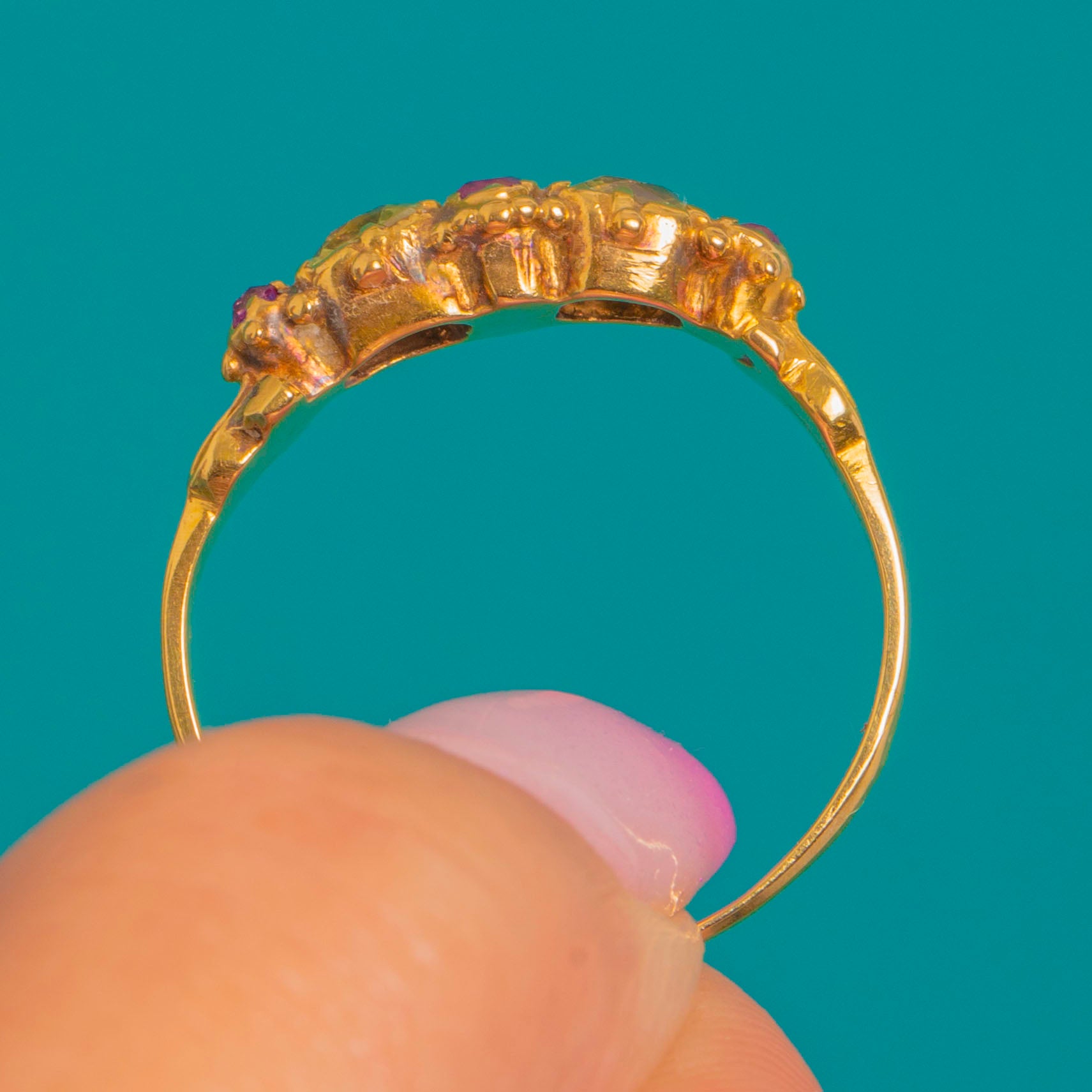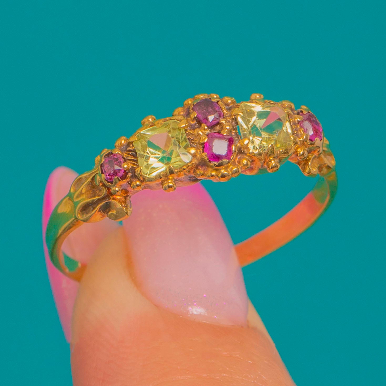 A romantic Georgian–Early Victorian treasure, this 15ct Gold ring is set with a delicate linear cluster of Chrysoberyl and Ruby. The pale yellow‑green glow of Chrysoberyl plays beautifully with the rosy sparkle of Rubies, arranged in a low profile that glides effortlessly on the finger. Ornate details abound: a scalloped, pierced gallery and fine beaded accents along foliate shoulders lend an heirloom charm while keeping the silhouette refined and wearable.