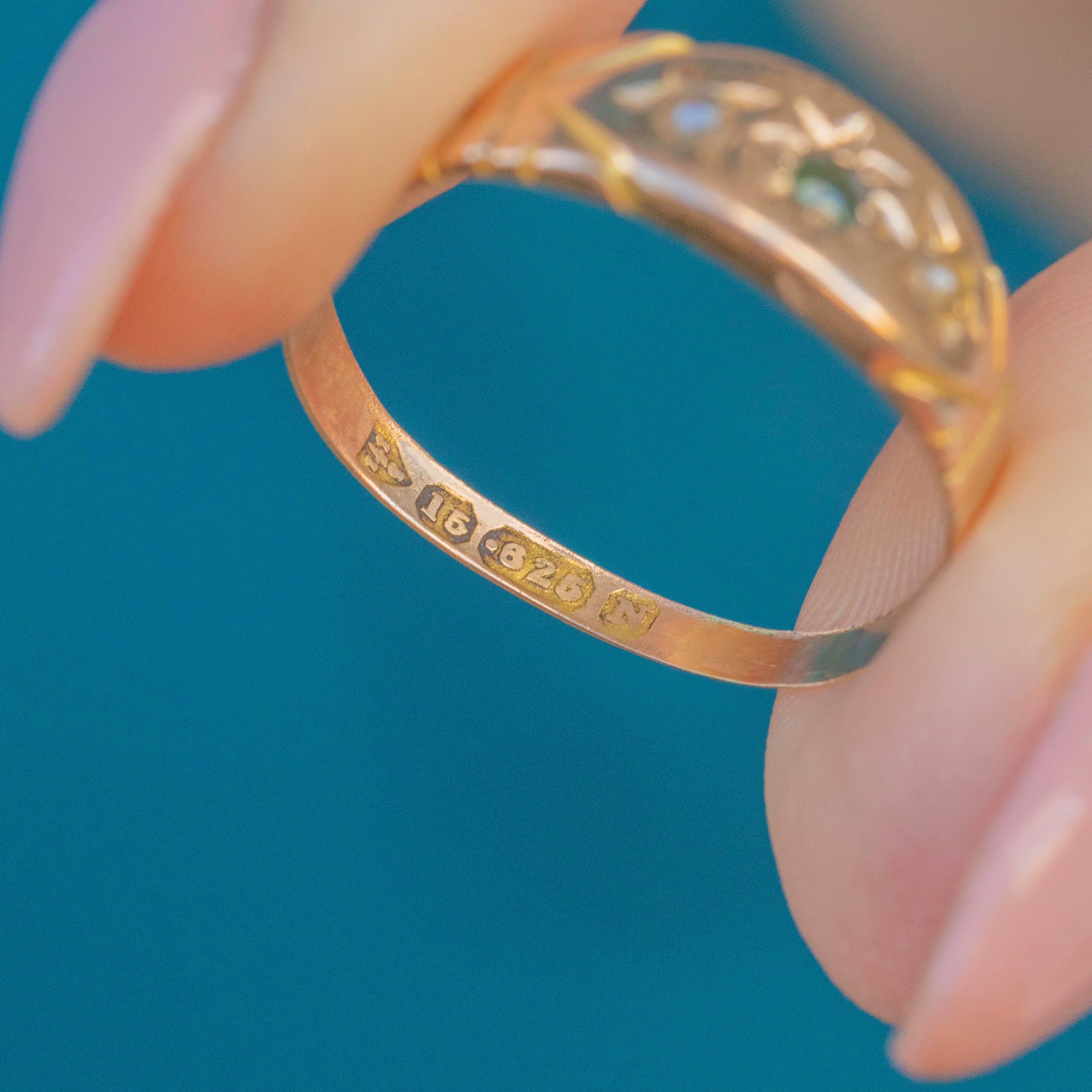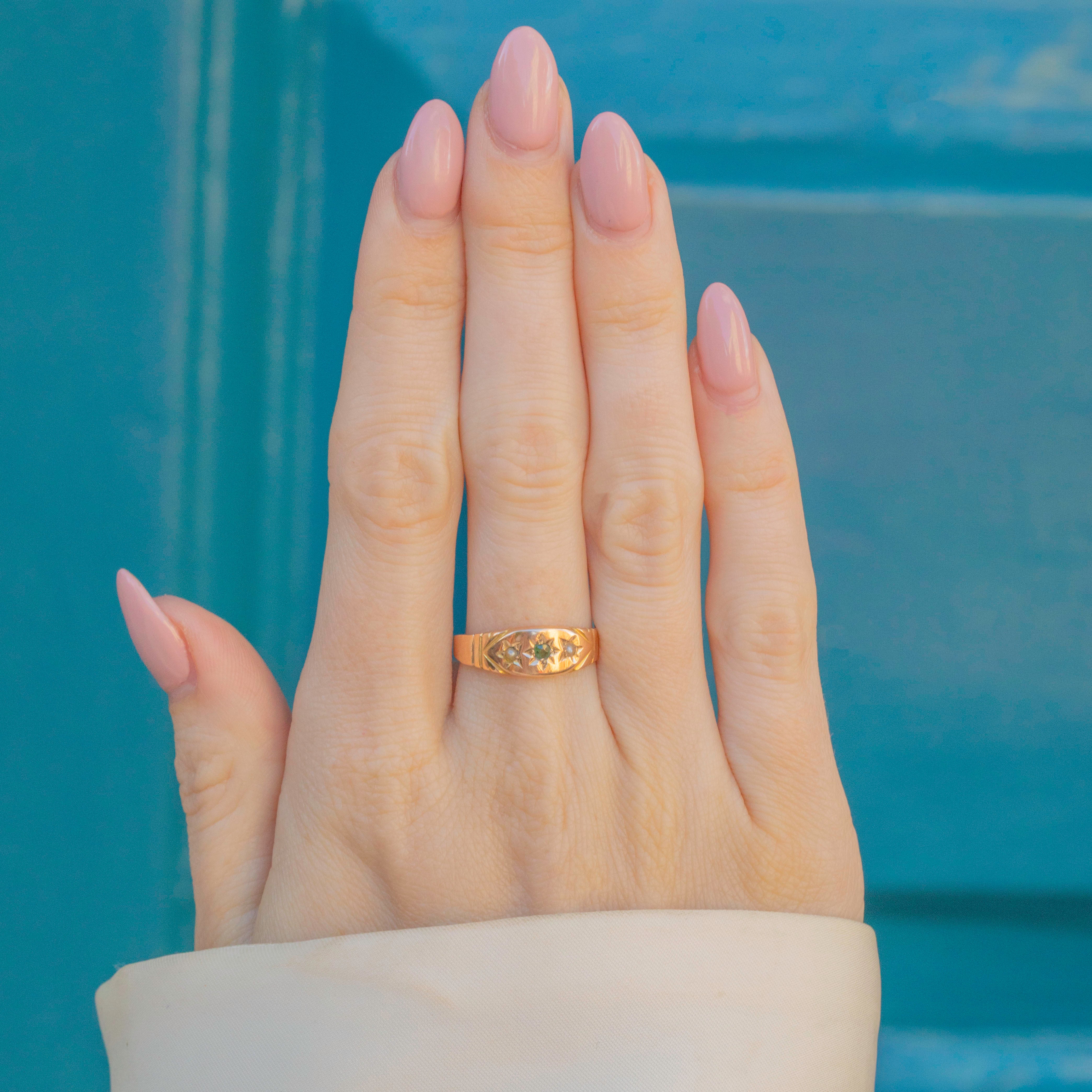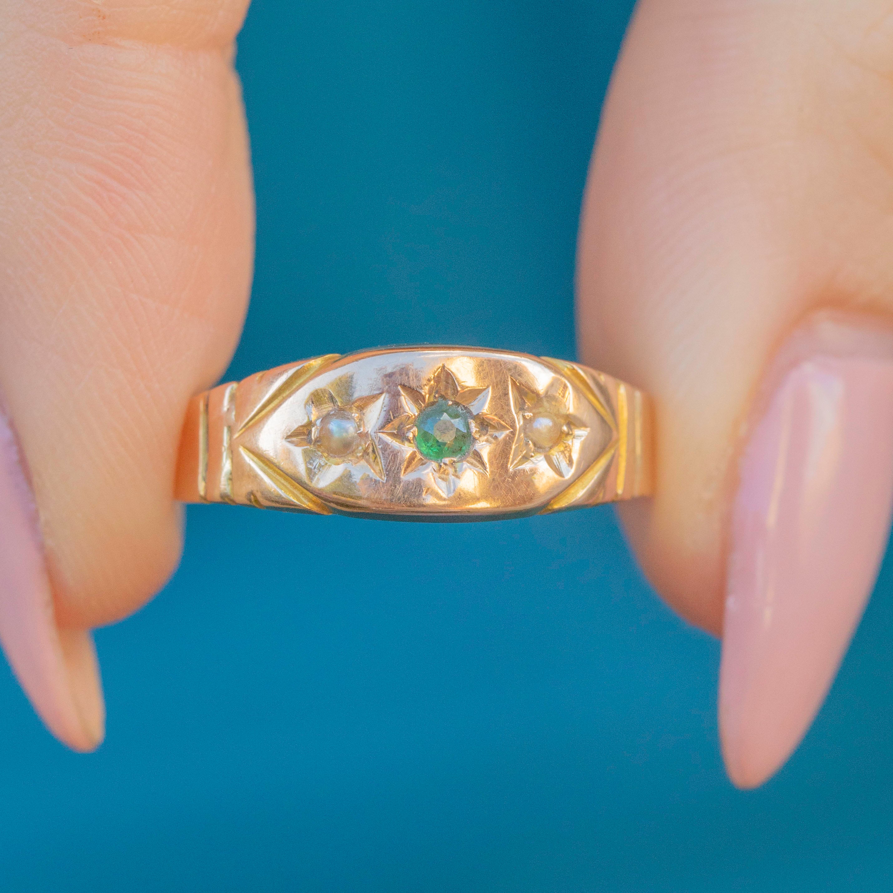EXCELLENT. This lovely 15ct Gold Emerald and Pearl gypsy ring is in excellent condition! The gemstones are securely set and free from damage and the Gold is bright with a wonderful sheen. The band is fairly thin, but this is as intended, and has a full set of chunky antique hallamrks inside- what a treat!