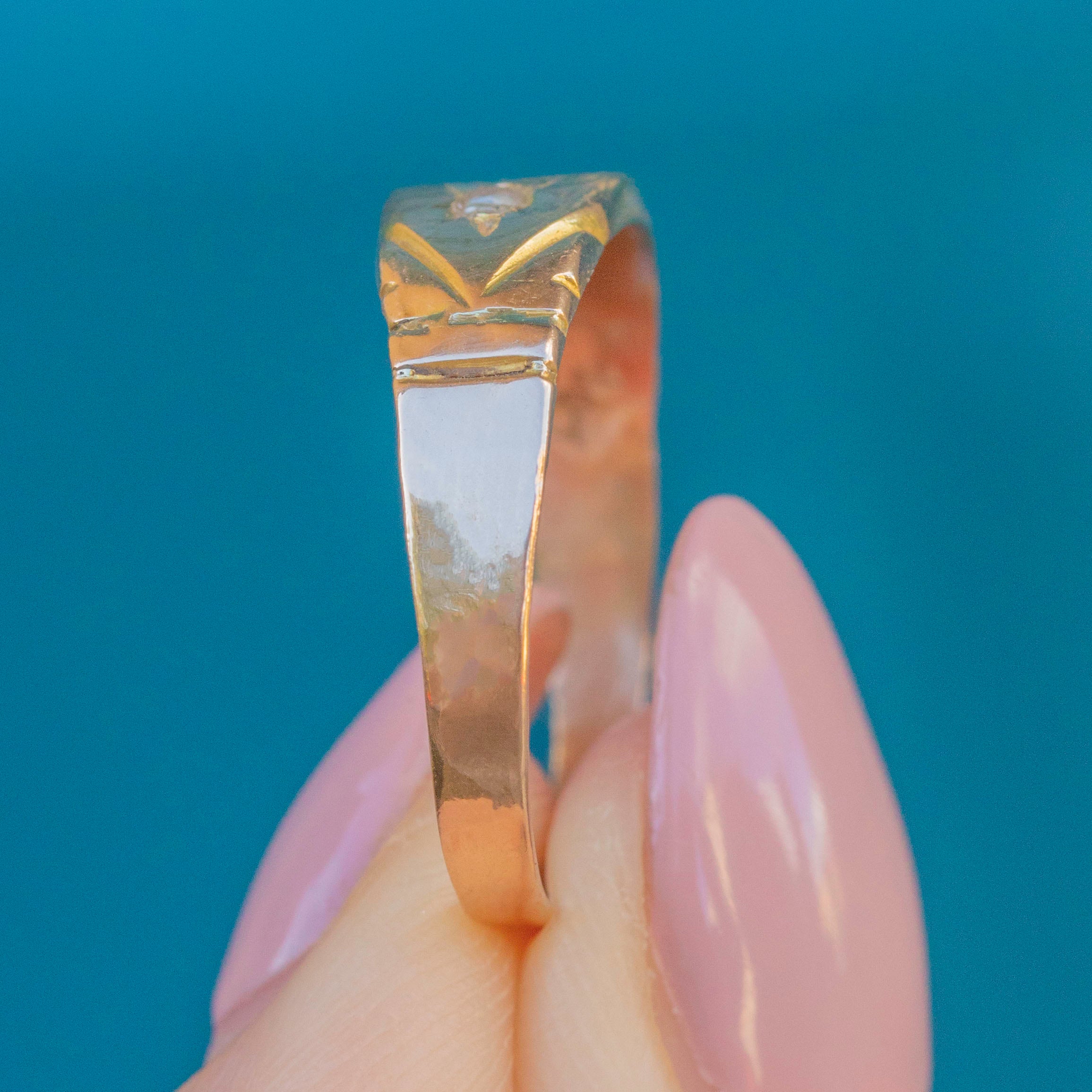 This highly wearable 15ct Gold Emerald and Pearl gypsy ring will make a resplendent addition to your curated ring stack!