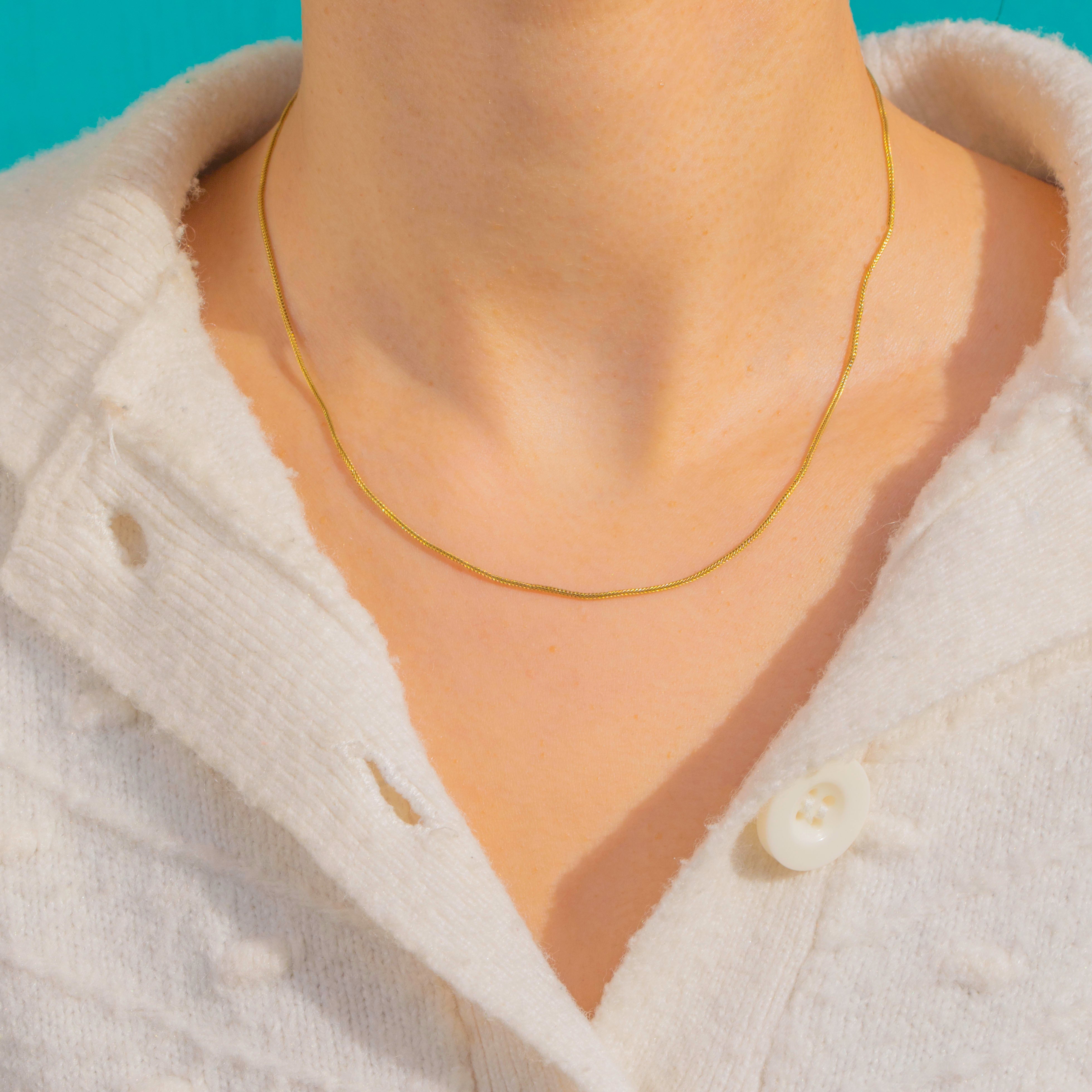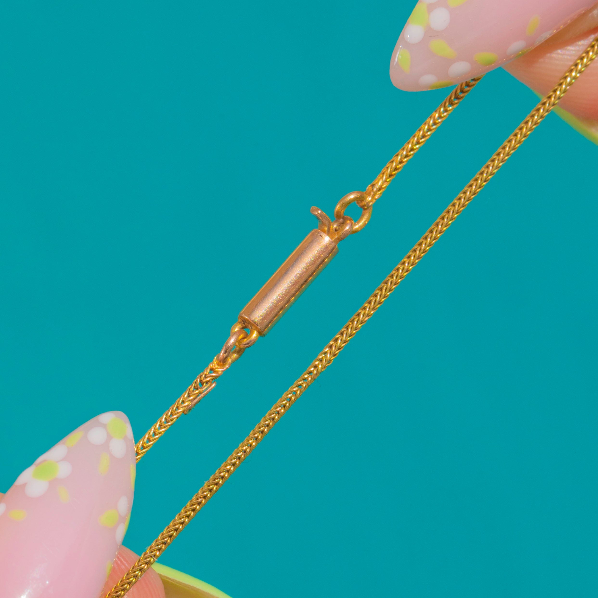 Delicate yet refined, the chain measures 15 inches in length and fastens with a classic barrel clasp. Its slender profile makes it perfect for wearing alone as a subtle antique accent, or paired with a favourite pendant for an effortlessly timeless look.