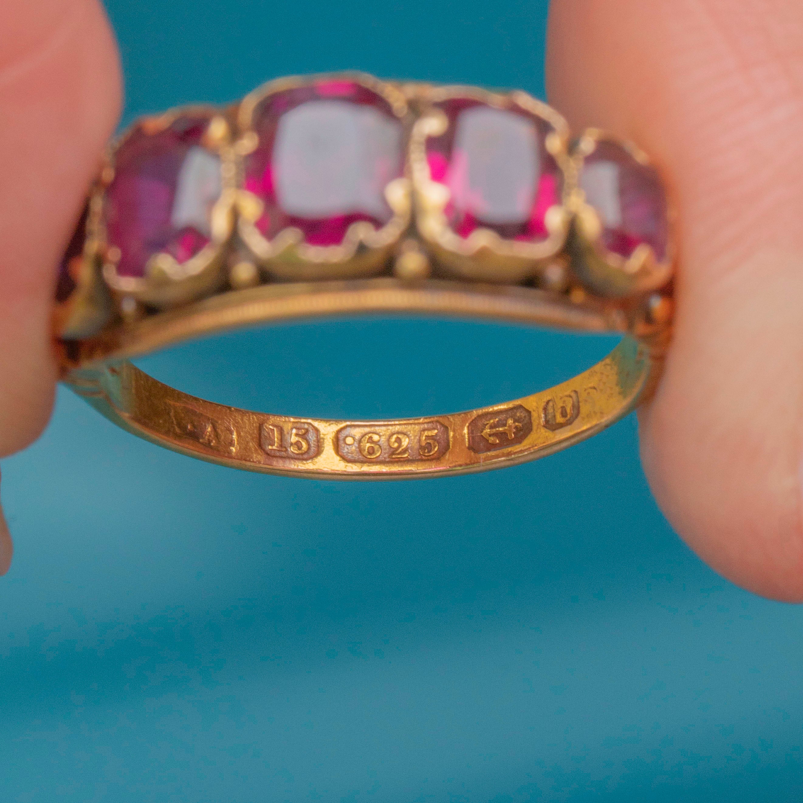 VERY GOOD: This 15ct Gold Garnet five-stone ring is offered in very good condition. The Garnets are pristine and free from chips or abrasions, displaying pretty pink and red hues. The Gold has a lovely rosy tint with only minor darkening in the grooves. There is some Gold missing from the underside of the settings, but the Garnets have remained securely set. With a full set of antique hallmarks still fully legible on the inside of the band, this Victorian Garnet ring will make a fabulous addition to your collection!