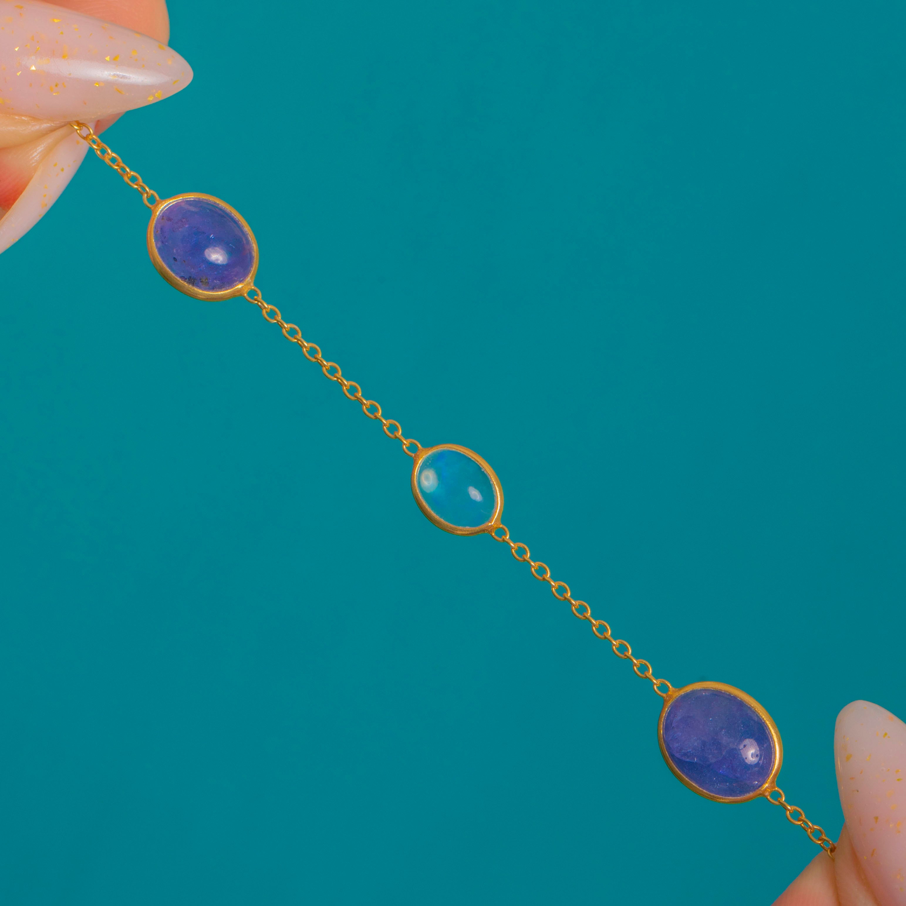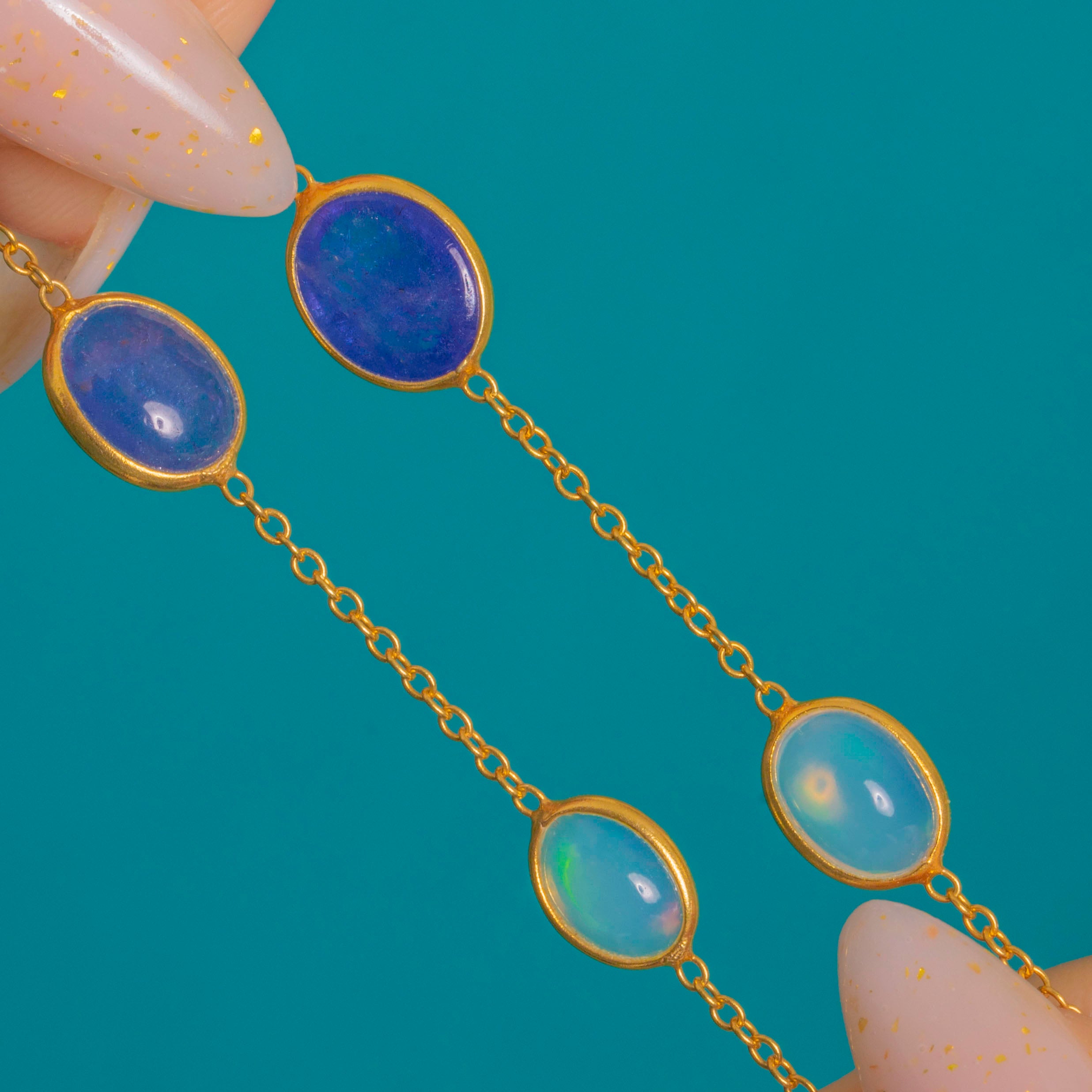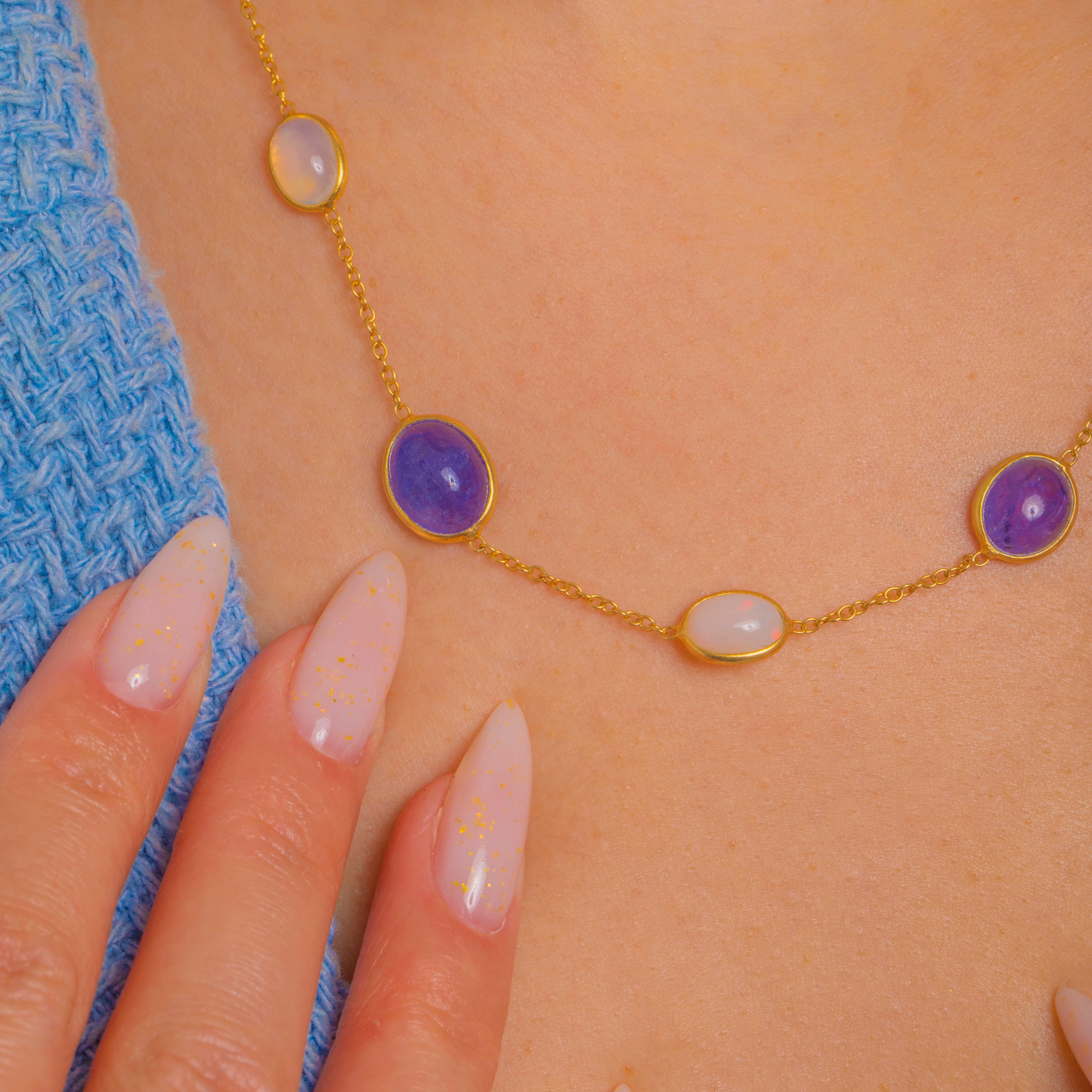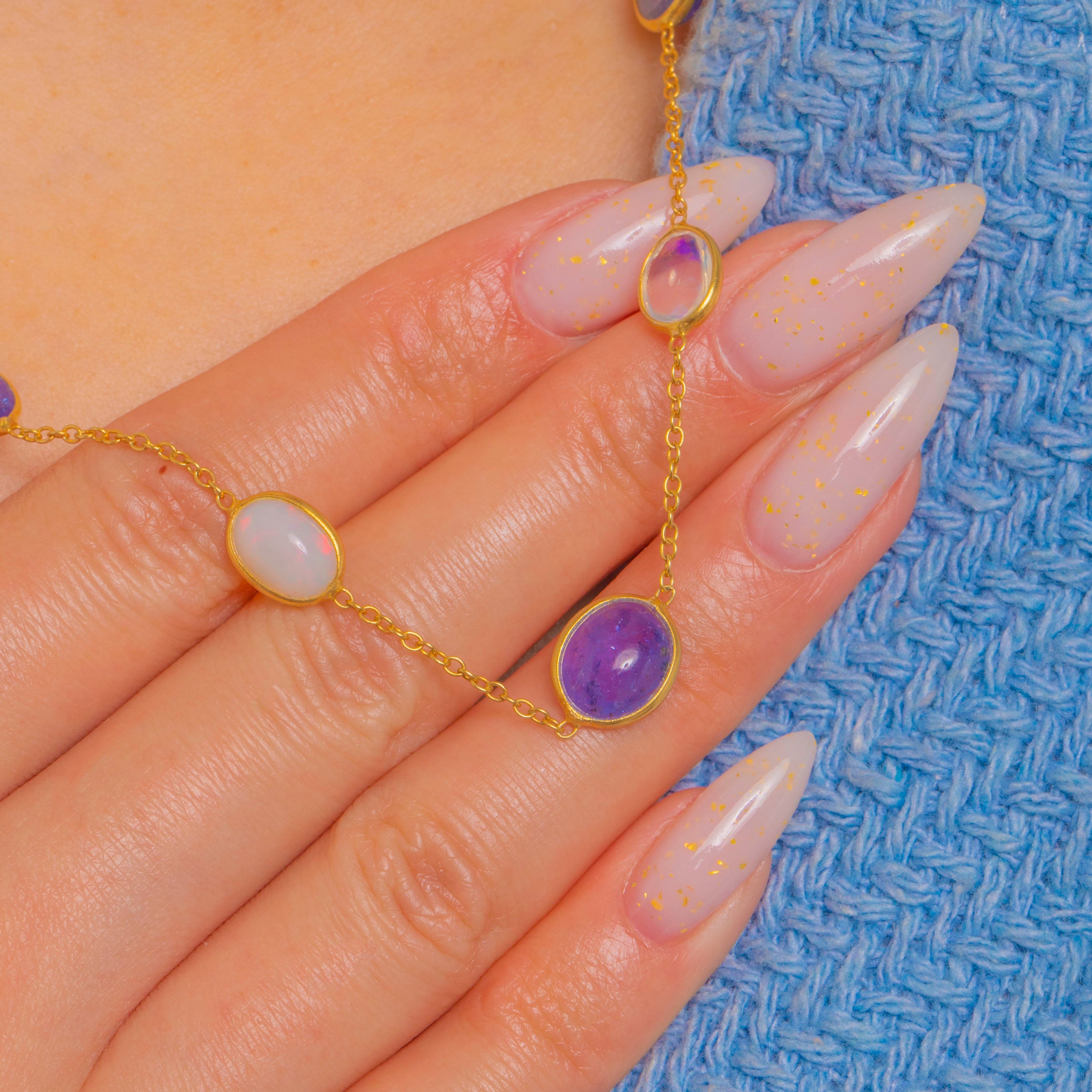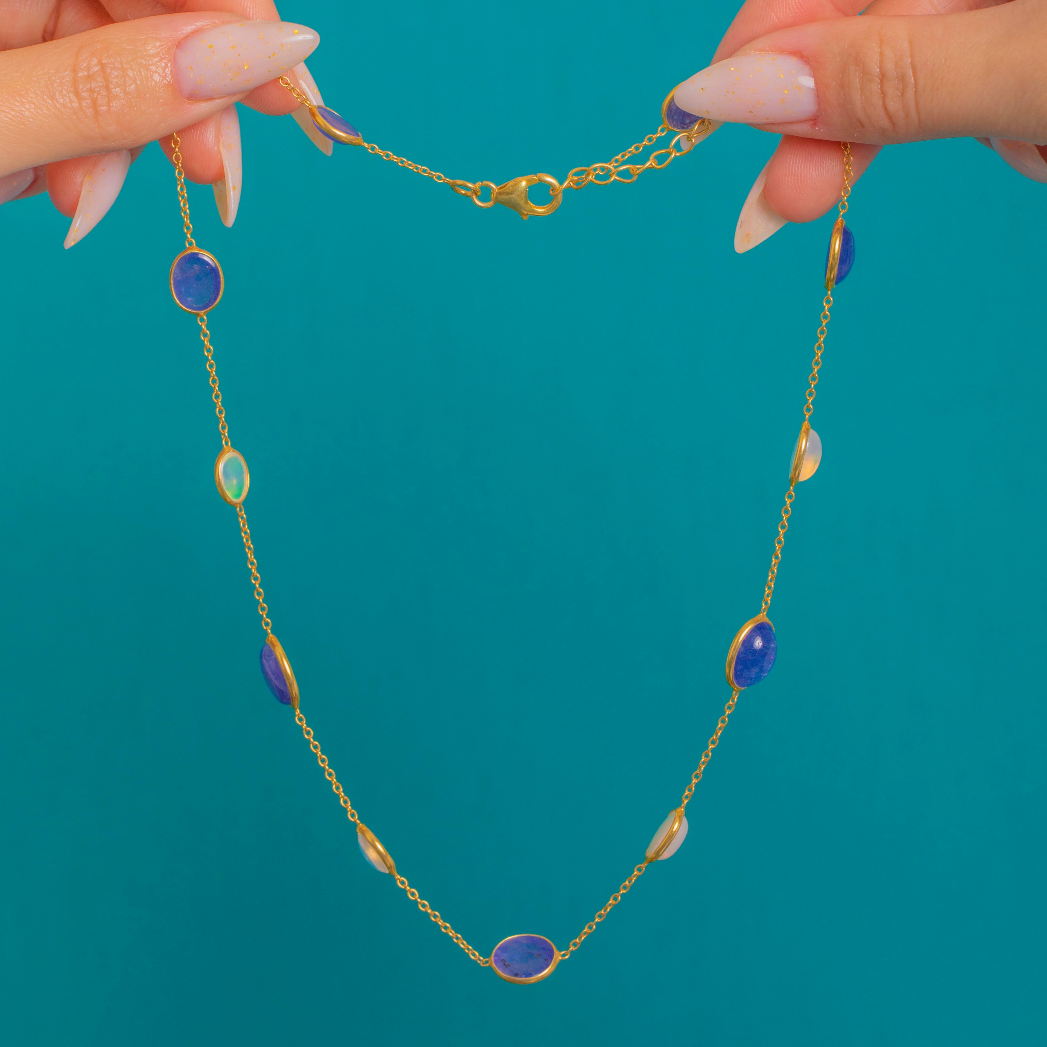 A refined take on colour, this vintage station necklace scatters Opal and Iolite cabochons along a fine chain for an elegant, luminous glow. Smooth rub-over bezels frame the oval silhouettes, the Iolites bringing deep blue-violet saturation while the Opals flash with playful greens, oranges and pinks.
