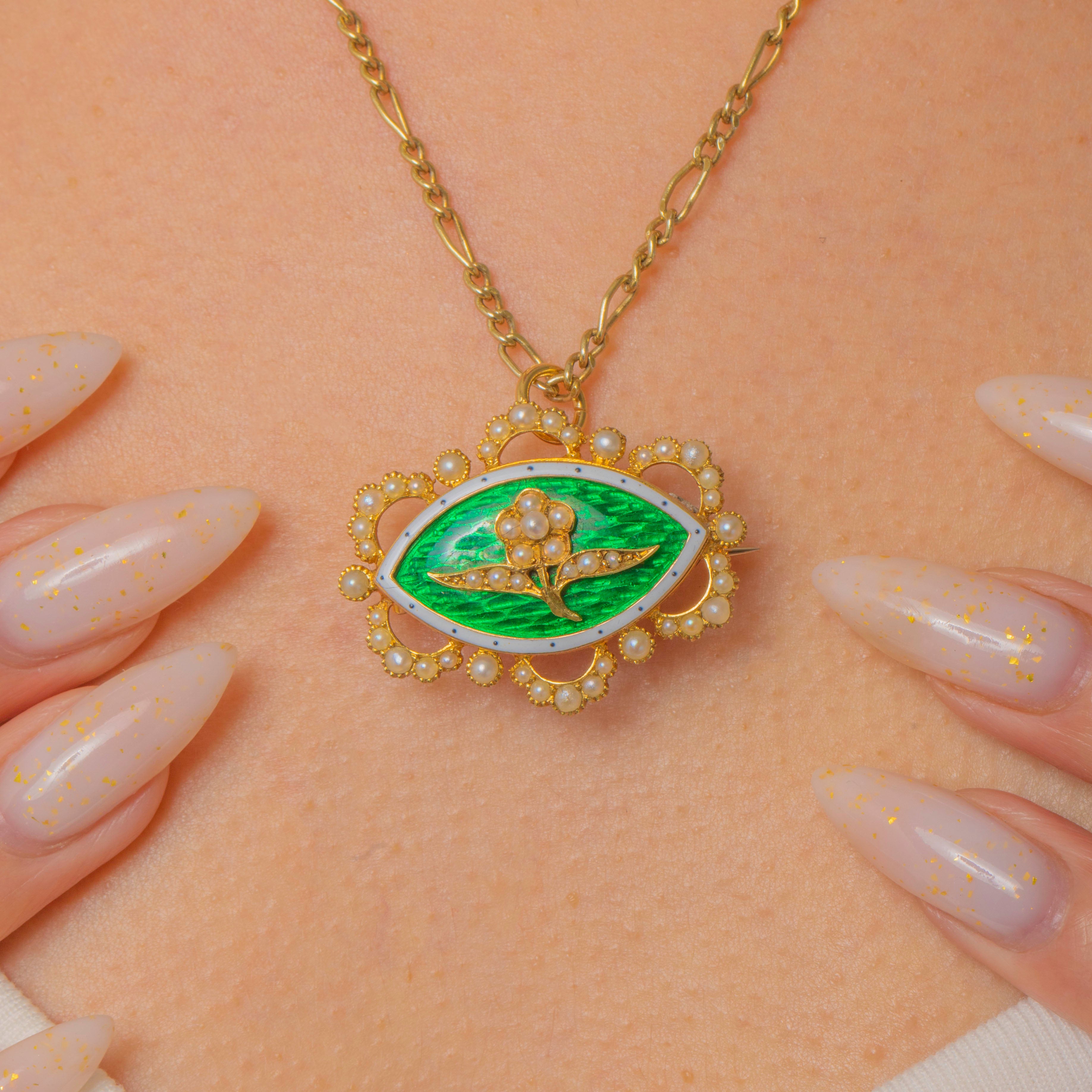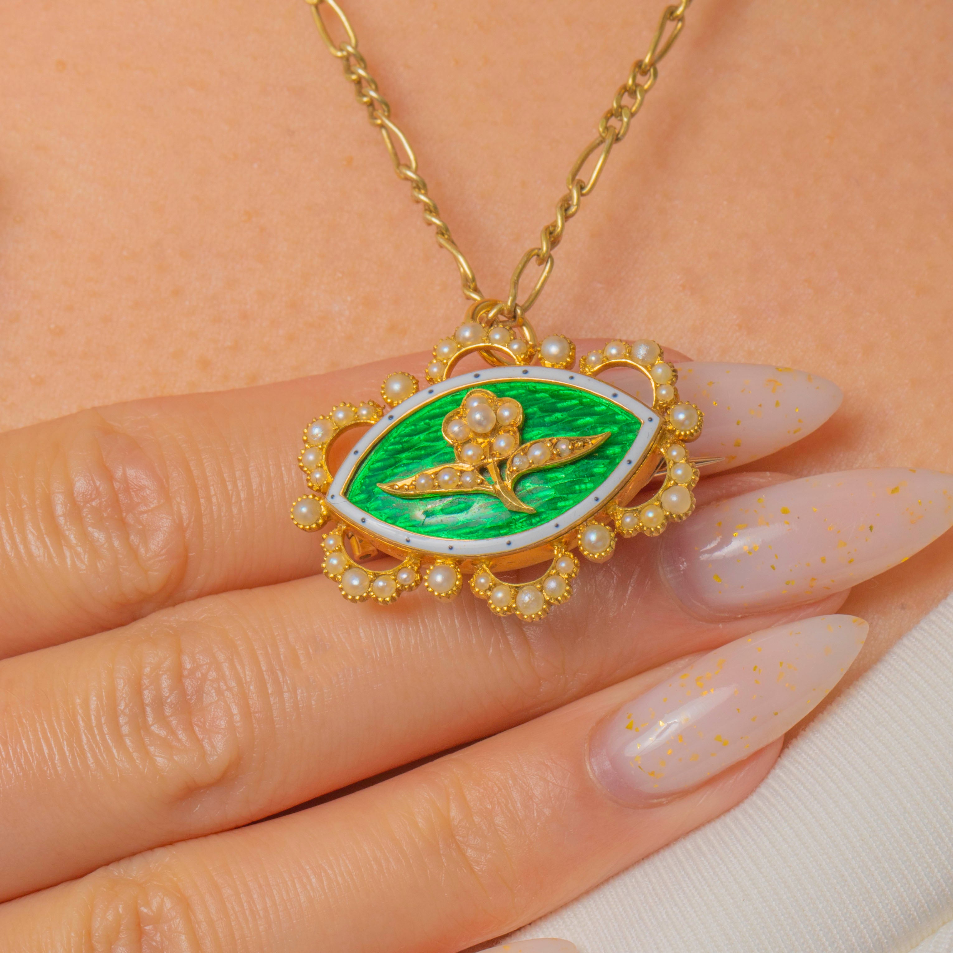 MATERIALS: Tested as 15ct Gold, Green Enamel, White Enamel , Pearls.