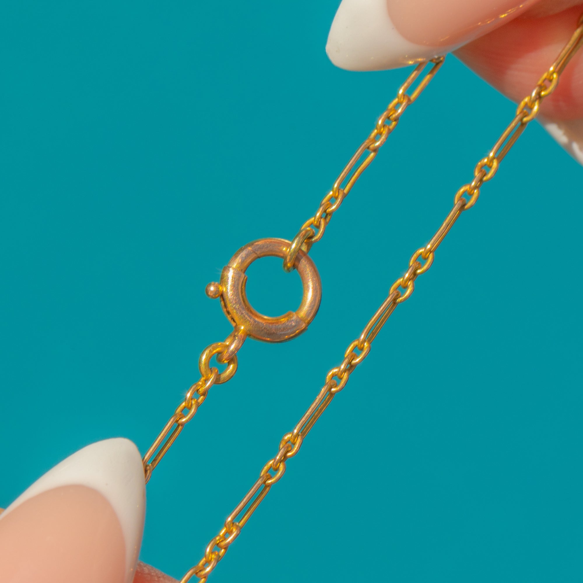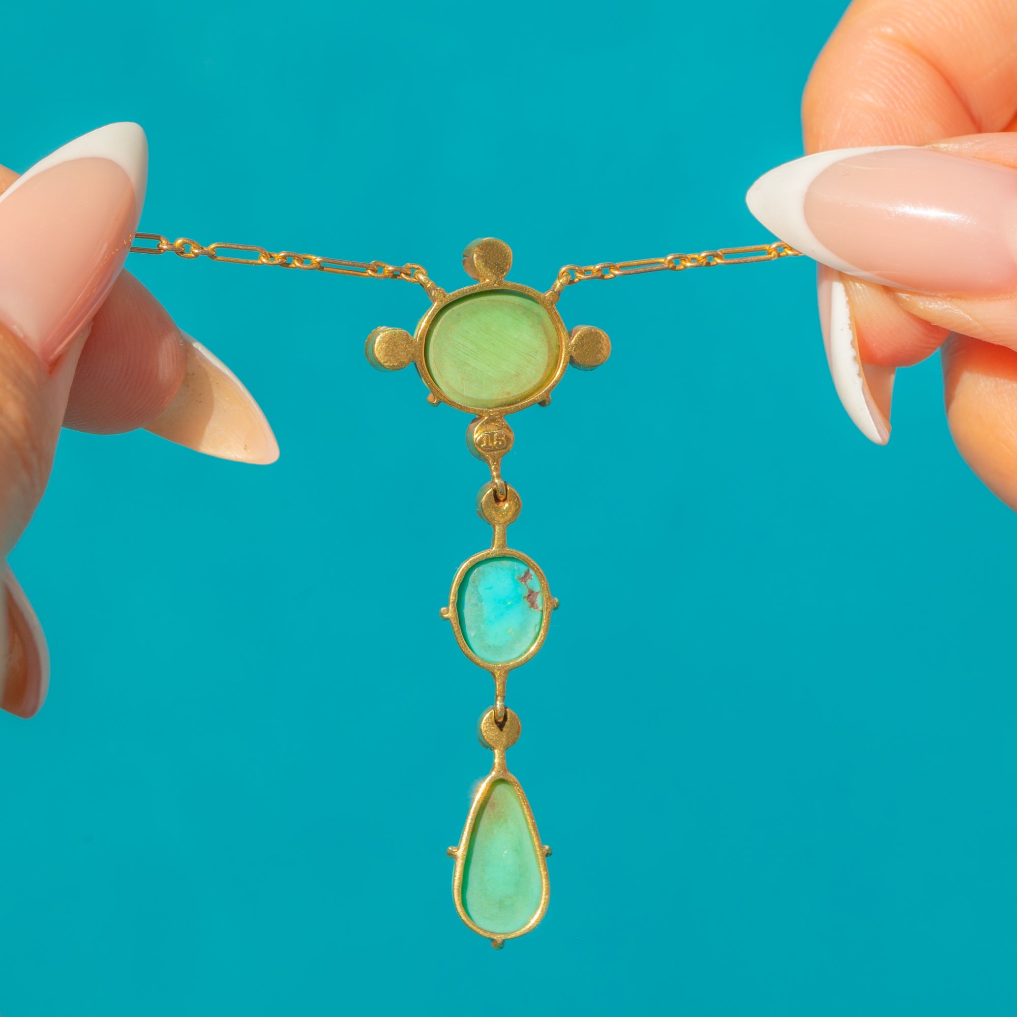 The largest oval Turquoise sits at the centre, with a smaller oval and an elegant teardrop below, creating a graceful cascade. The warm Gold setting and fine antique chain complete this rare and eye-catching piece, brimming with Victorian charm.