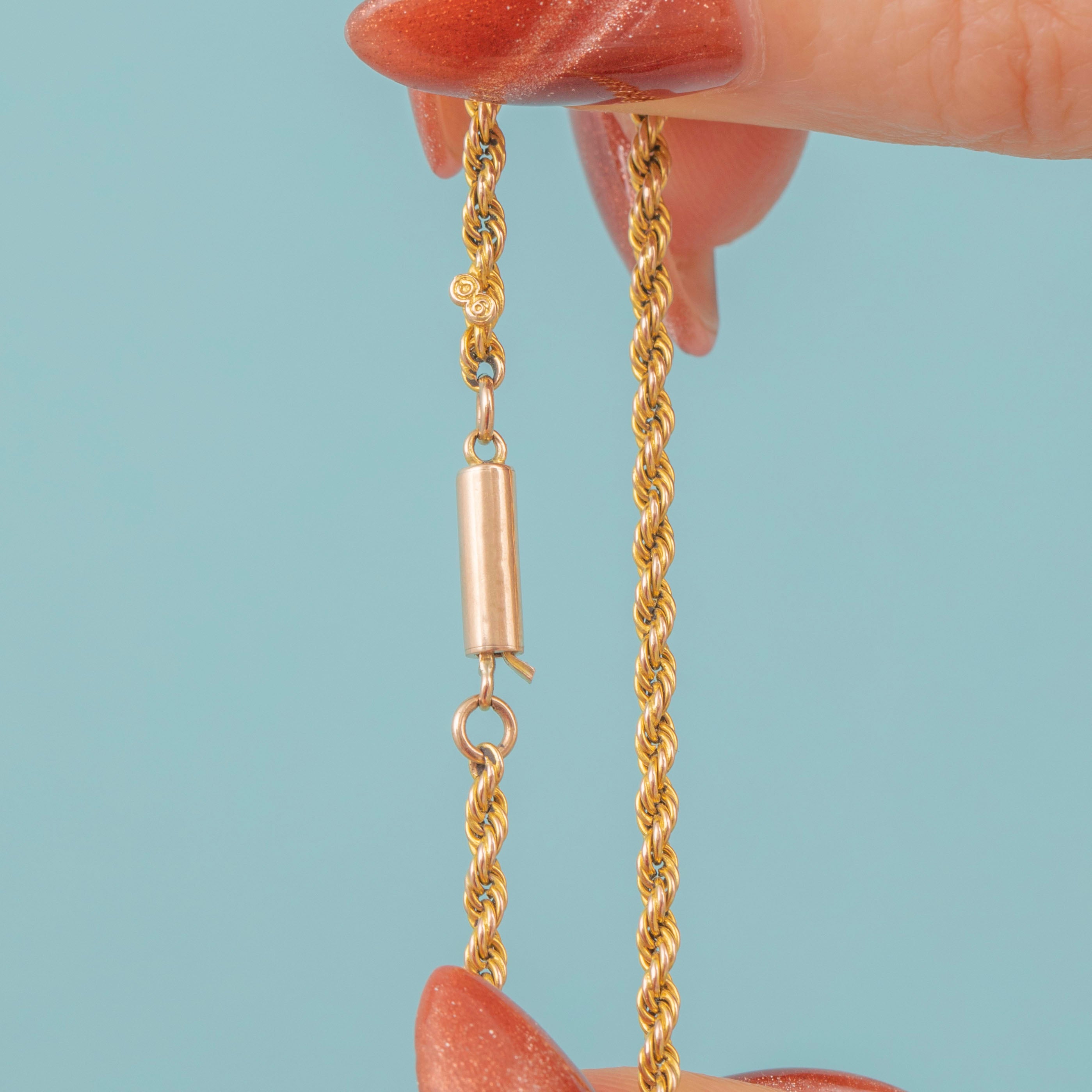 EXCELLENT. This 16.5" antique 9ct Gold twisted rope chain is in wonderful condition throughout. The links are tightly woven throughout, with no surface wear to note. Her 9ct Gold has a lovely saturated hue and gleams when worn. The barrel clasp is in perfect working order, so you can wear this Victorian Gold chain with the utmost confidence; it'll make the perfect addition to your antique jewellery collection!