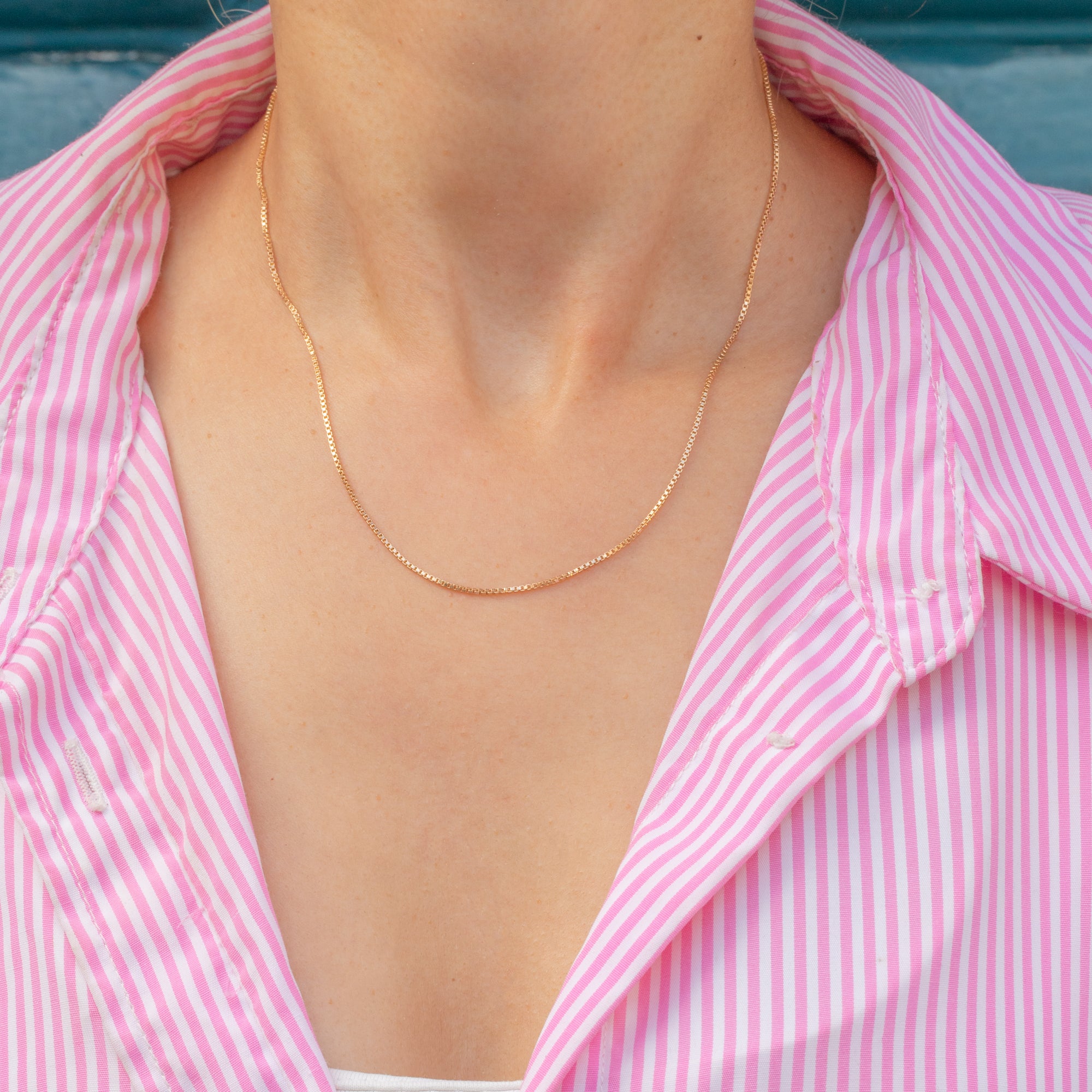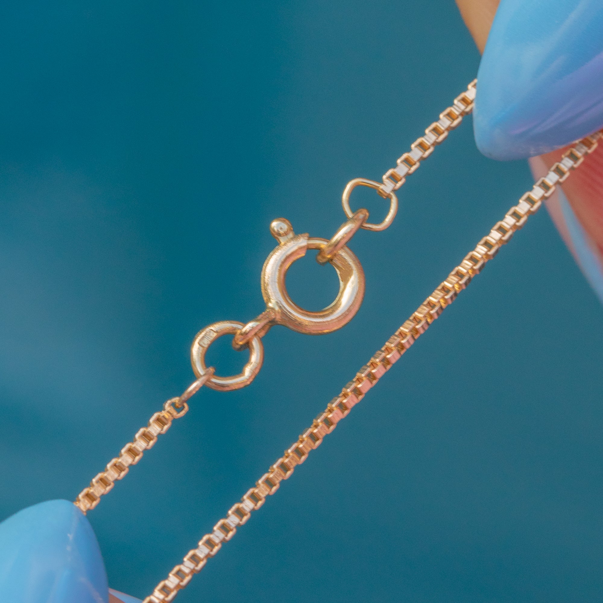 At 16" long, this Gold box chain fits snugly and is perfect for layering with other chains, suspending pendants, or simply being worn alone for a subtle flash of Gold!