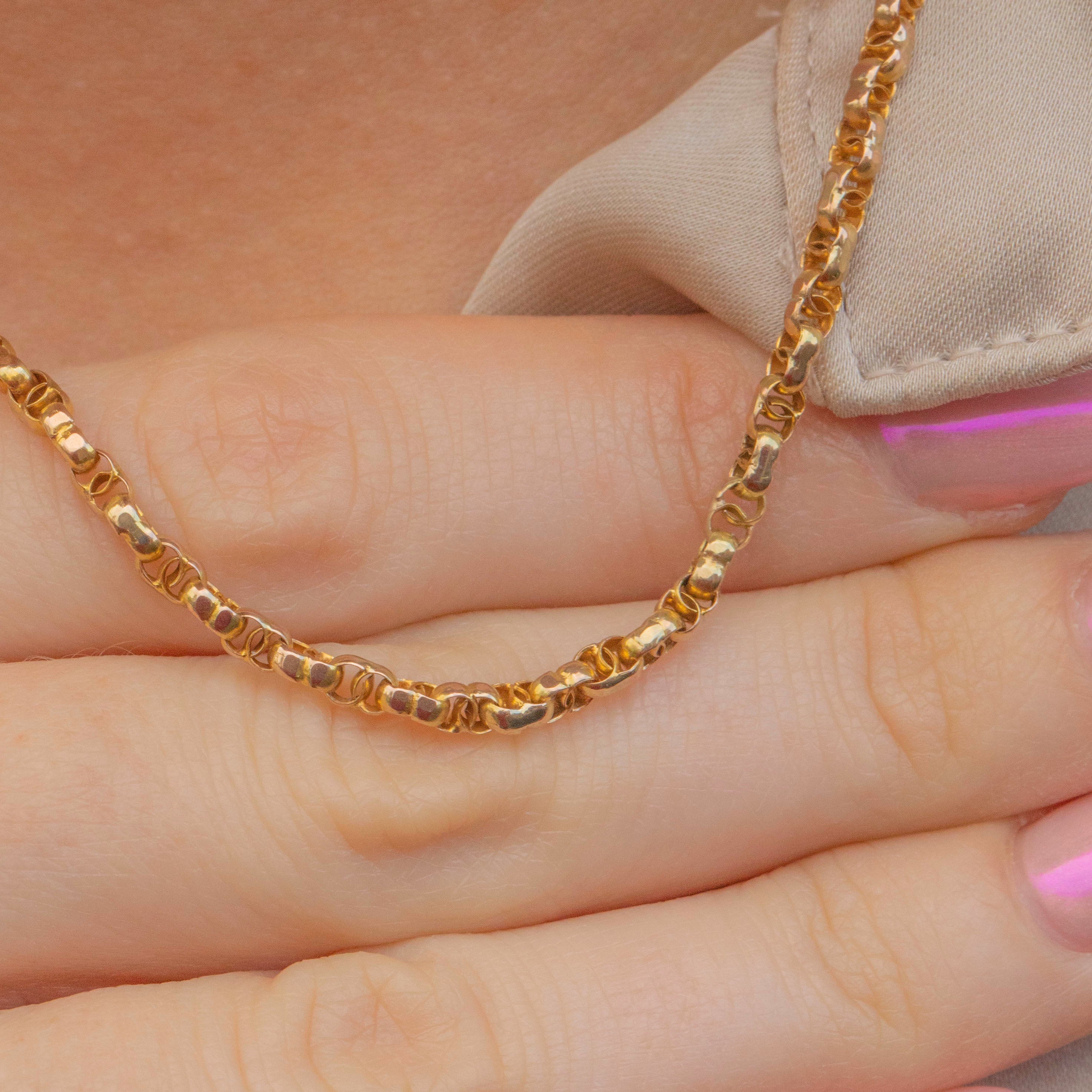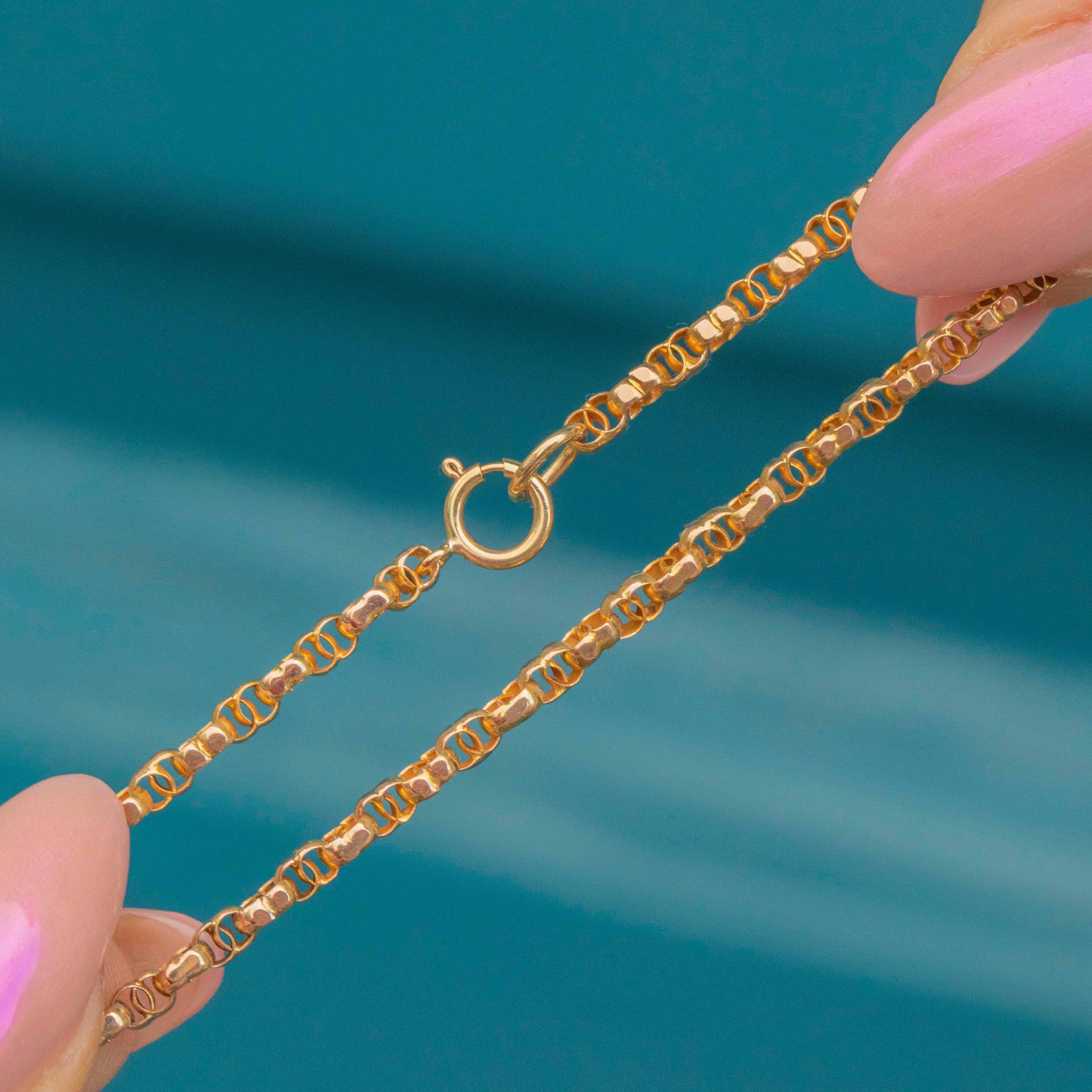 EXCELLENT. This antique 9ct Gold fancy link chain is in excellent condition. The Gold is bright and buttery and the links have remained structurally intact, which is no mean feat when considering its grand age! The later added bolt ring is in perfect working order allowing you to wear this unique antique chain with absolute confidence!