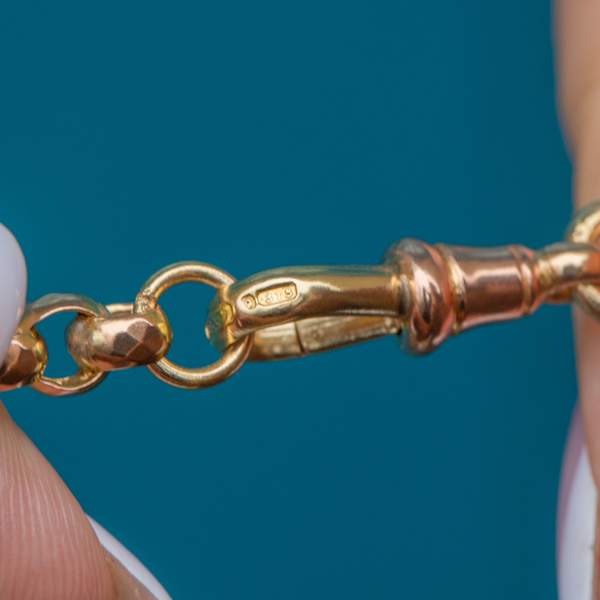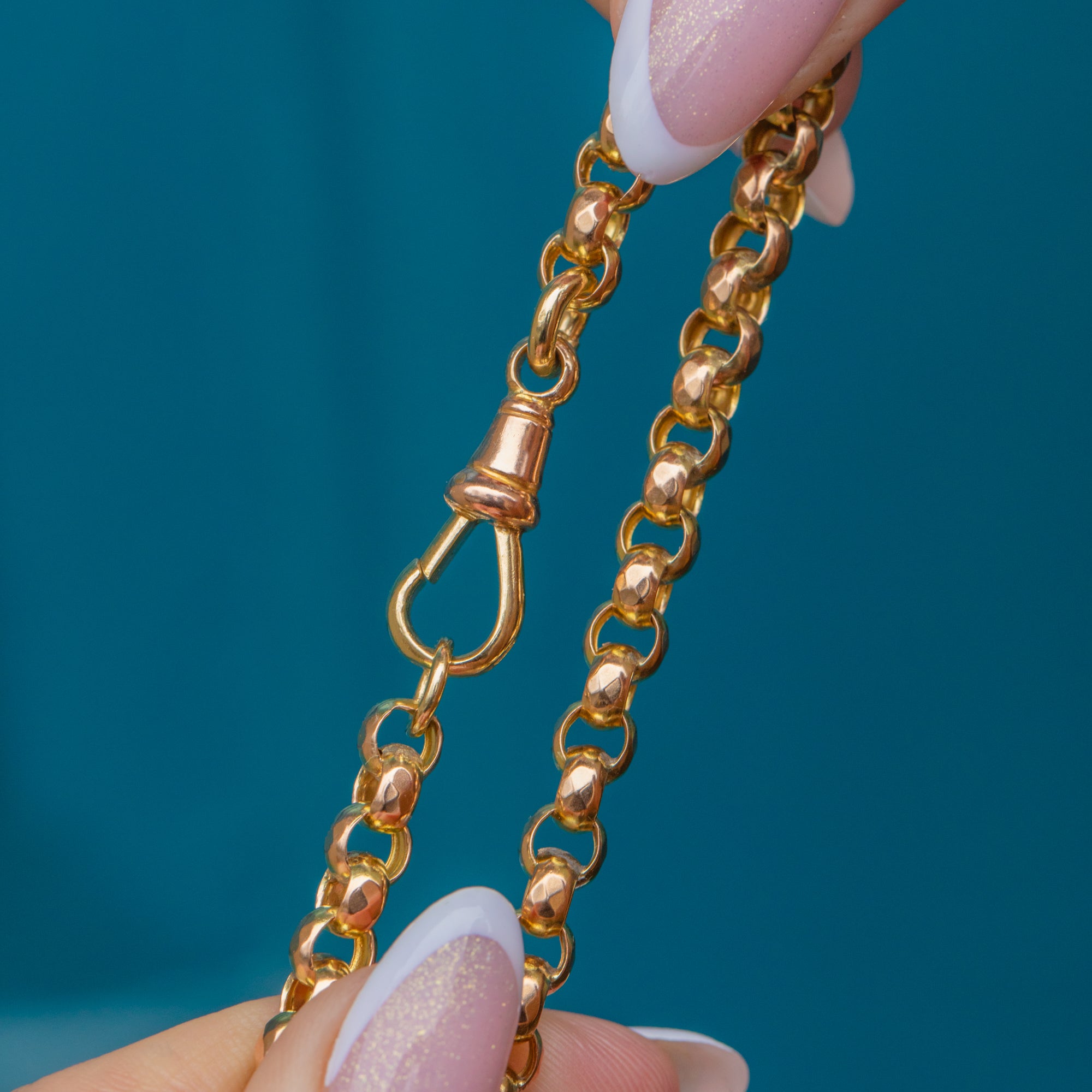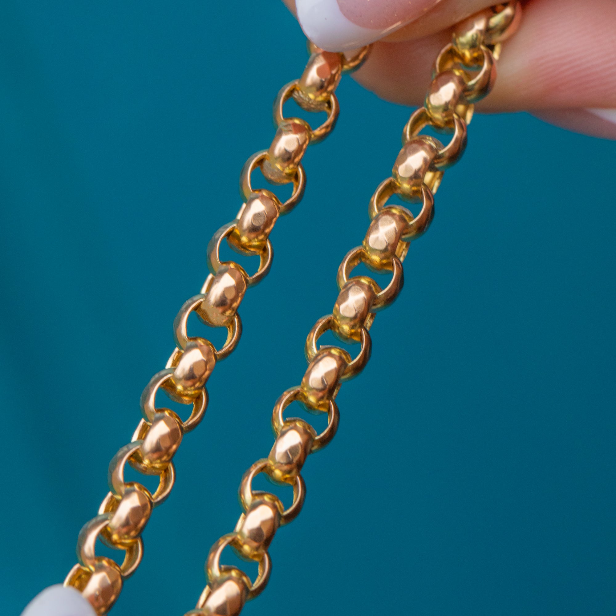 The buttery 9ct Gold has been formed into belcher links, giving this Victorian chain plenty of character. She is complete with an antique dog-clip - a highly sought-after findinhg, perfect for suspending a charm for a personal touch.