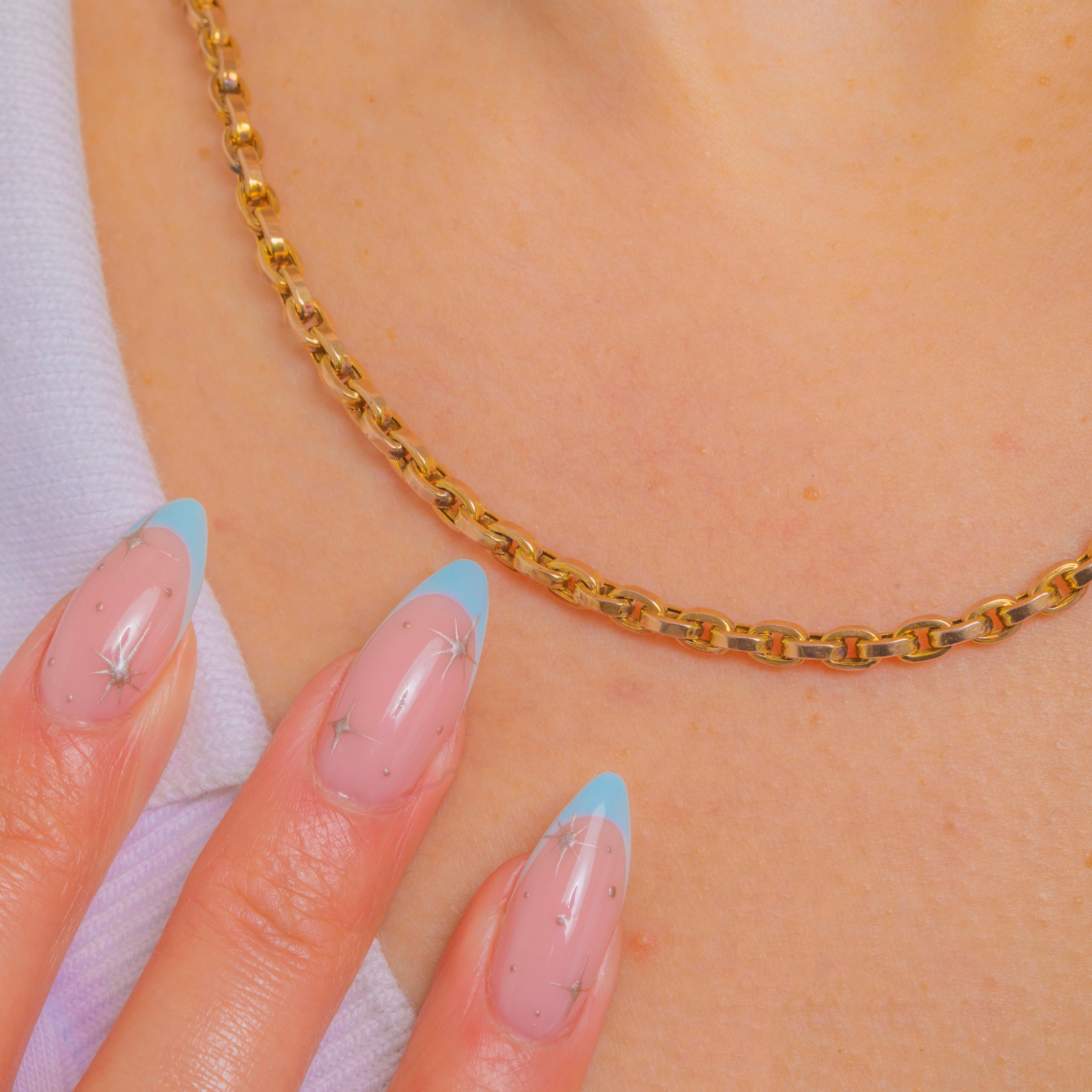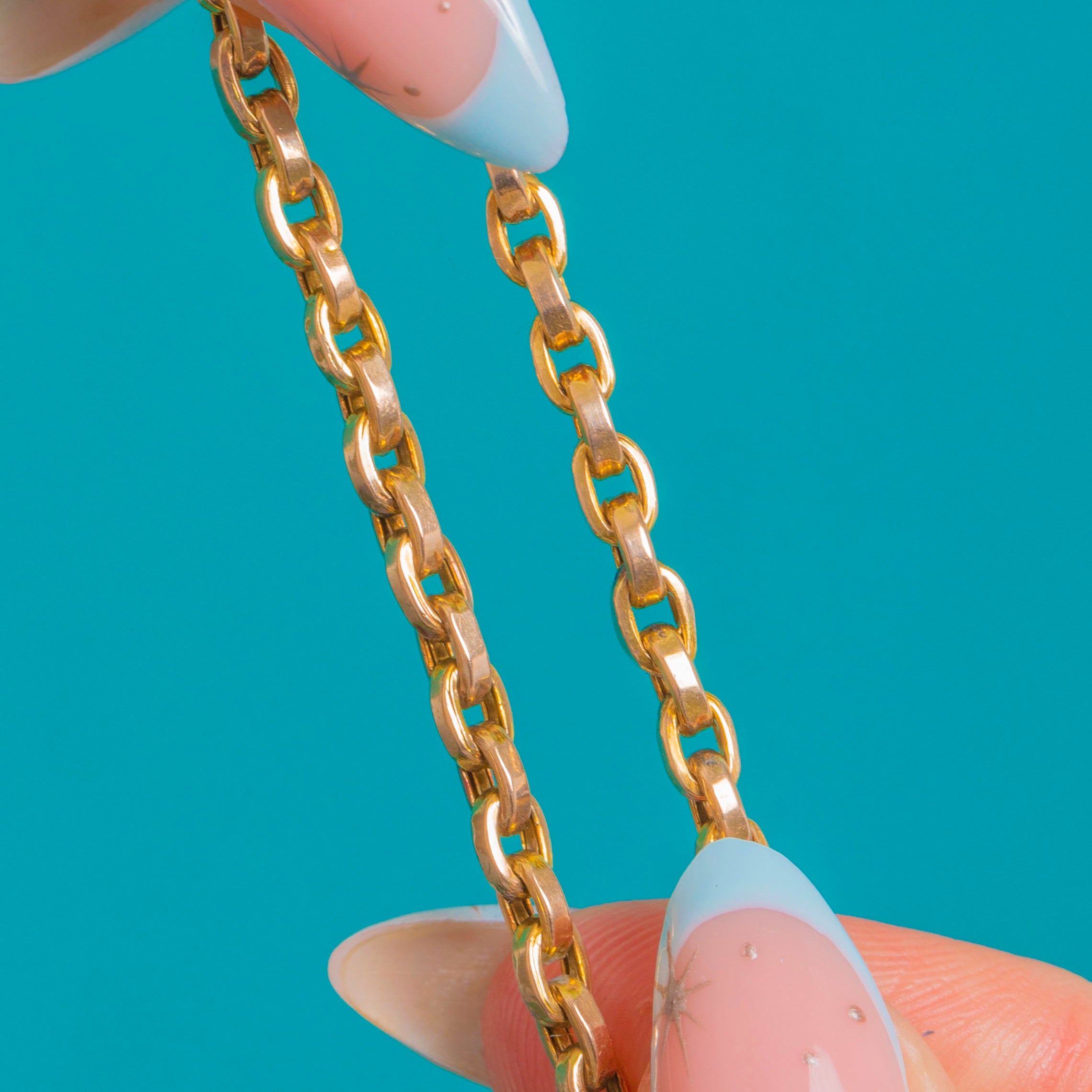 A timeless Victorian 9ct Gold belcher chain, expertly made with smooth 3mm round links and finished with a classic dog-clip. Its warm yellow hue, bright polish and elegant simplicity give this antique staple a refined, versatile presence at the base of the neck.