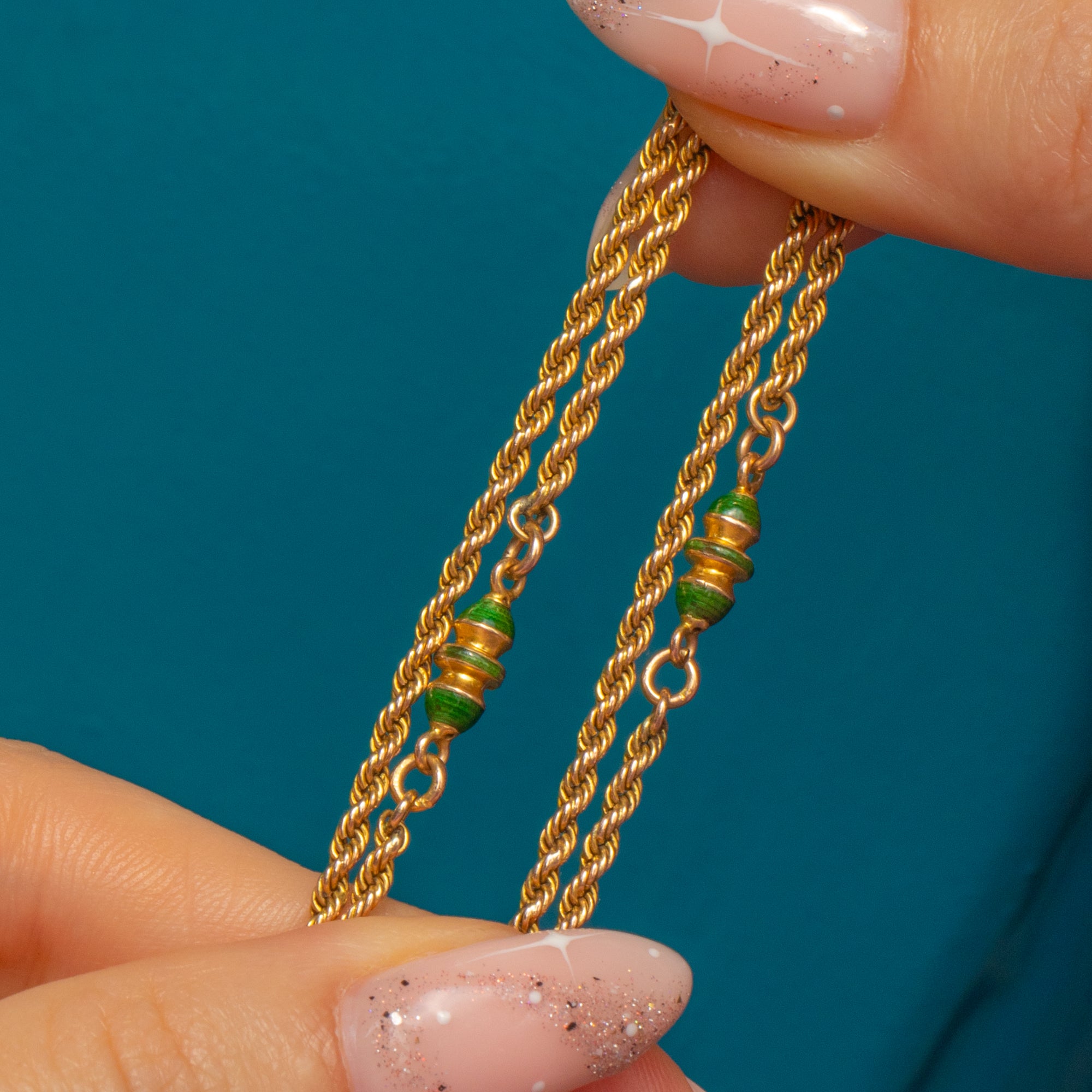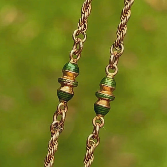 EXCELLENT. This antique 9ct Gold Green Enamel rope chain necklace is in excellent condition. Her Gold links are interlinked securely and have retained their saturated gold hue over the years. Her Enamel beads are securely attached, with no signs of wear on the Enamel on either bead. Her ring bolt fastens safely, providing you with reliable wear. She'll quickly become the most cherished piece in your antique jewellery collection!