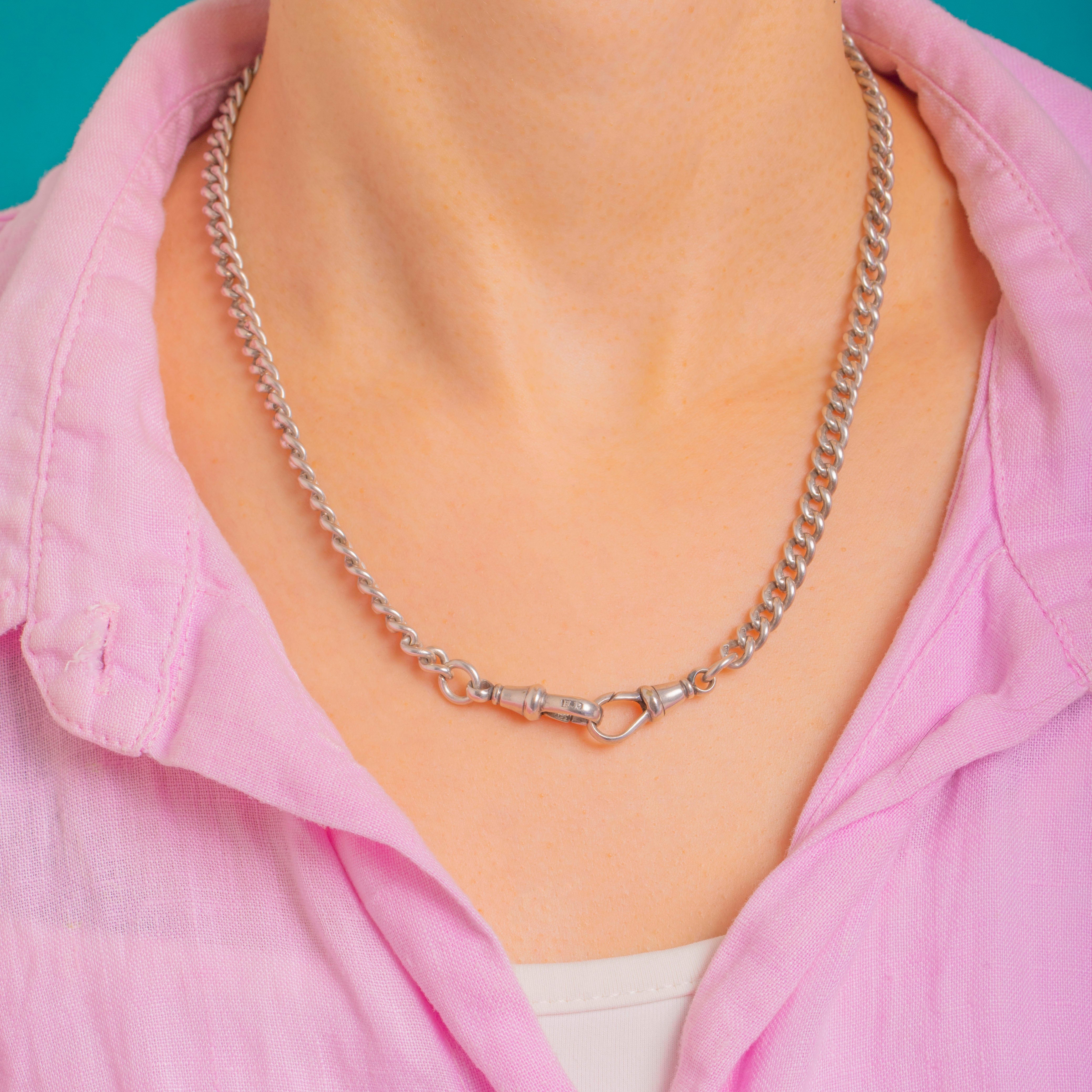 A classic Edwardian Sterling Silver Albert chain with satisfyingly solid curb links and twin dog clip clasps, anchored by a central static jump ring. Its clean, utilitarian lines and beautifully engineered links give it a purposeful elegance that feels as relevant today as it did over a century ago.