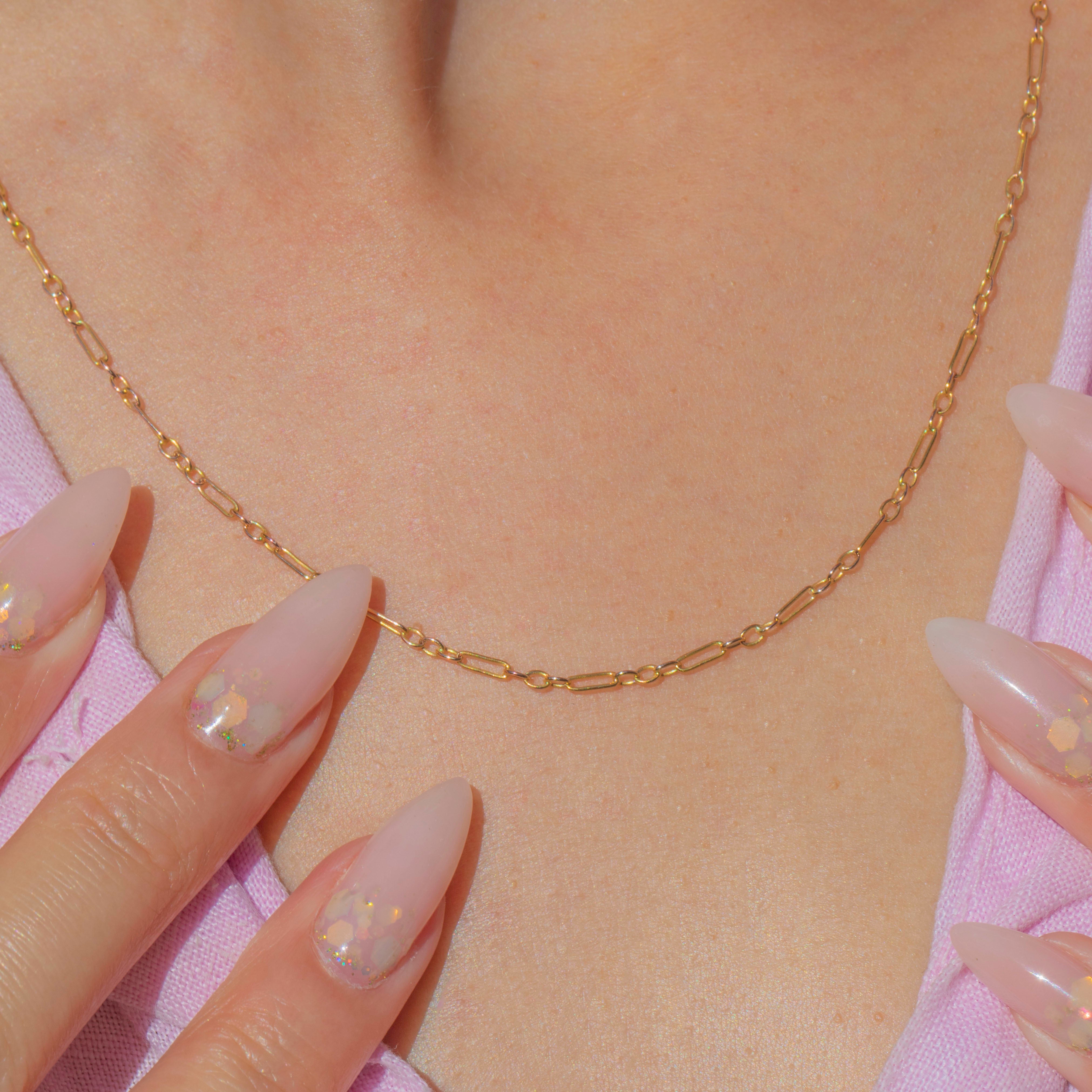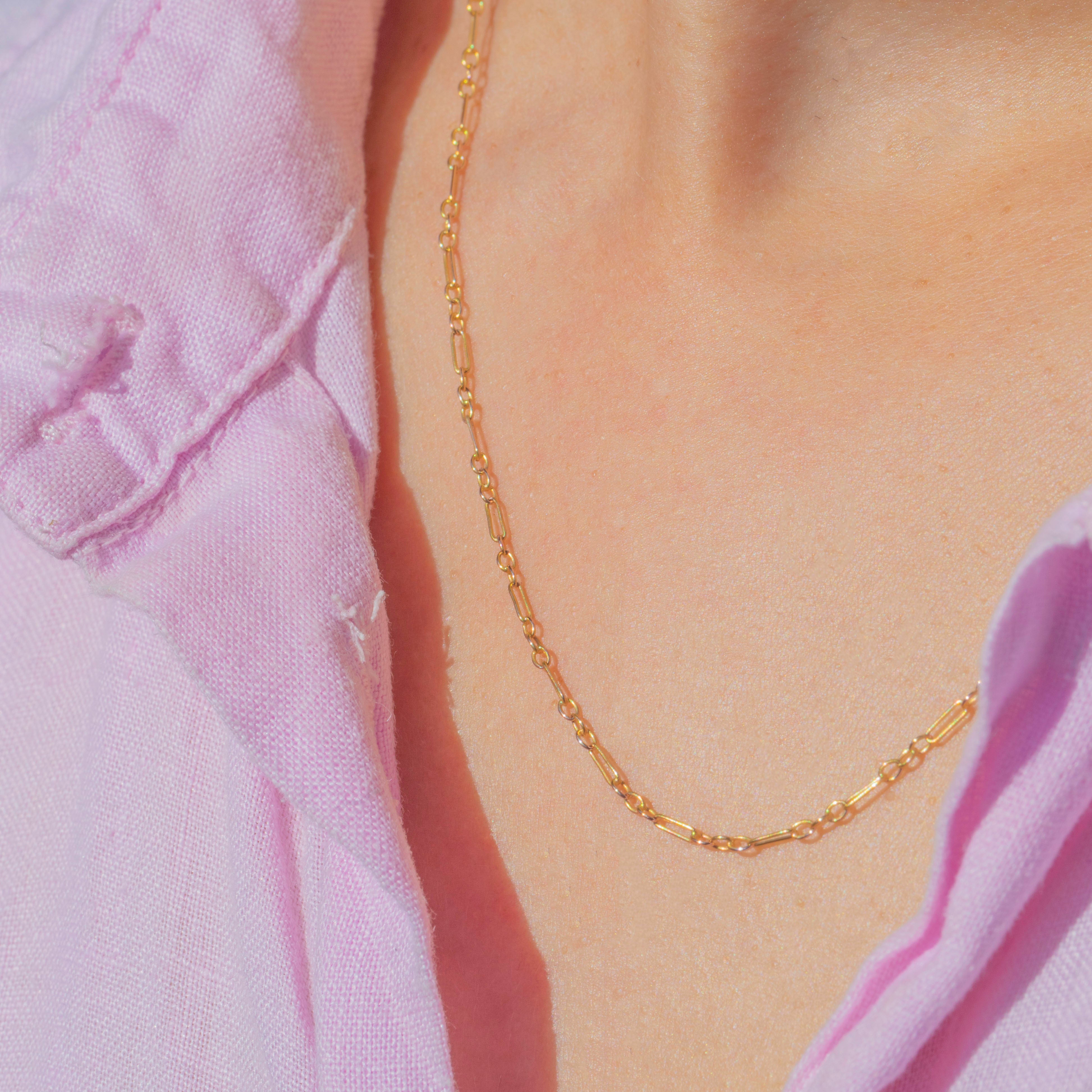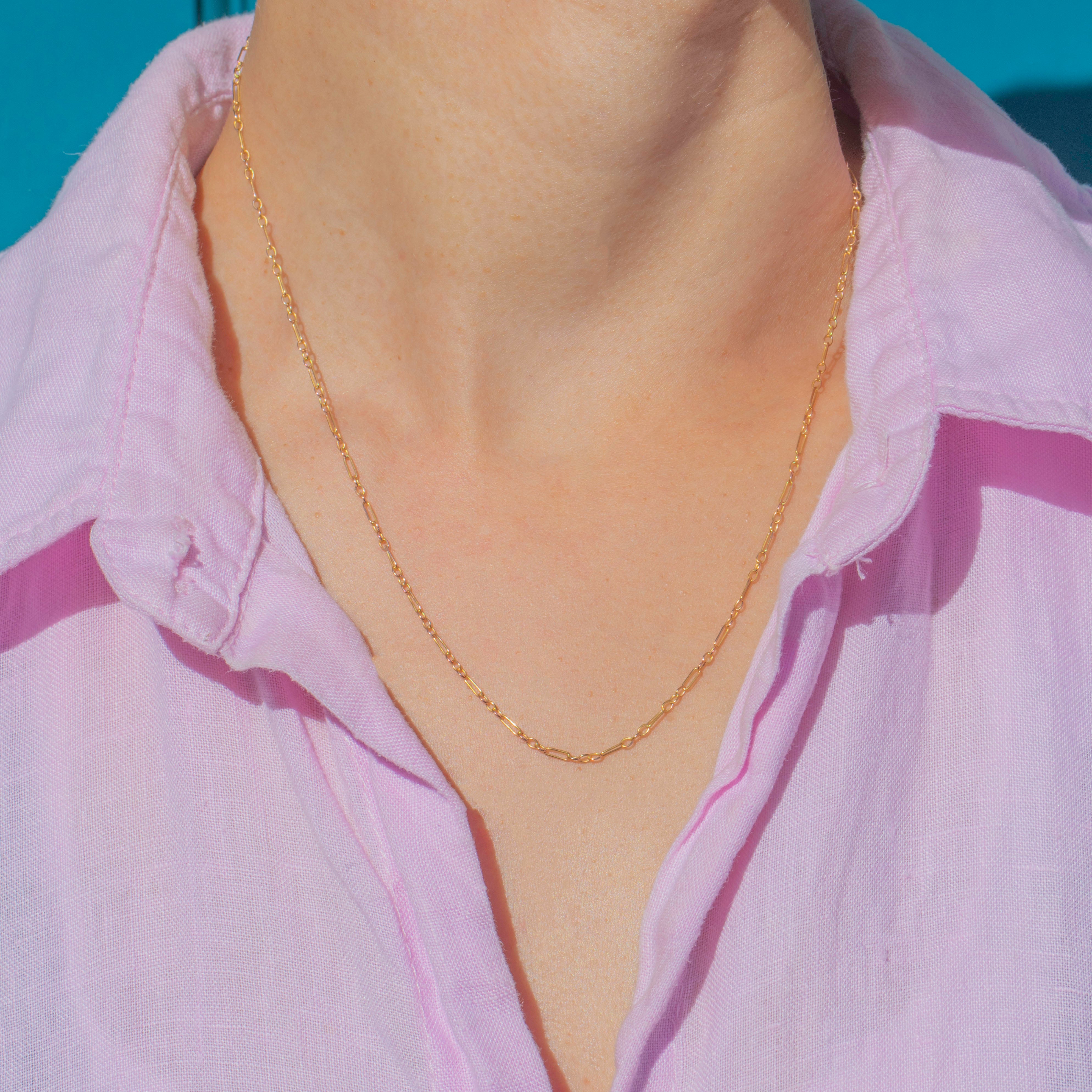 This dainty Victorian chain is crafted in 9ct Gold with slender paperclip links, each elongated and refined. Its delicate silhouette makes it a versatile chain, perfect for wearing alone for a subtle golden touch!