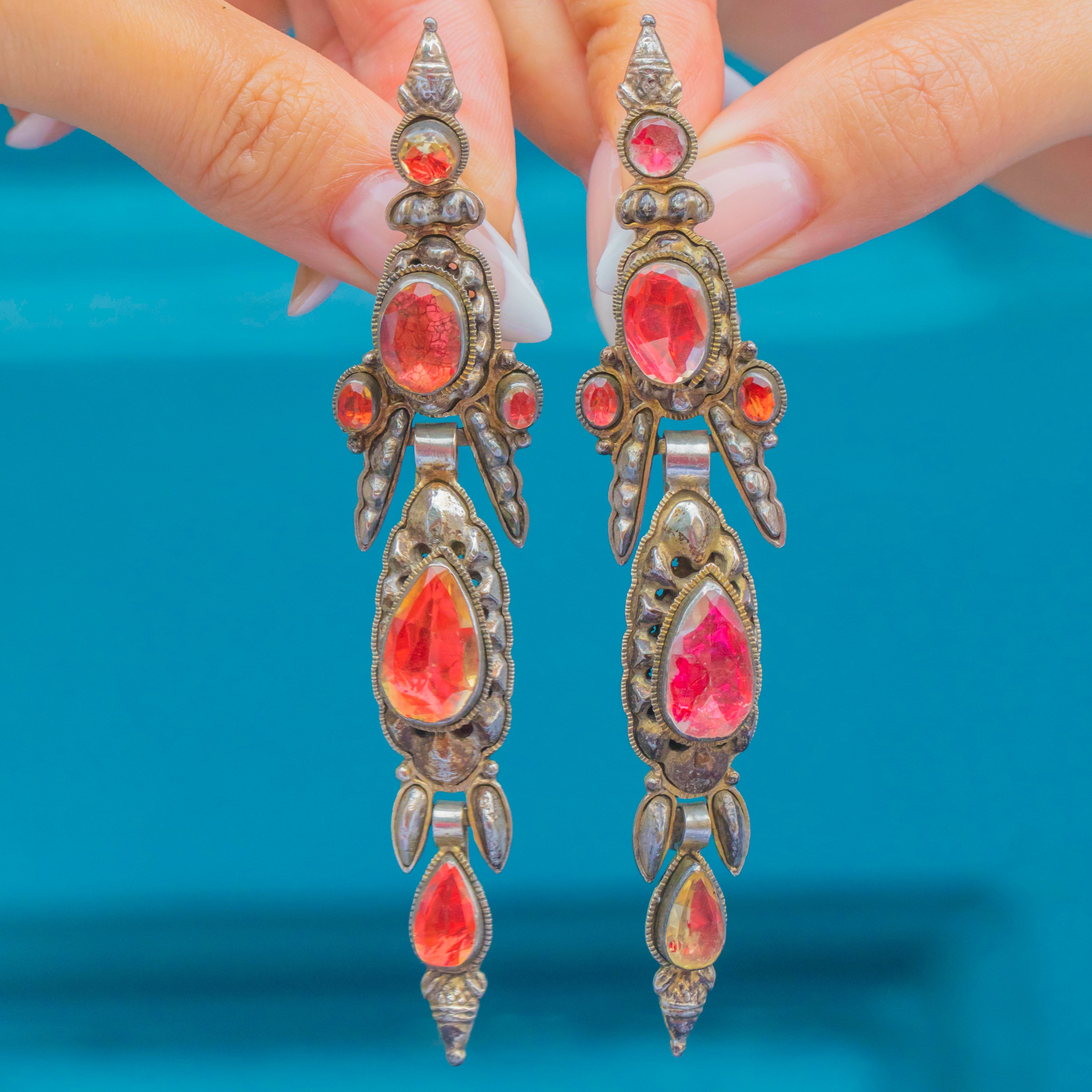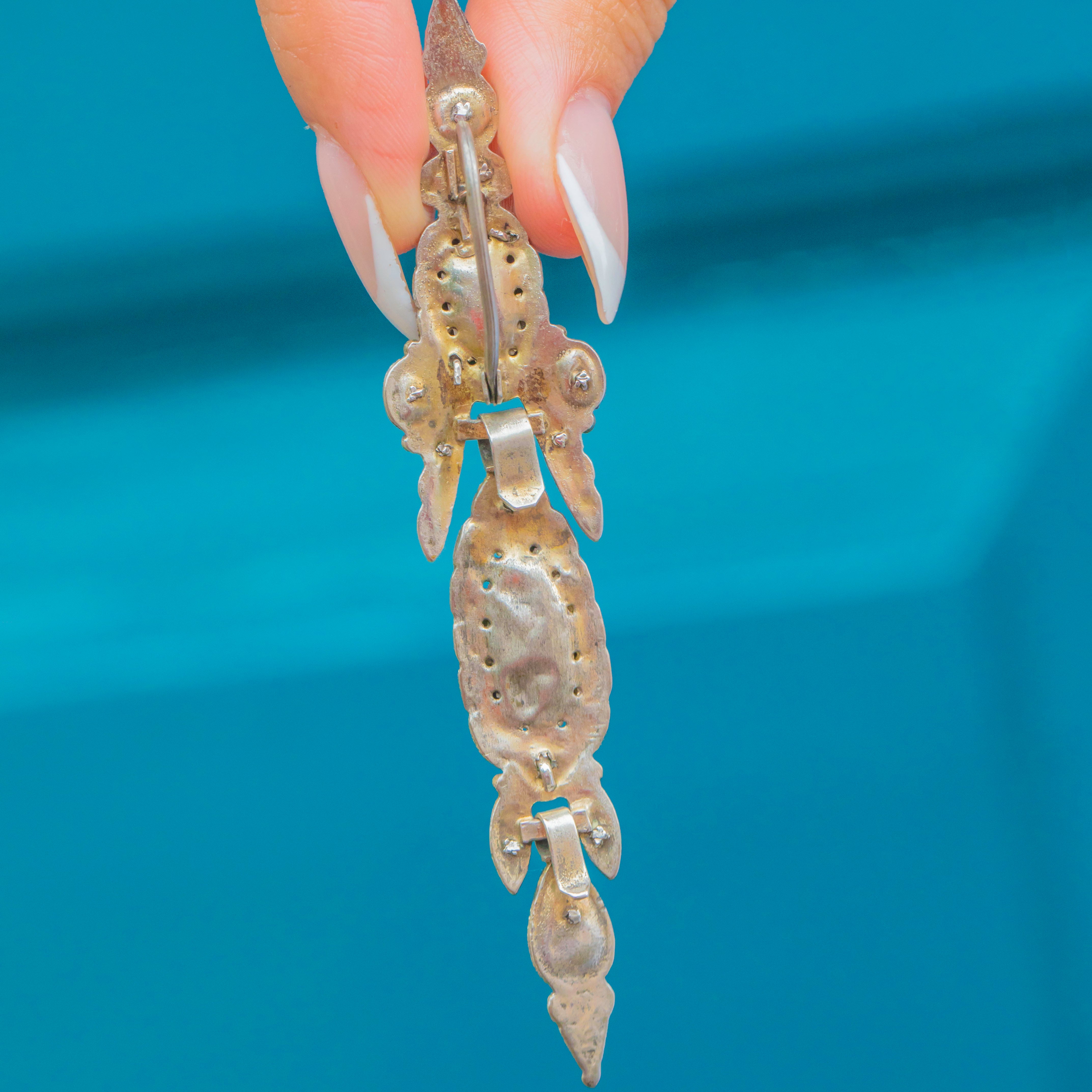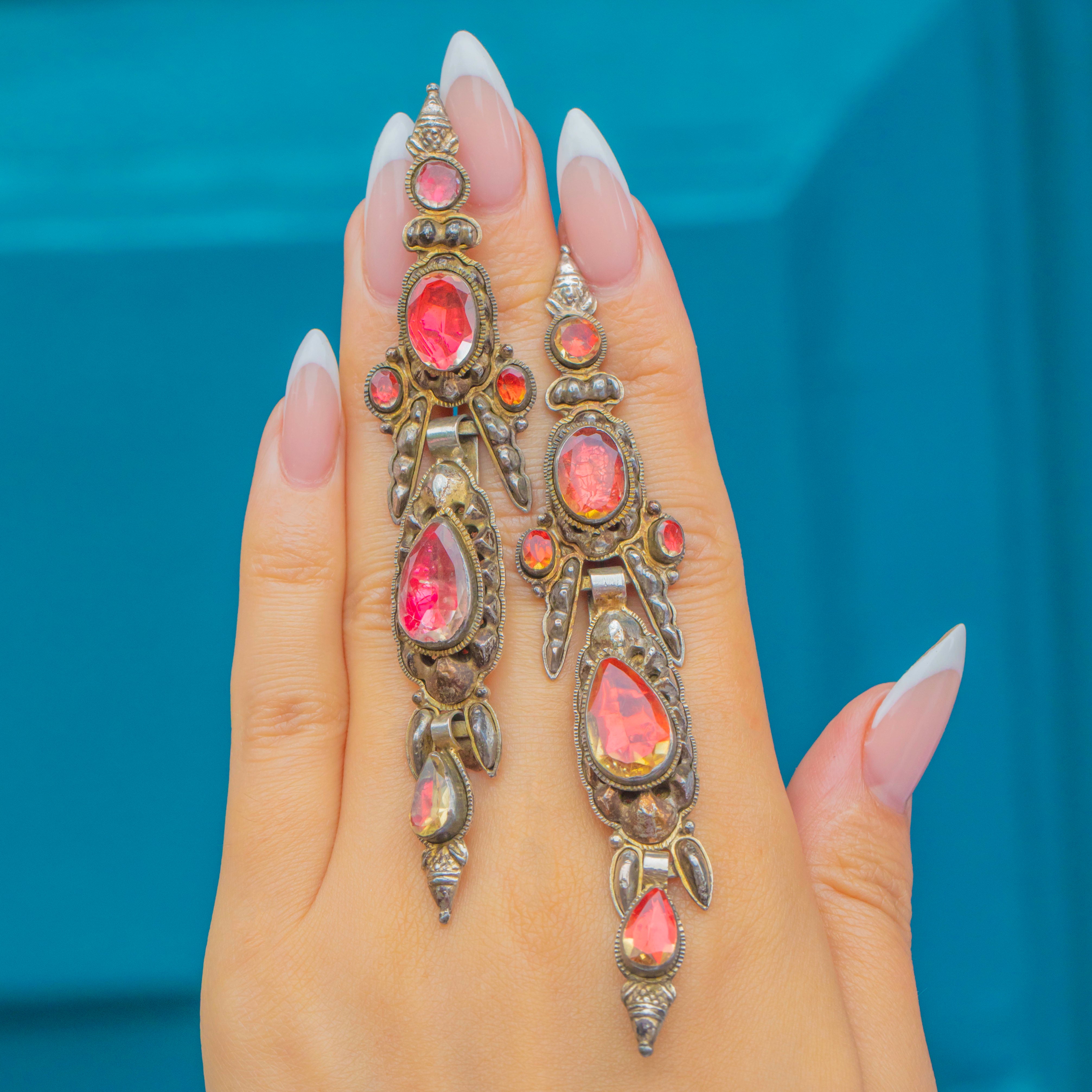 These magnificent early Iberian earrings from the 1700s are a true collector’s treasure. Crafted in Silver and set with vibrant foiled Citrines, they showcase the opulence and elegance of 18th-century jewellery. Their elongated silhouettes were designed to dazzle, catching the light beautifully with every movement.