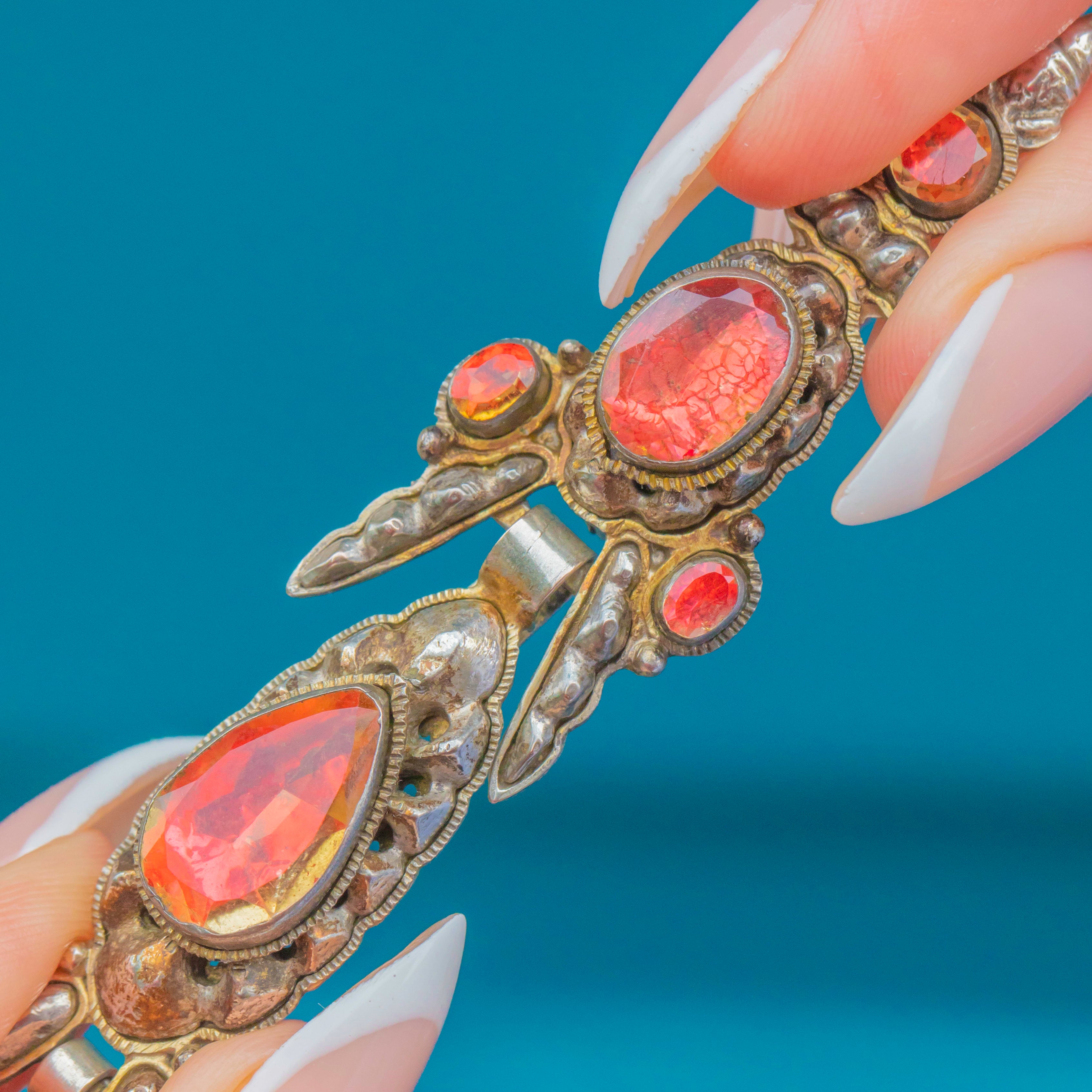 The Citrines, ranging from 5mm to 13mm, glow with fiery orange and golden tones thanks to their original foiled backs. The intricate Silver settings are richly detailed, framing the gemstones with ornate repoussé and granulation work, creating a striking contrast between the cool metal and the warm sparkle of the stones.