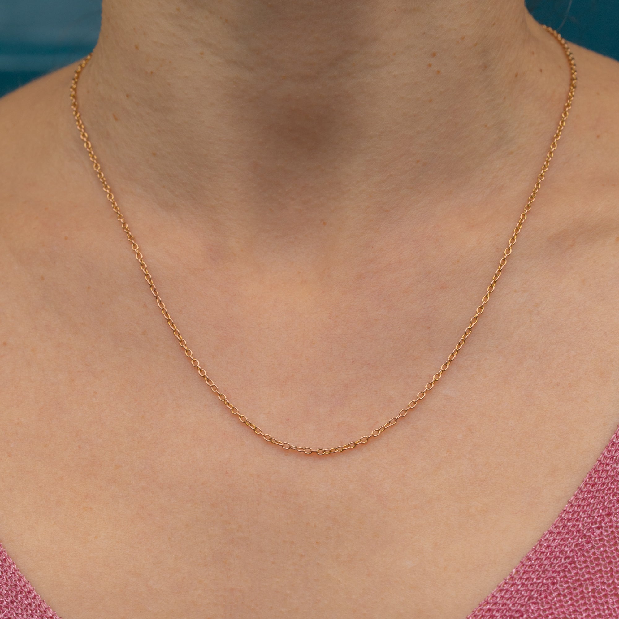 EXCELLENT. This antique 9ct Gold skinny chain is in excellent condition. Her saturated yellow Gold links are uniform and secure, flowing effortlessly across your collarbones. Paired with a secure barrel clasp, this skinny Victorian chain is the perfect item for suspending charms and allows for confident wear.